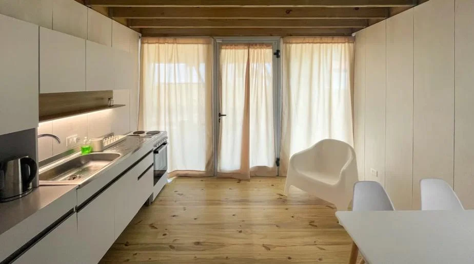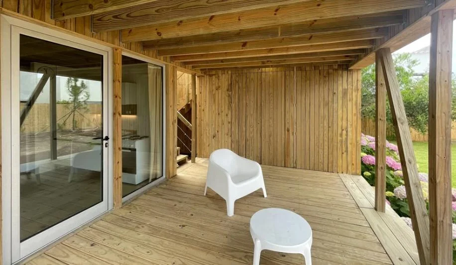 Each features 1 bedroom, full bathroom, kitchenette, living-dining area, and gallery with forest or garden views.