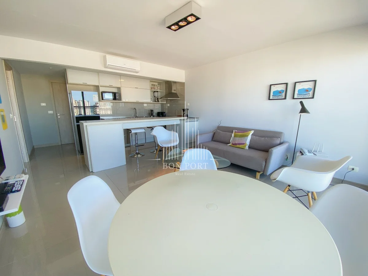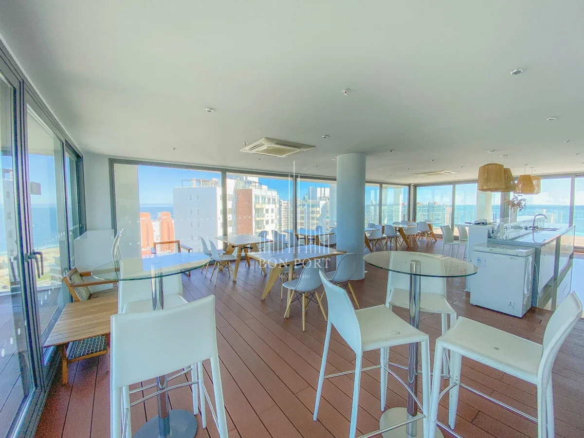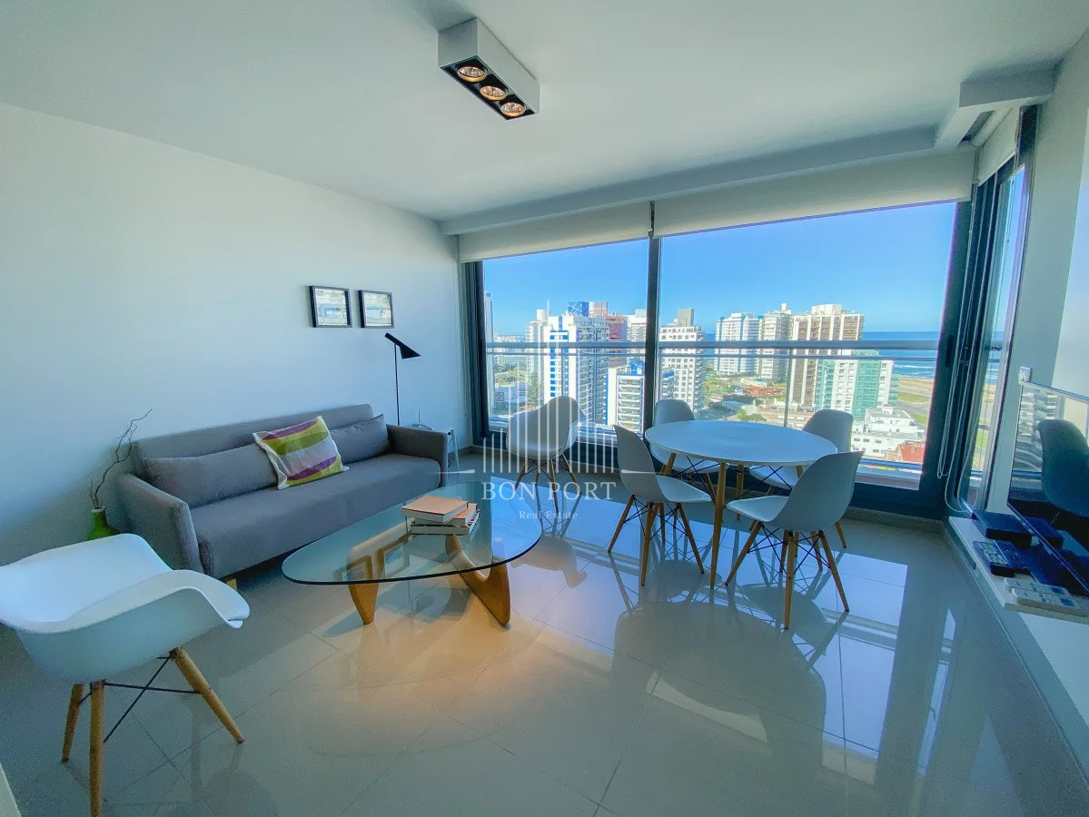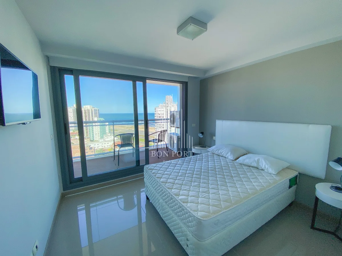 Hermosas vistas al Océano desde este piso alto a pasitos del mar. Amplio departamento con living-comedor, cocina integrada, terraza, dormitorio con vestidor, baño completo más toilette. Garage en subsuelo. Edificio con amenities de primer nivel, se destaca por su piscina infinita en el piso 16 con vista a la Mansa.