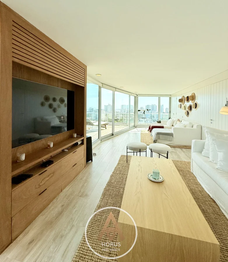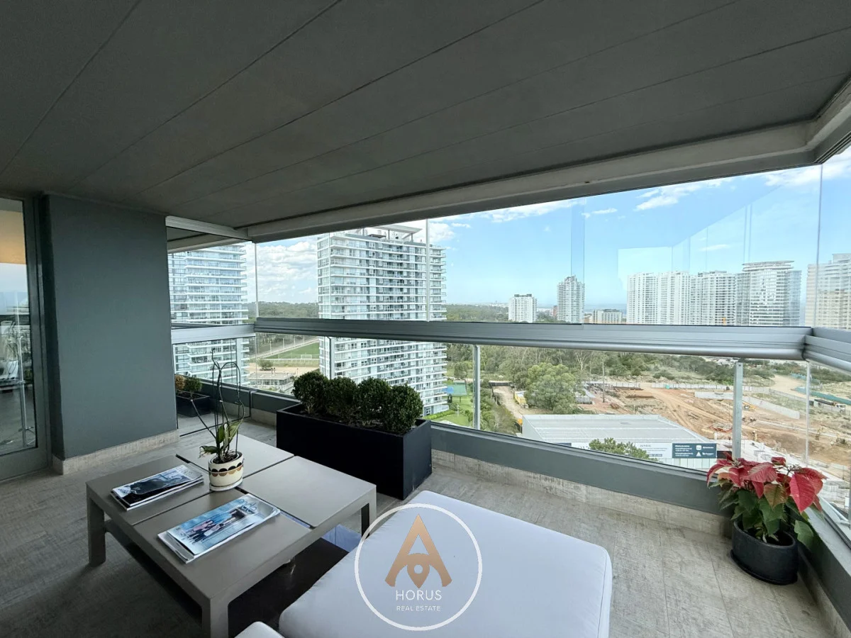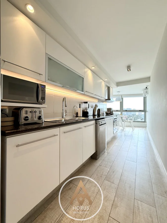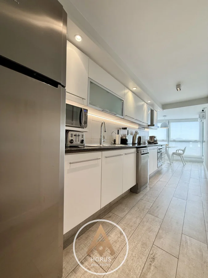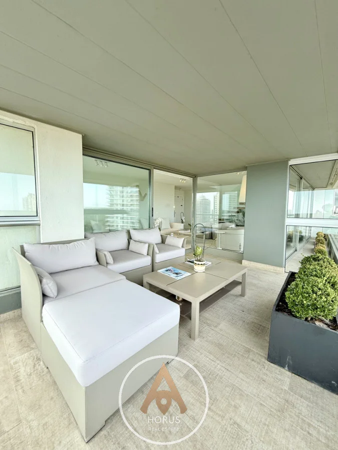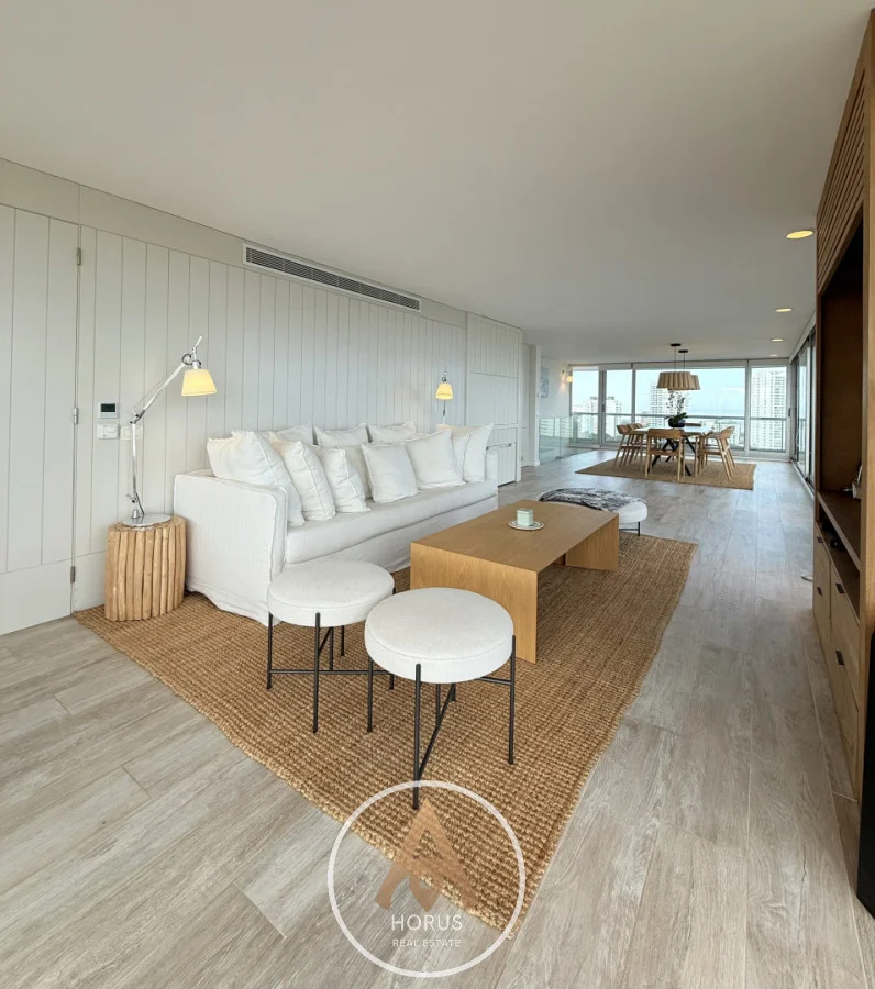Área Social: Un espacioso living-comedor se abre hacia una terraza equipada con cerramiento plegable de alta tecnología, permitiendo integrar el exterior durante todo el año. La cocina, de diseño definido, cuenta con un elegante desayunador y área de servicio completa.