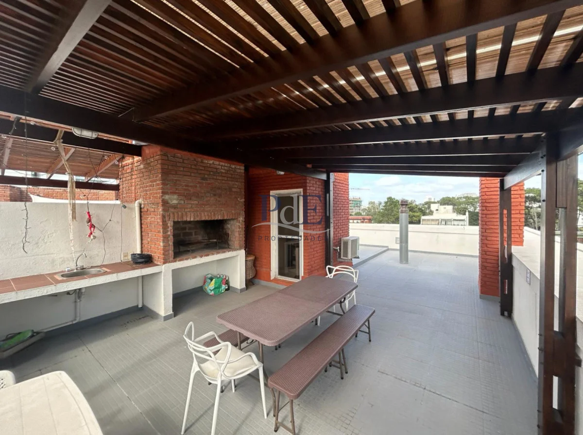 cuenta con tres dormitorios, dos baños, cocina con barra, living comedor con estufa de alto rendimiento, amplia terraza, azotea con barbacoa completa de uso exclusivo de la unidad, excelente vista y muy luminoso, garaje, ascensor, recepción 24hs con video vigilancia