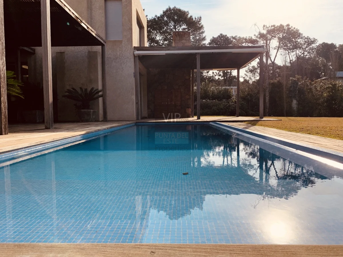 Excepcional casa ubicada dentro del club privado de Laguna Blanca, sobre laguna diseño del Arq Marcelo Daglio, orientada al norte, hace de su hermoso jardín con piscina, un lugar inmejorable.