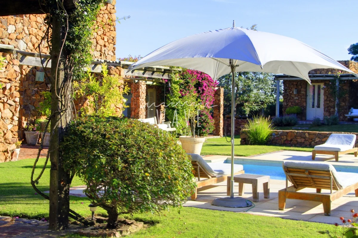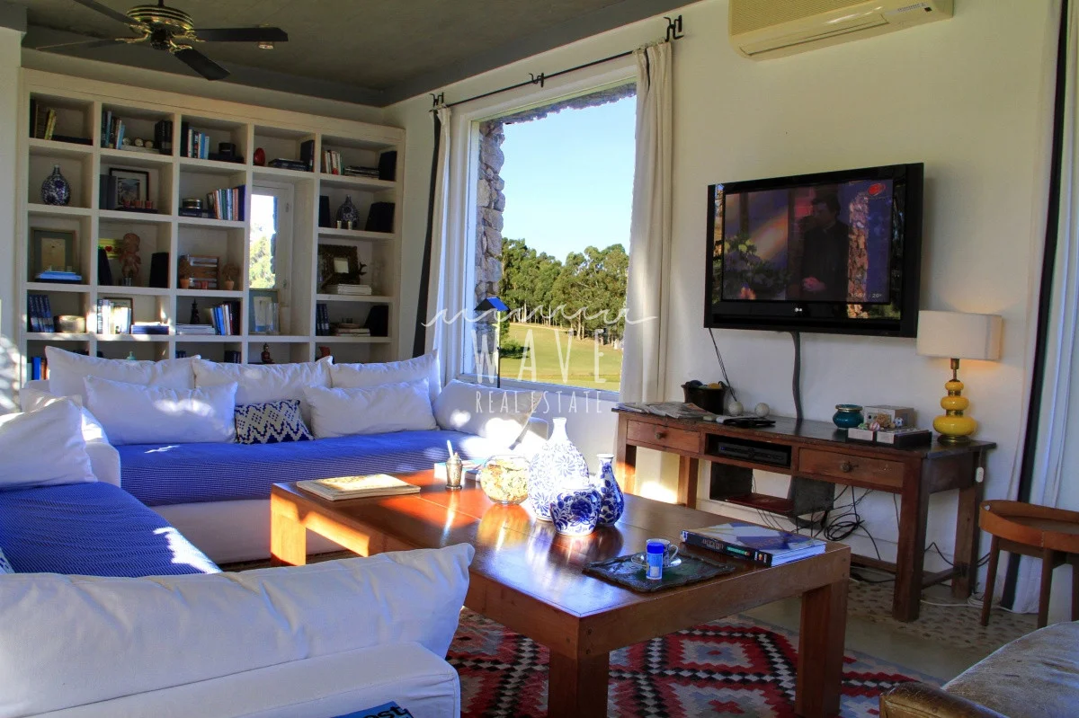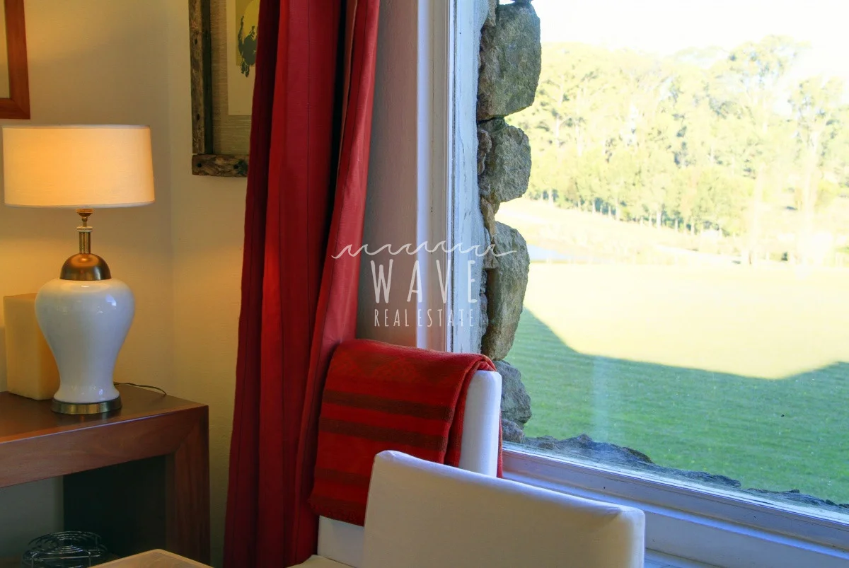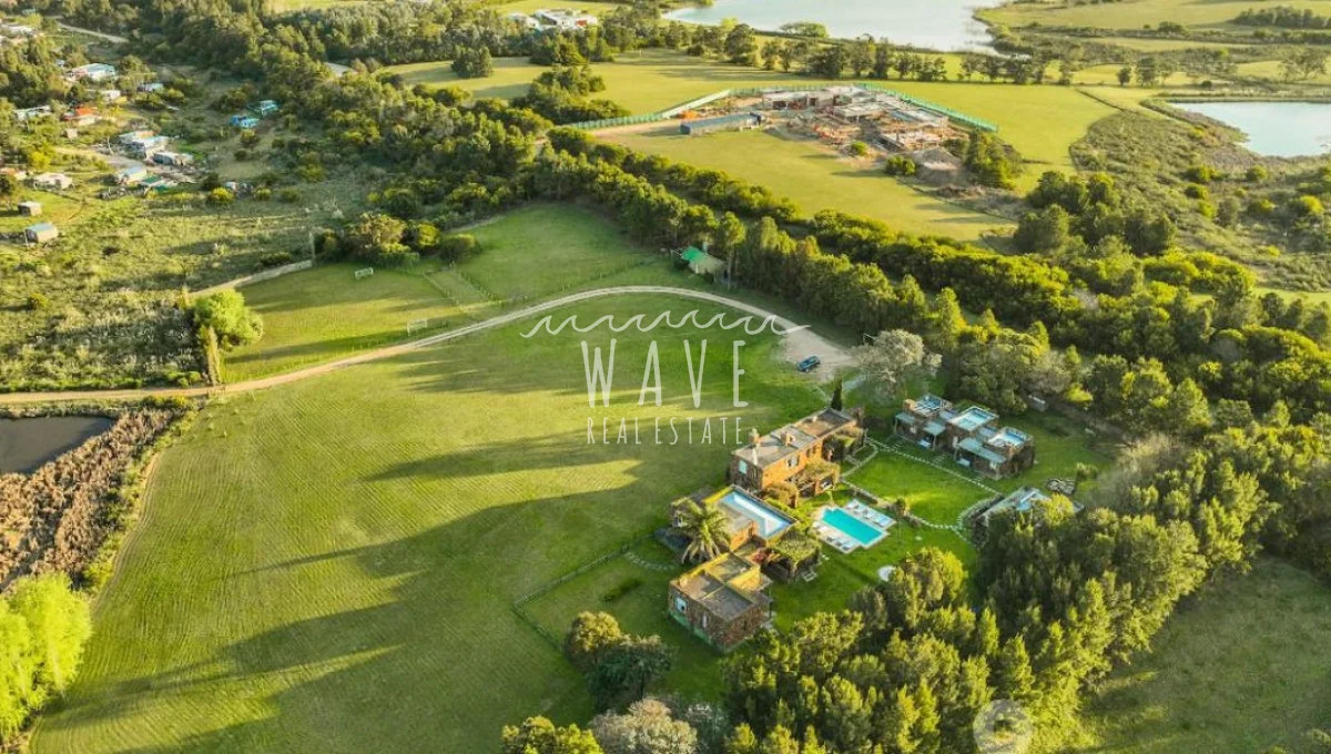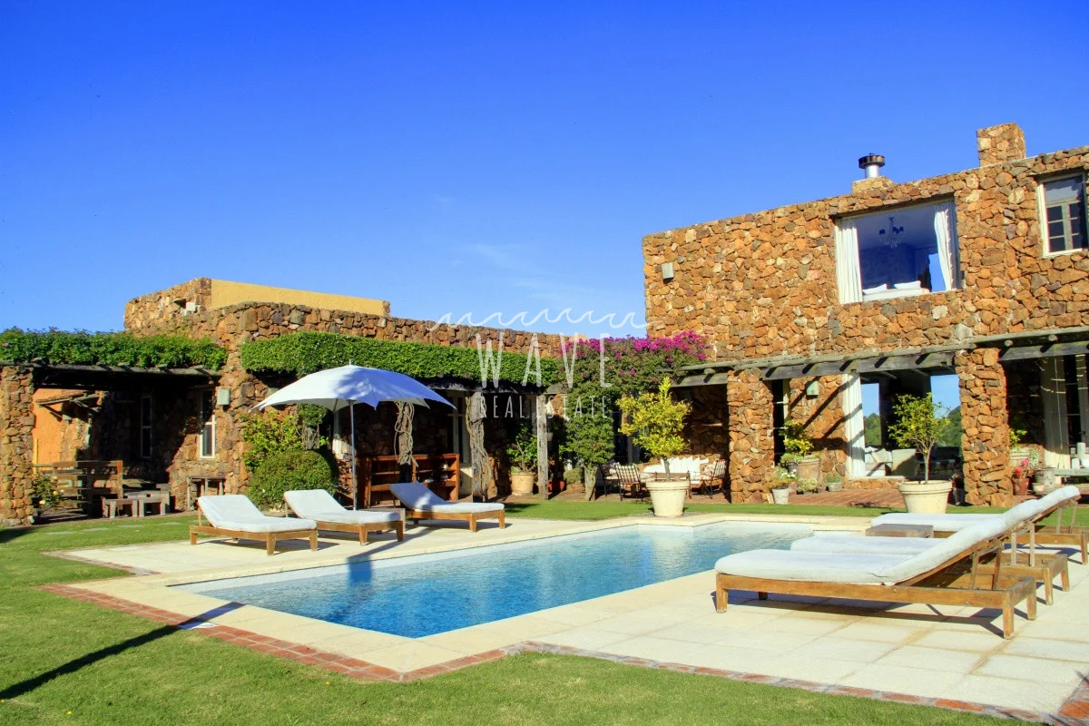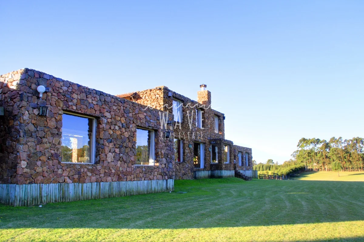 A unos 5 kilómetros del mar de espectacular construcción en piedra ,en un entorno armónico con la combinación del campo y la brisa del mar. Casa en Modulo emplazada sobre un lote de 5 hectáreas, con 8 dormitorios y 7 baños más toilette, de los cuales 6 dormitorios son en suite, living, comedor, playroom, cocina con office bien equipada, con salida directa a una terraza cerrada ideal para días de lluvia. La casa principal que tiene dentro 2 dormitorios con 1 baño y toilette, se ve rodeada de una galería con sillones, rodeada por alegrías, azaleas y jazmines, luego esta el parrillero y la piscina climatizada. El resto de los dormitorios se ven divididos en 2 bloques de 3 suites el primero y 2 suites el segundo. Detrás de este último bloque tenemos el lavadero, donde hay freezers de refuerzo para el verano. La chacra tiene un tajamar muy pintoresco y un asador al aire libre. Cada suite tiene su conexión direct tv. y su tv.-
