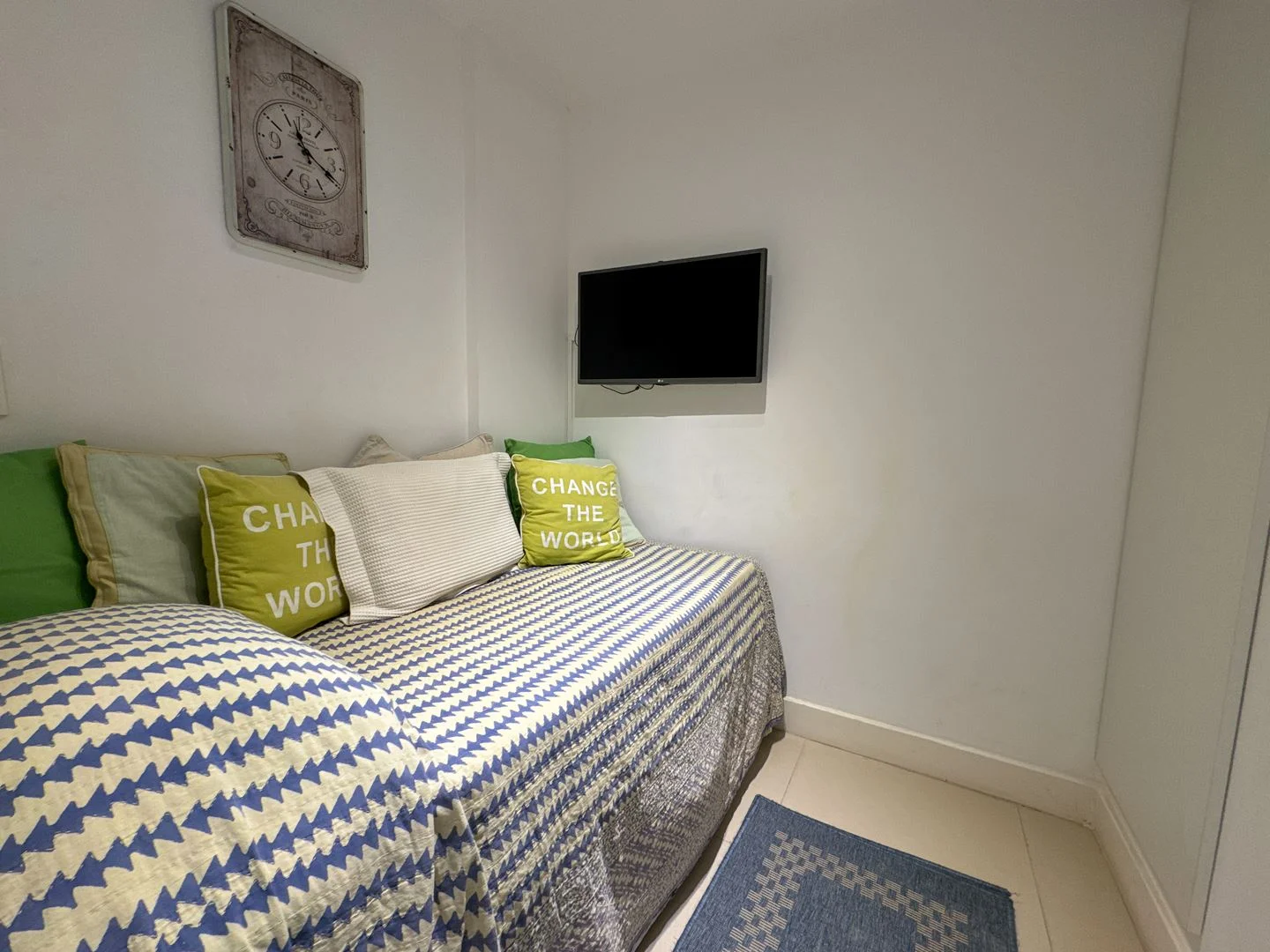 El apartamento cuenta con un dormitorio principal definido, orientado hacia el frente, acompañado de un amplio baño. Además, ofrece un medio dormitorio que puede adaptarse para diversas utilidades, como un espacio para un cómodo escritorio de home office.