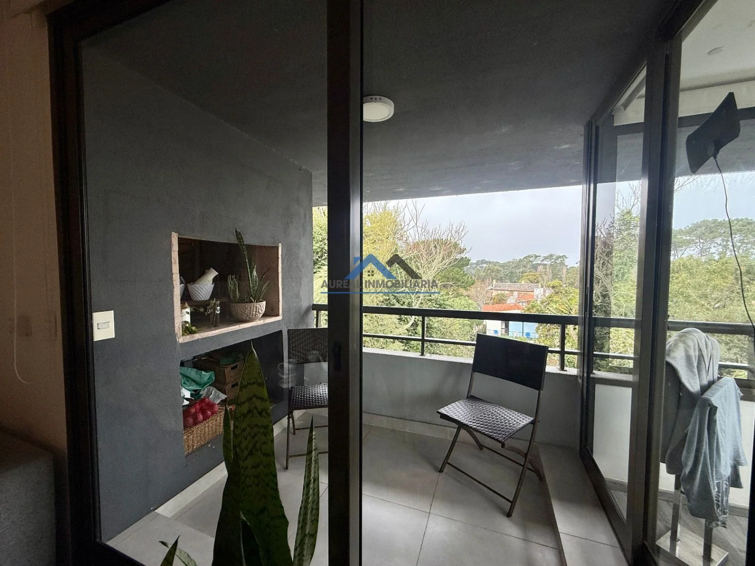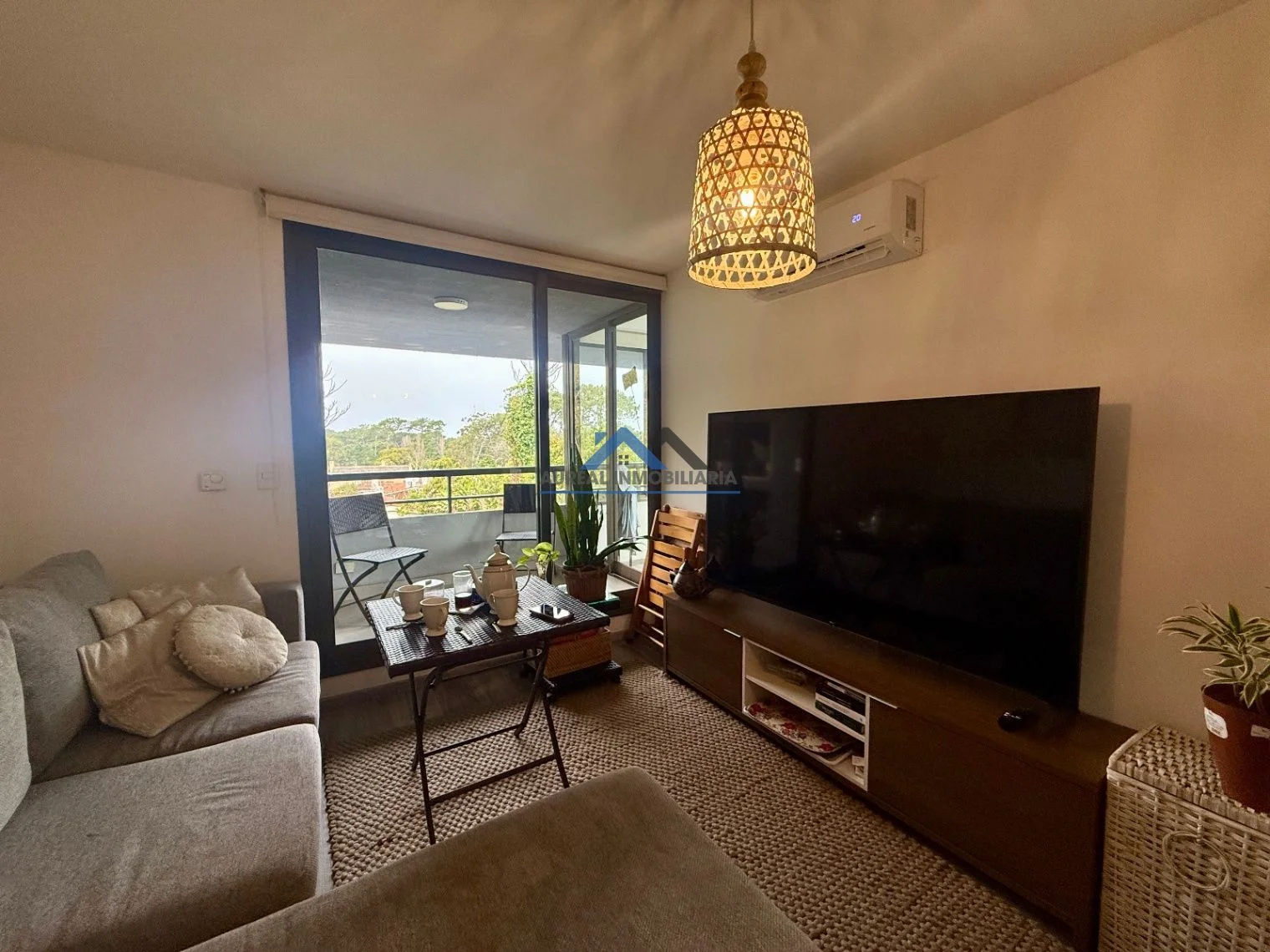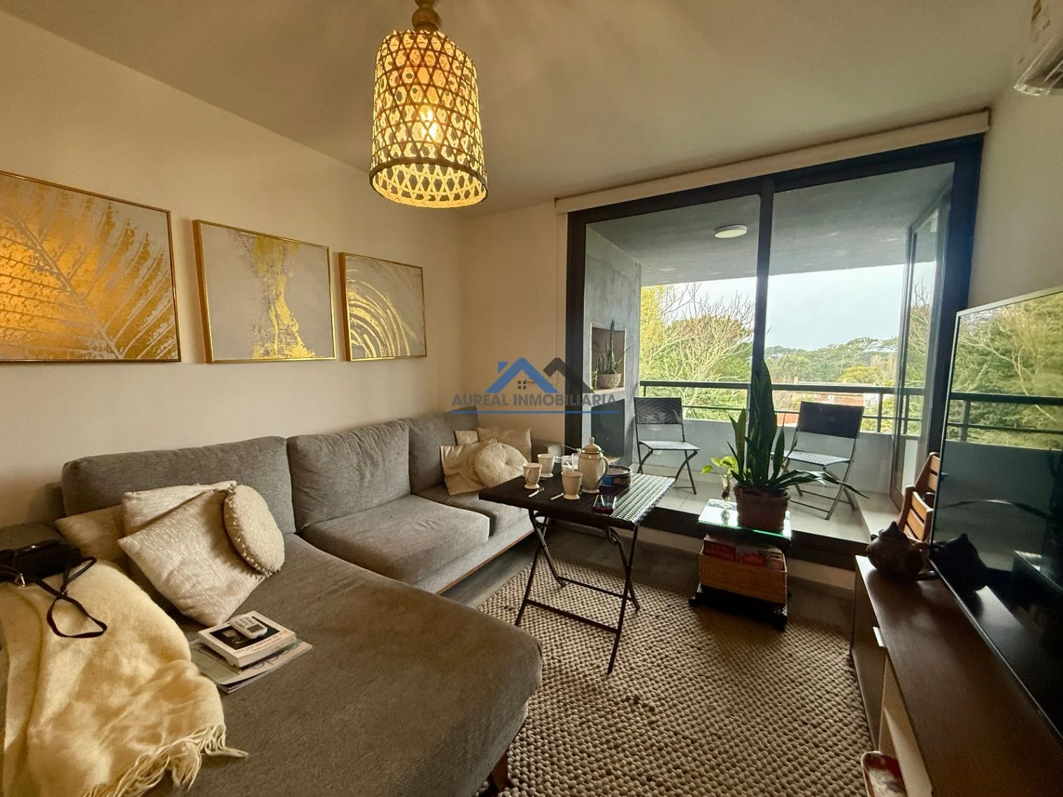 El apartamento cuenta con una disposición contrafrente y una orientación sur que asegura luminosidad y confort. Con una antigüedad de solo 5 años, ofrece un diseño moderno y funcional que incluye un ambiente principal con un acogedor living-comedor, una cocina equipada, un baño y un balcón con parrillero que invita a disfrutar del aire libre. La propiedad está equipada con todas las comodidades necesarias, tales como aire acondicionado, cámaras CCTV, además de contar con servicios de seguridad y una amplia gama de amenities como piscina exterior y climatizada, gimnasio, sauna, y sala de juegos, todo en un entorno arbolado y con áreas verdes bien mantenidas.