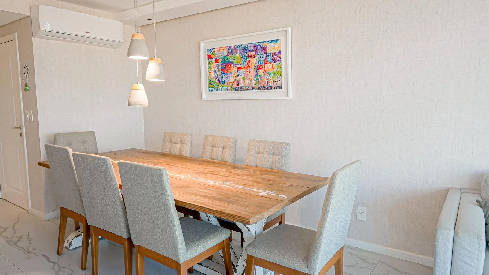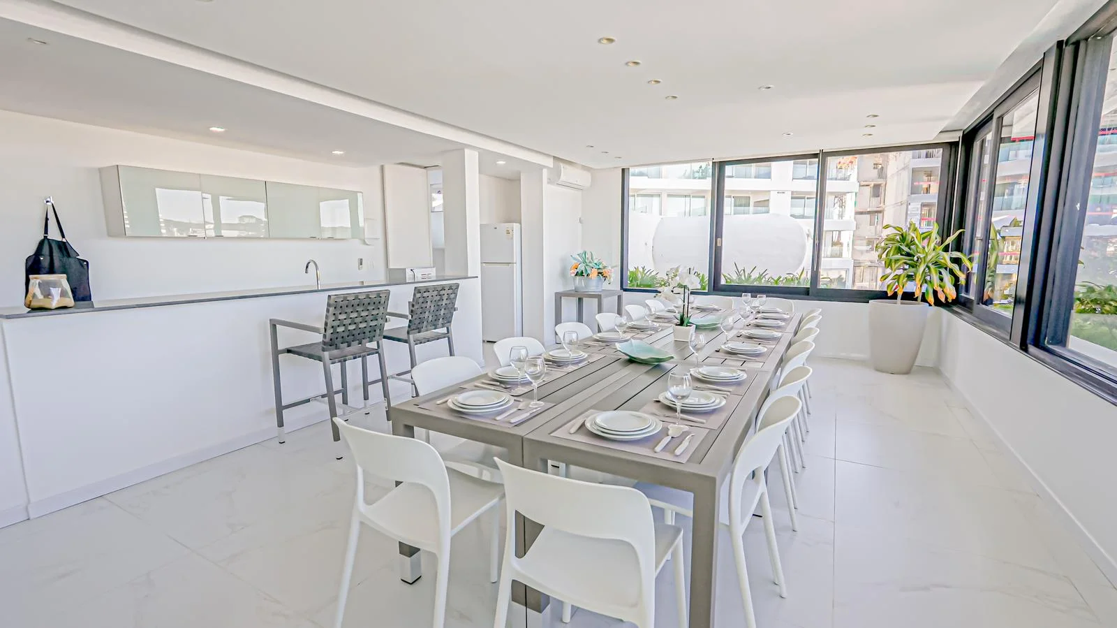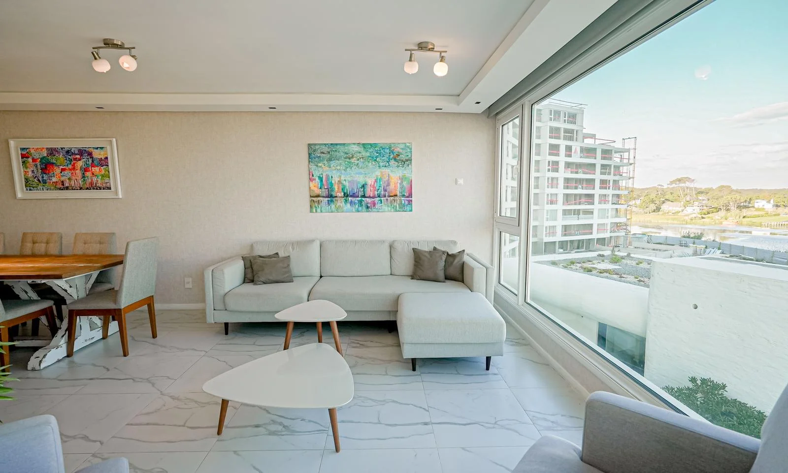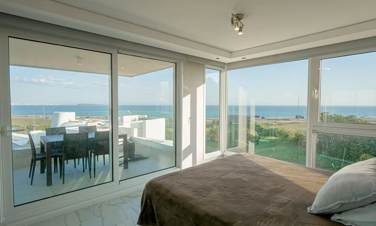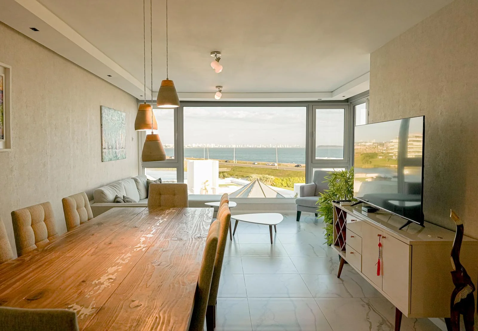 Área Social: Amplio salón-comedor con grandes ventanales que conectan a un balcón principal con vista directa al mar .