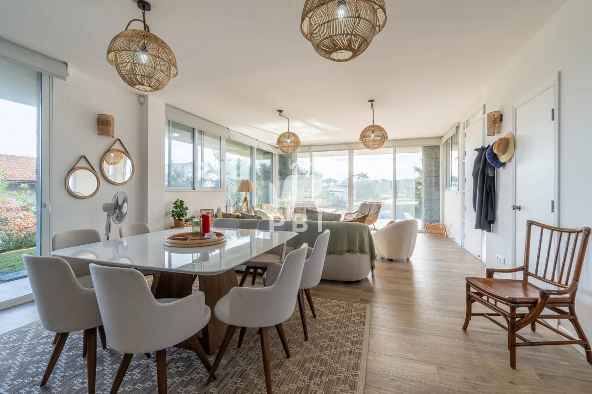 Amplio living comedor de estilo moderno y minimalista que conecta de manera fluida al balcón terraza donde podrá disfrutar de panorámicas vistas del mar así como de la piscina y el parrillero, ideal para cenas en familia.