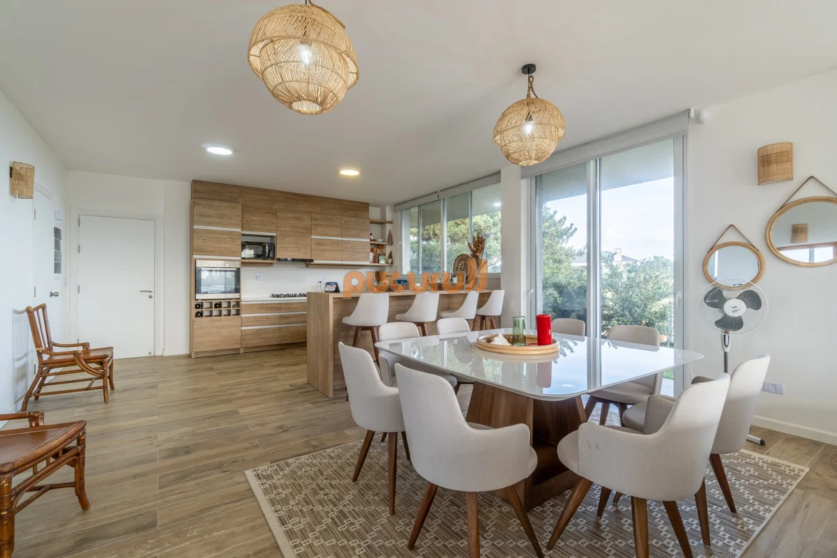 Amplio living comedor de estilo moderno y minimalista que conecta de manera fluida al balcón terraza donde podrá disfrutar de panorámicas vistas del mar así como de la piscina y el parrillero, ideal para cenas en familia.