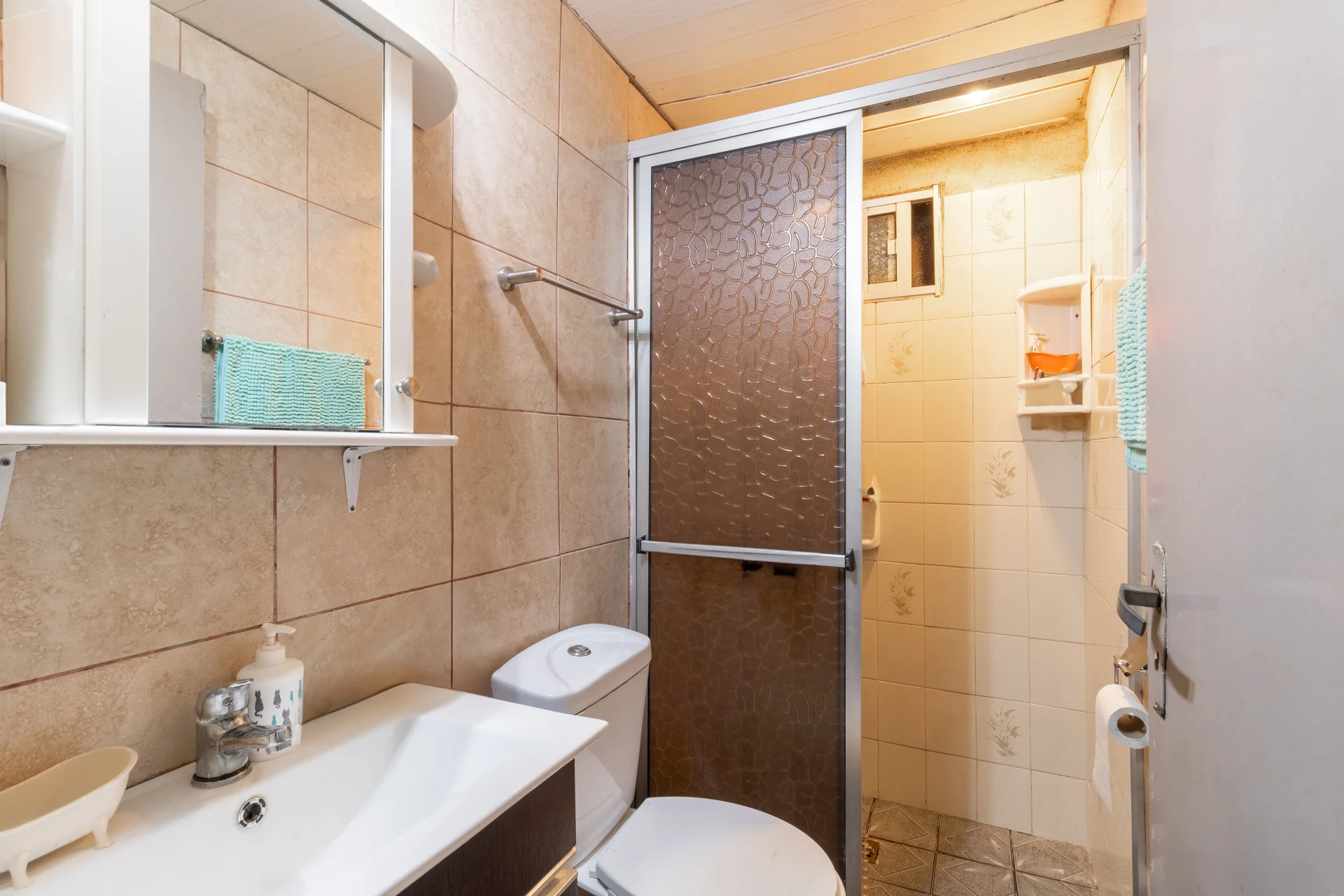 El baño es completo, con revestimiento cerámico, lavamanos con mueble y espejo, ducha con mampara, inodoro y bidet. Buena iluminación natural por ventana.