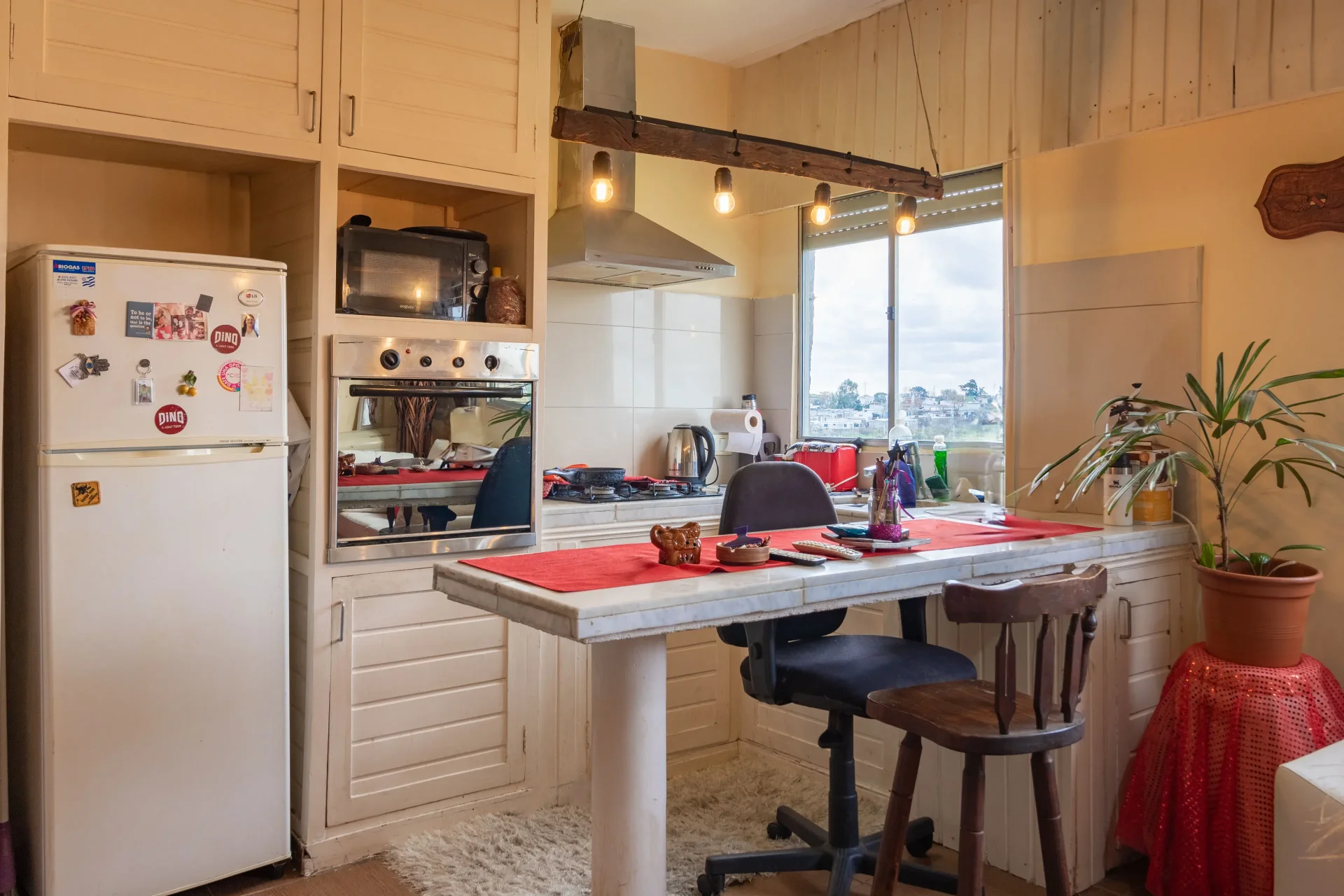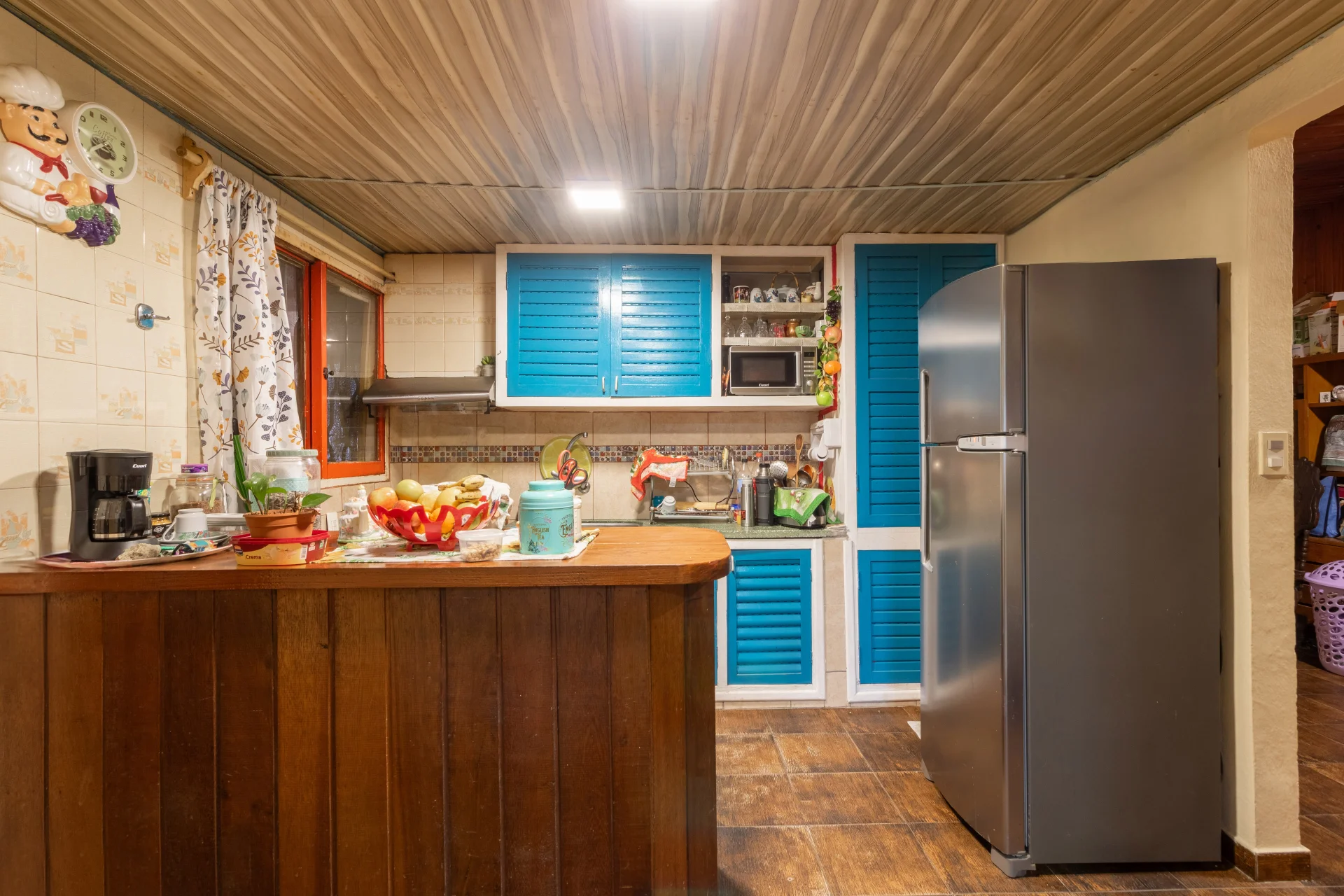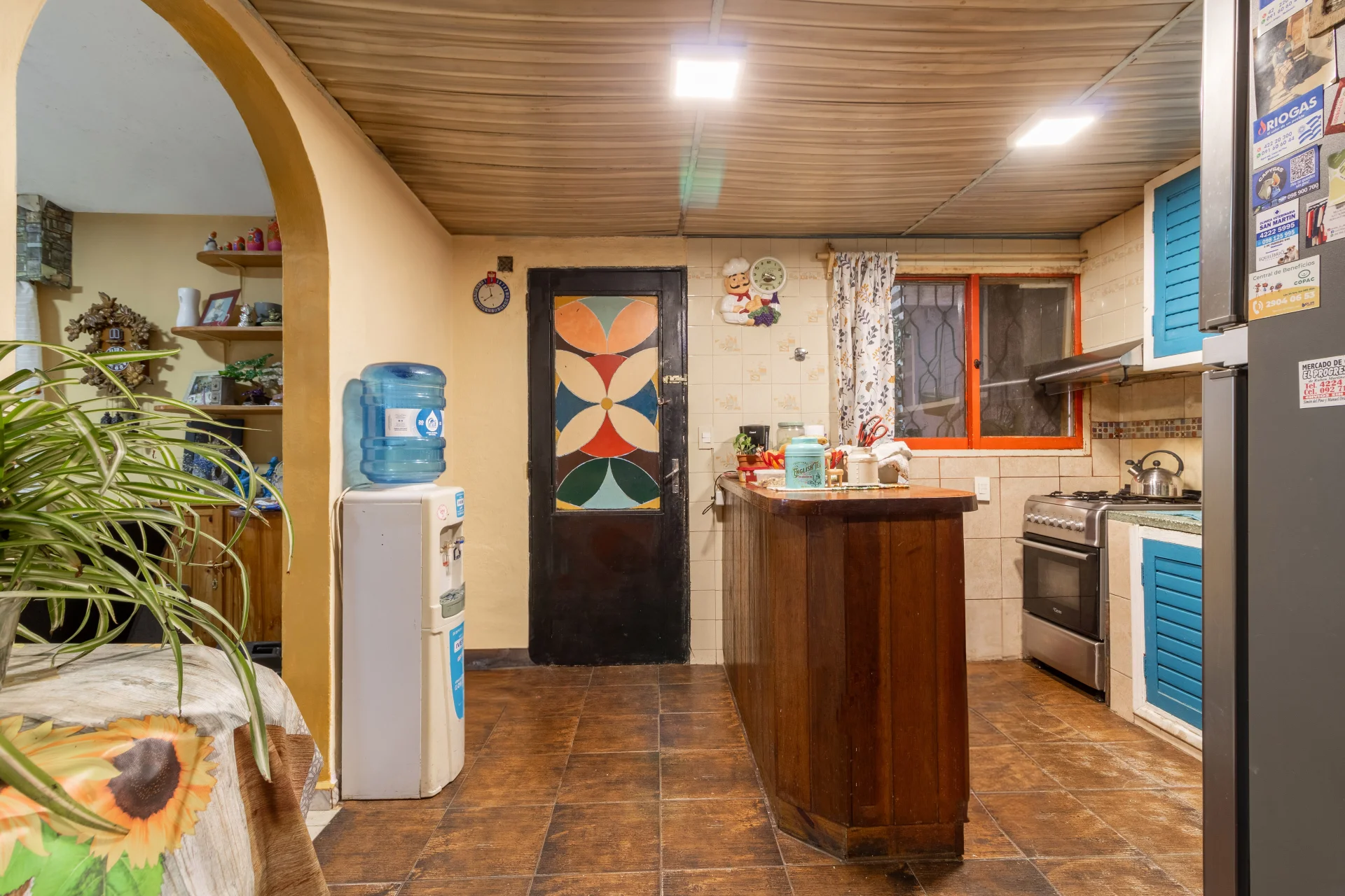 La cocina es definida, con barra, muebles bajo mesada y aéreos, grifería monocomando y ventilación natural. Se conecta con el lavadero y un espacio de almacenamiento adicional.