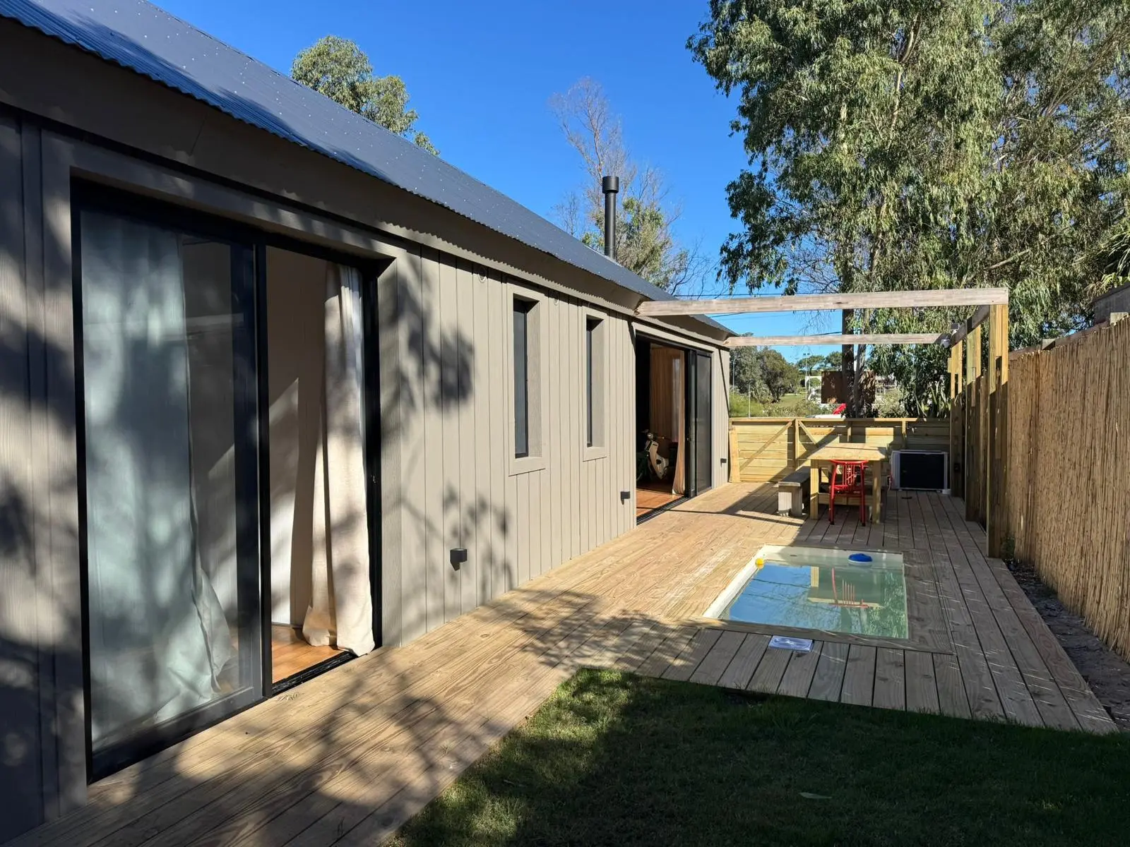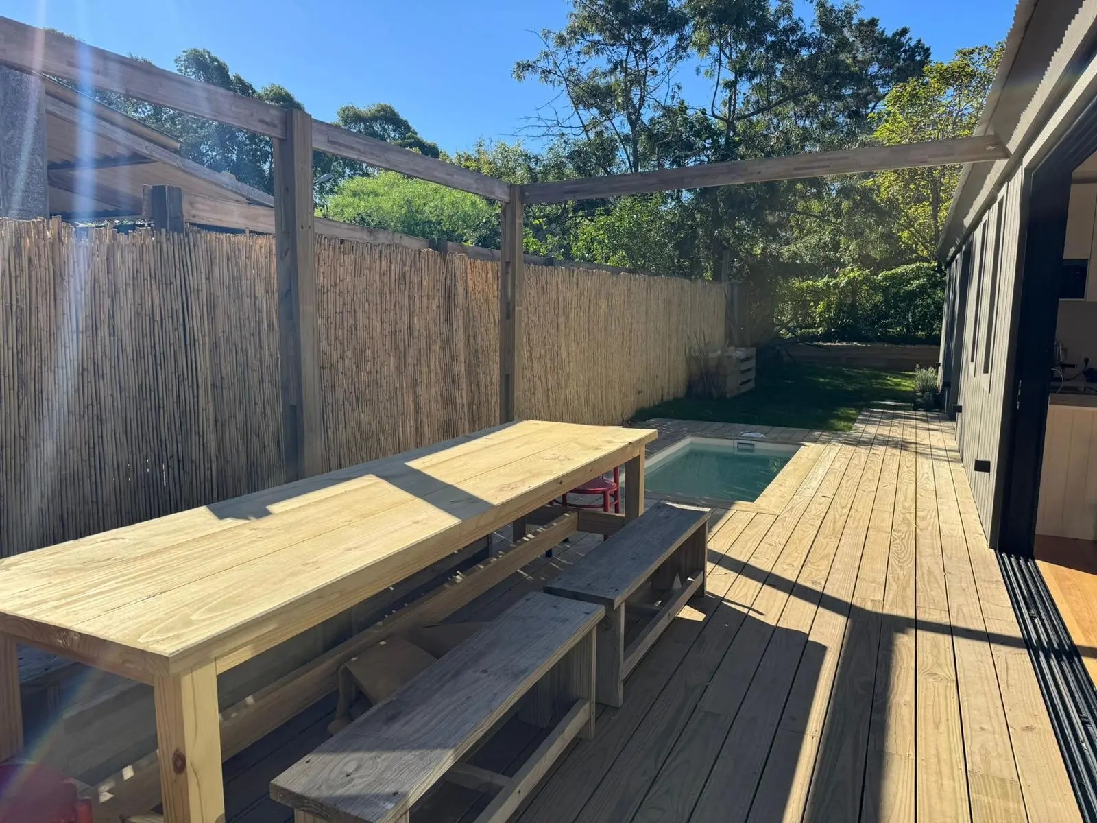 Grandes ventanales que integran a deck con pérgola, parrillero y pequeña piscina con bomba calor.