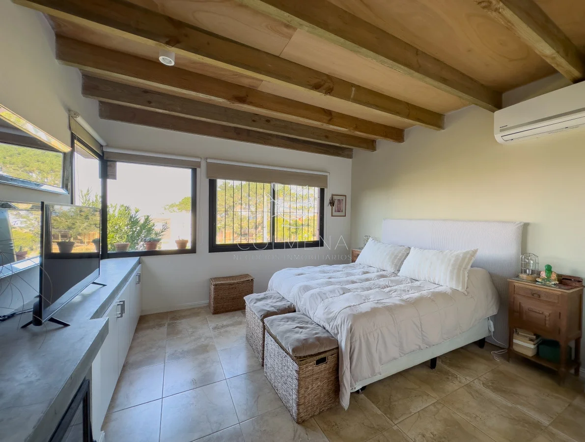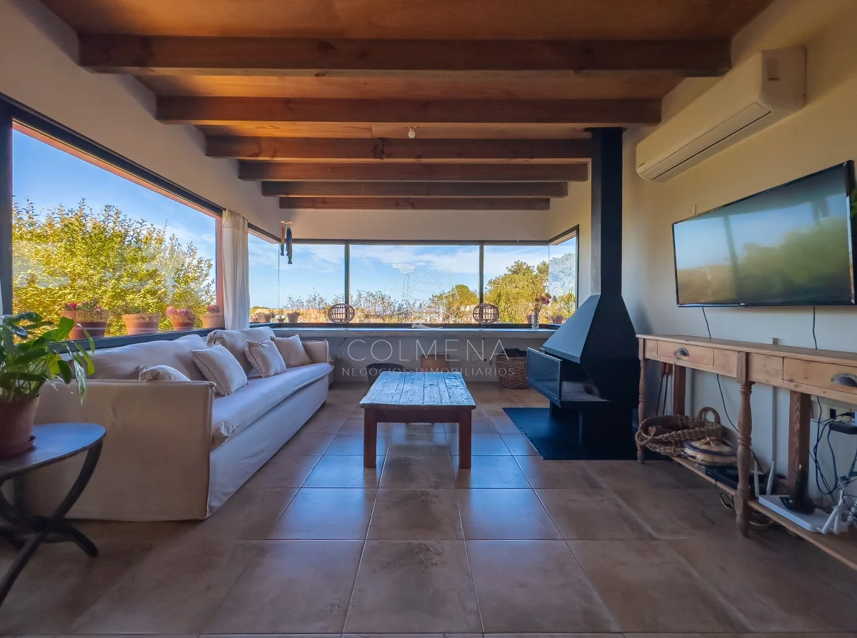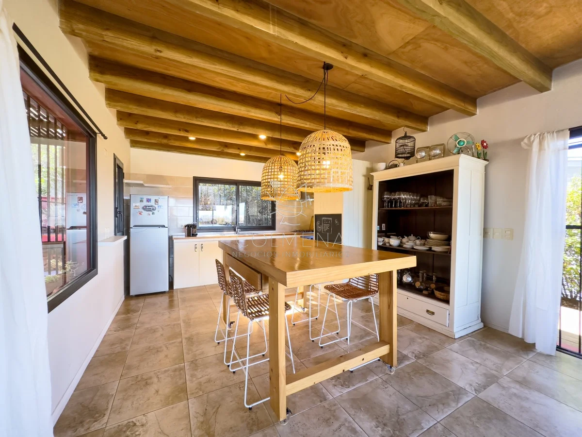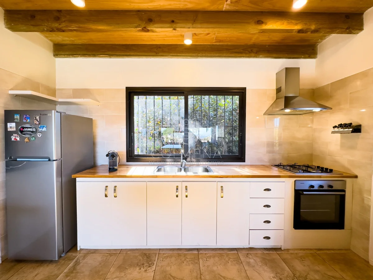 Living comedor con cocina integrada (40 m2) con estufa a leña, 2 dormitorios (principal con estufa a leña), 1 Baño completo, parrillero, estacionamiento techado