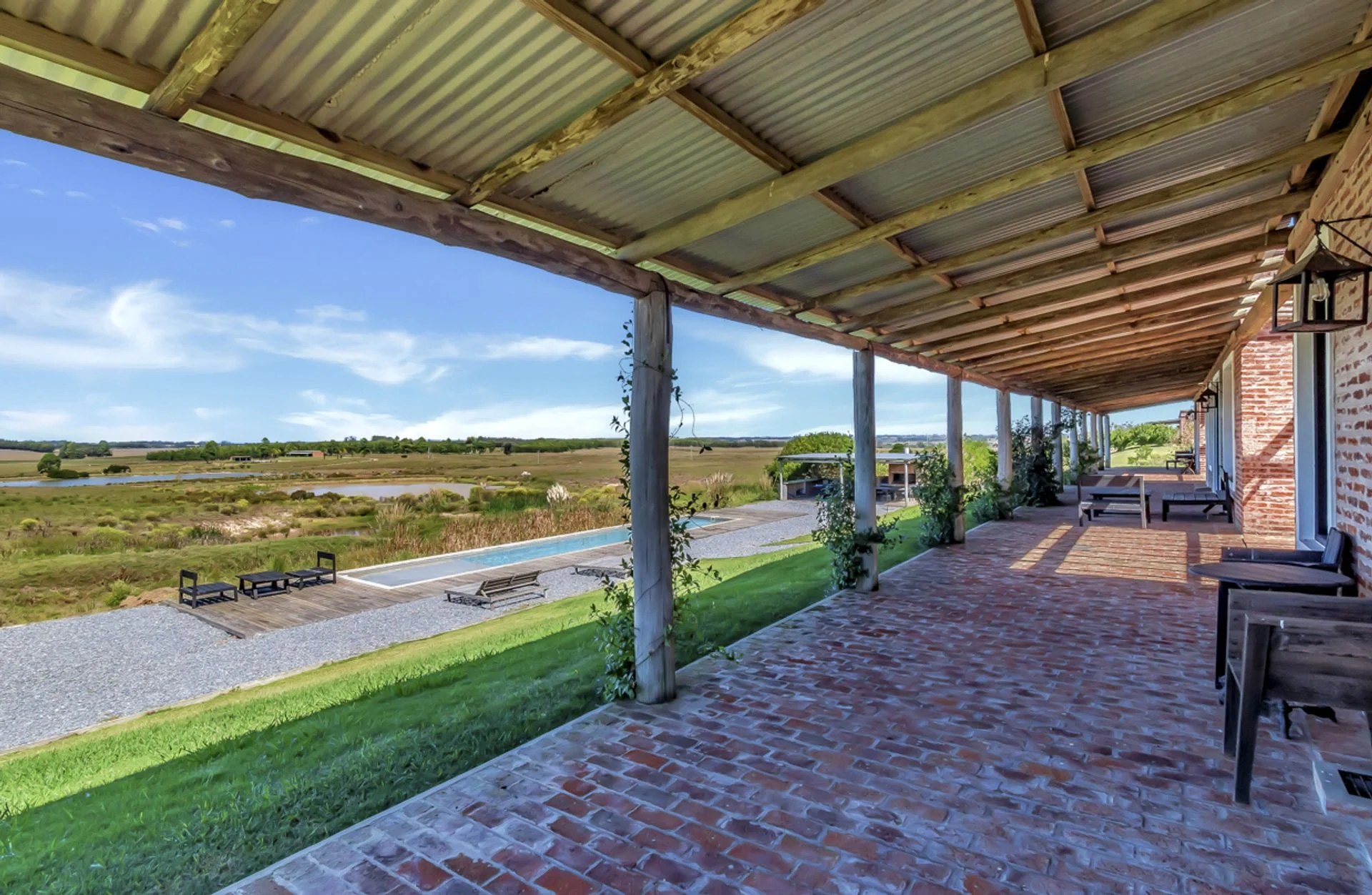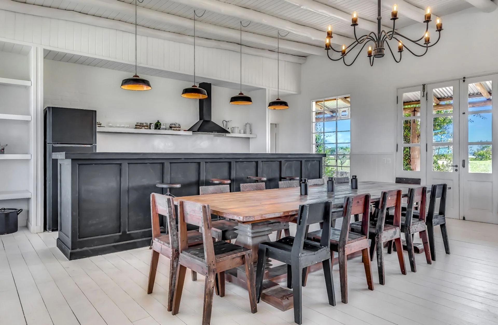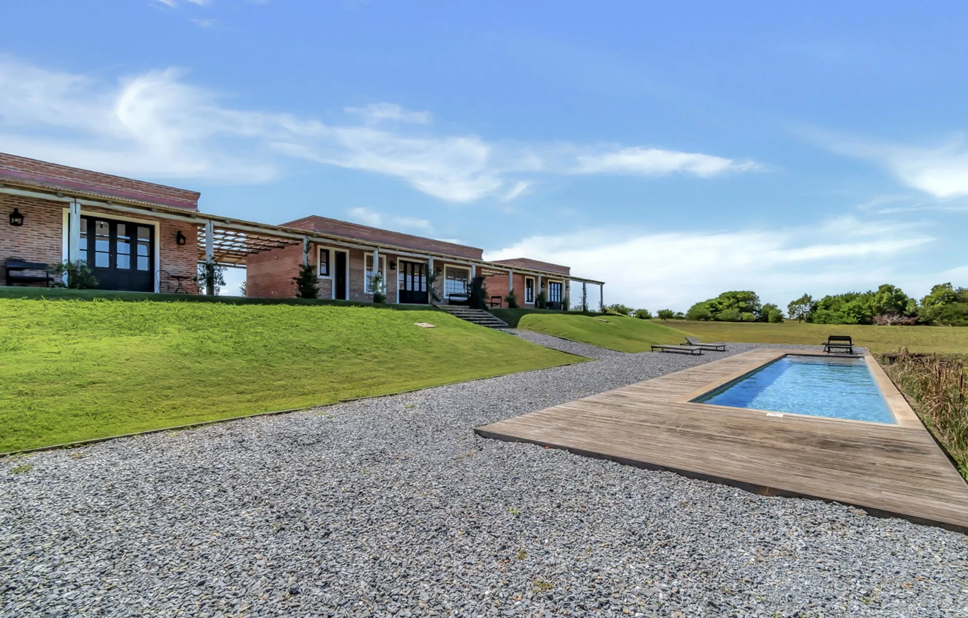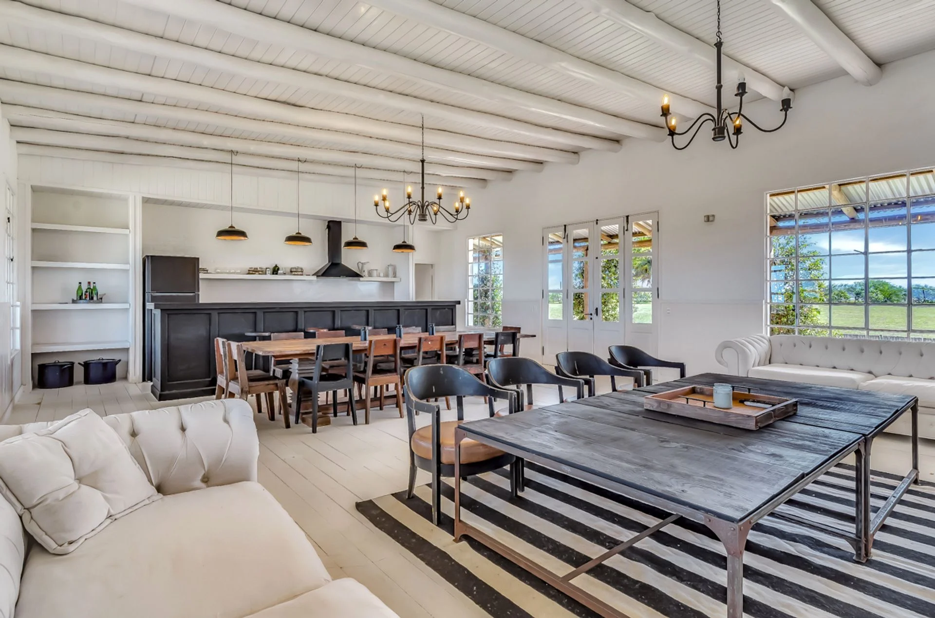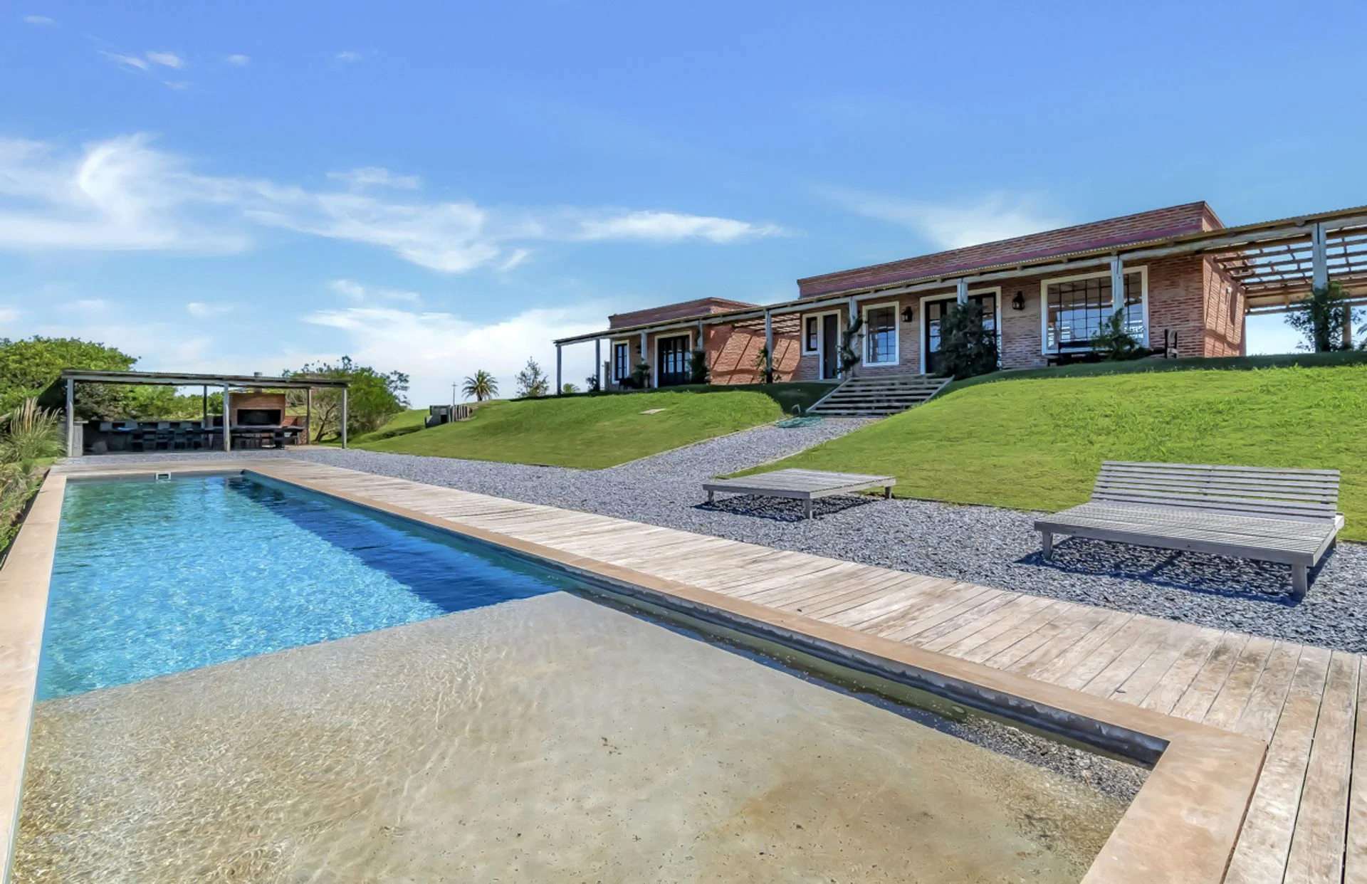El casco principal ofrece un amplio living comedor con estufa de alto rendimiento, cocina americana integrada y ventanales panorámicos que proyectan vistas excepcionales hacia los espacios verdes propios, piscina y tajamar.
