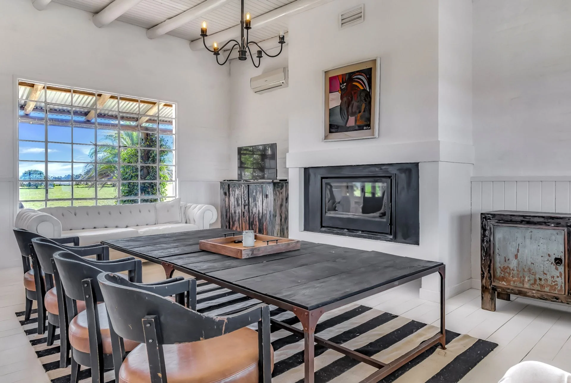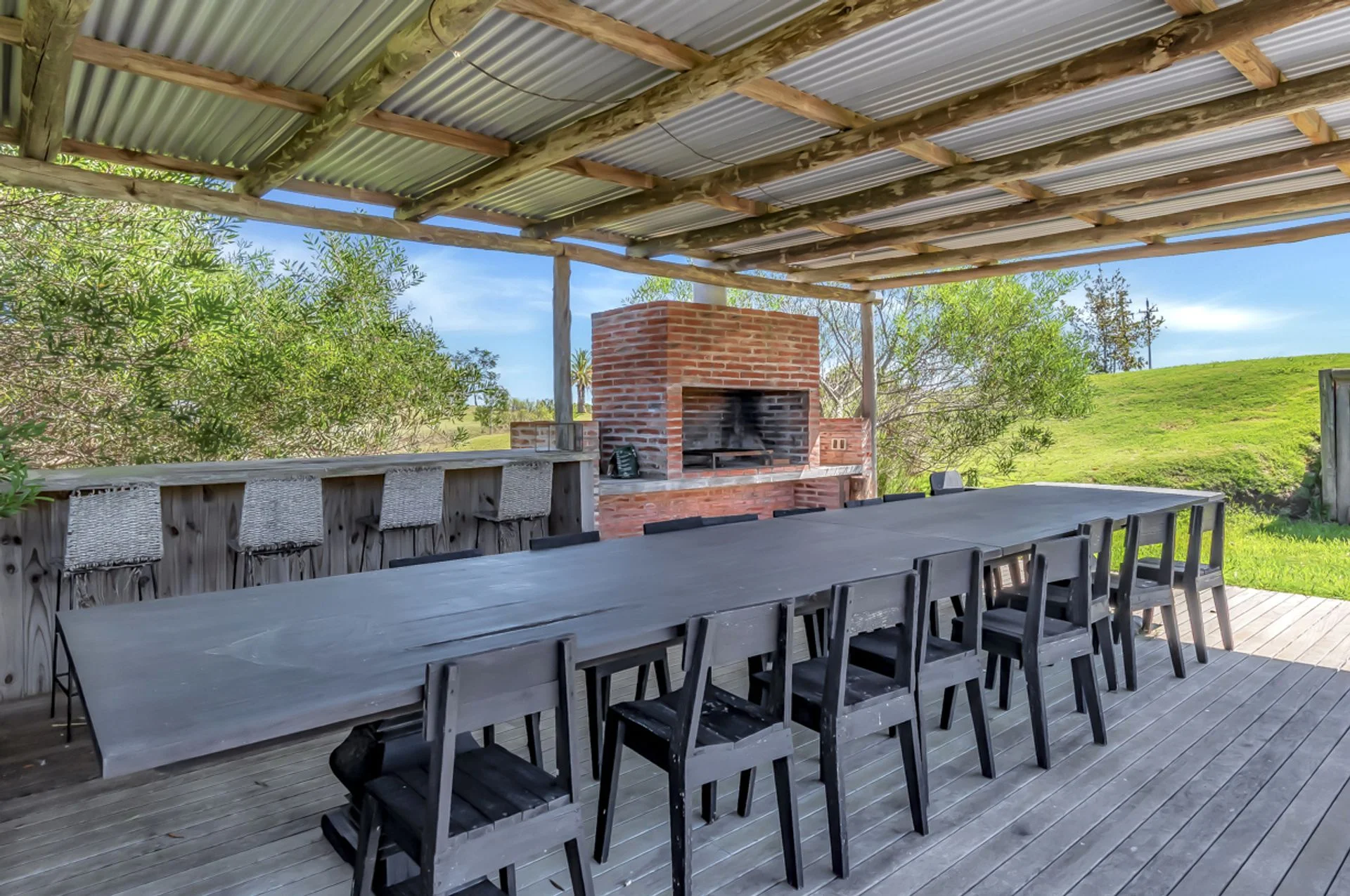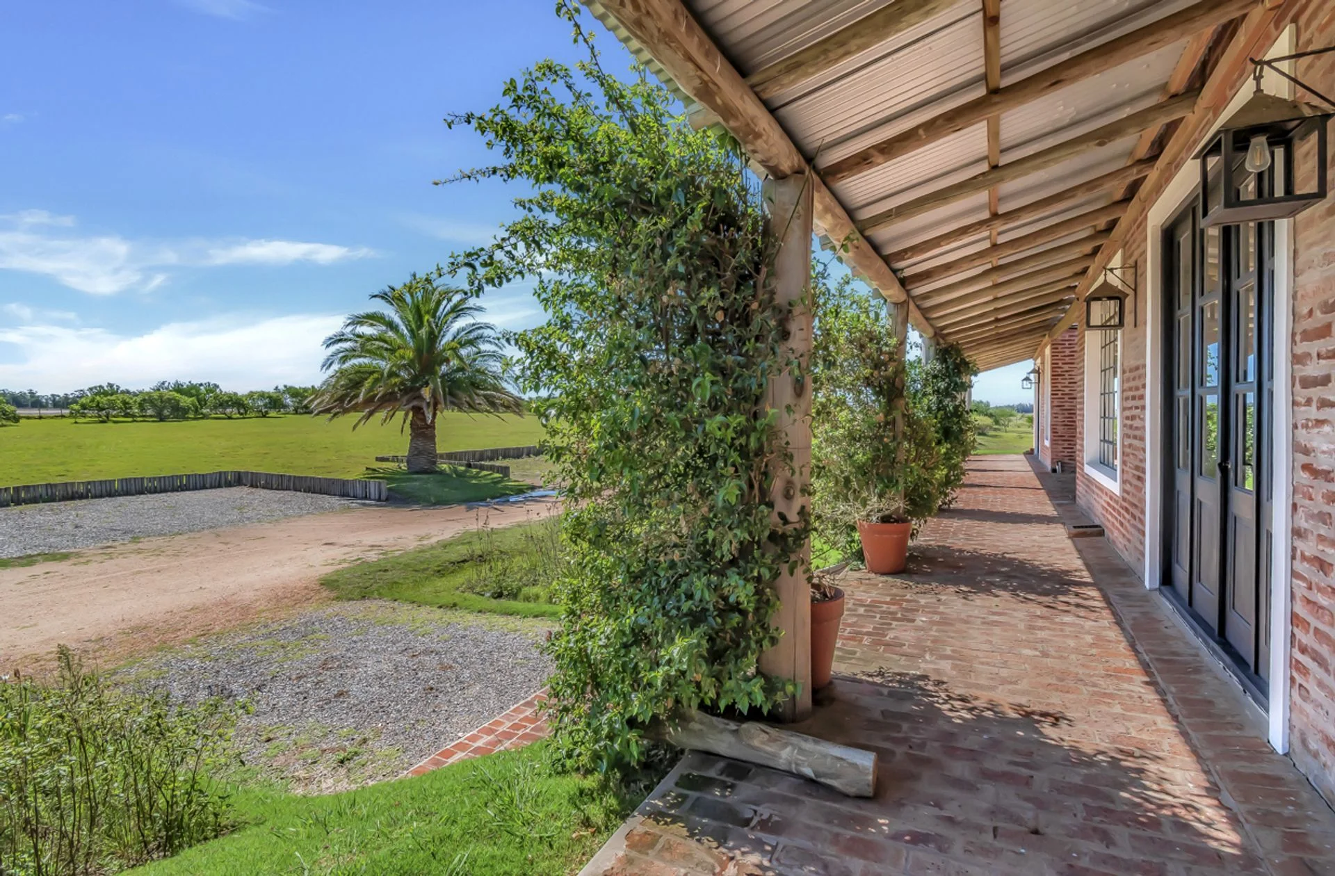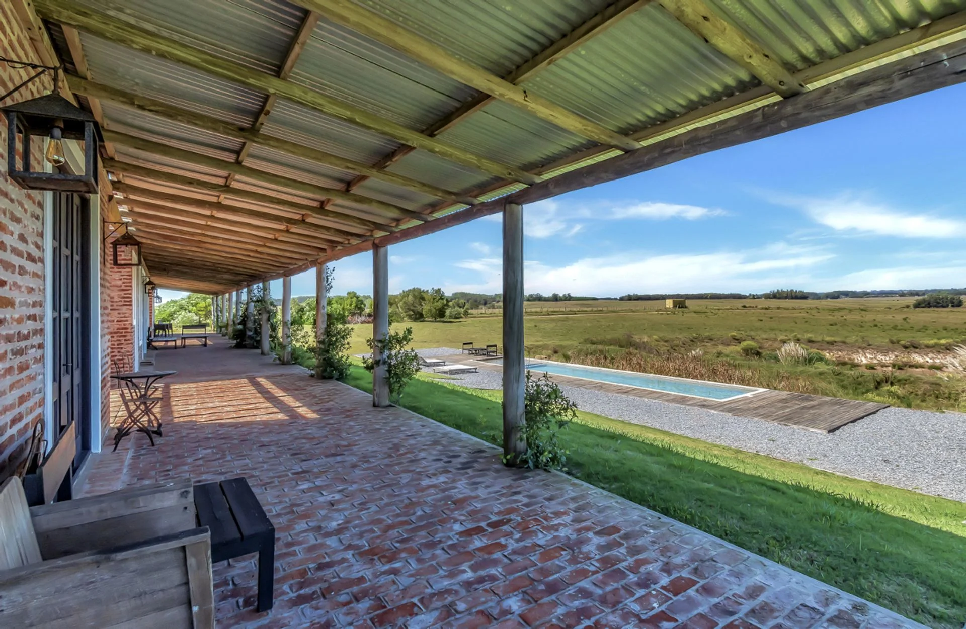 El casco principal ofrece un amplio living comedor con estufa de alto rendimiento, cocina americana integrada y ventanales panorámicos que proyectan vistas excepcionales hacia los espacios verdes propios, piscina y tajamar.