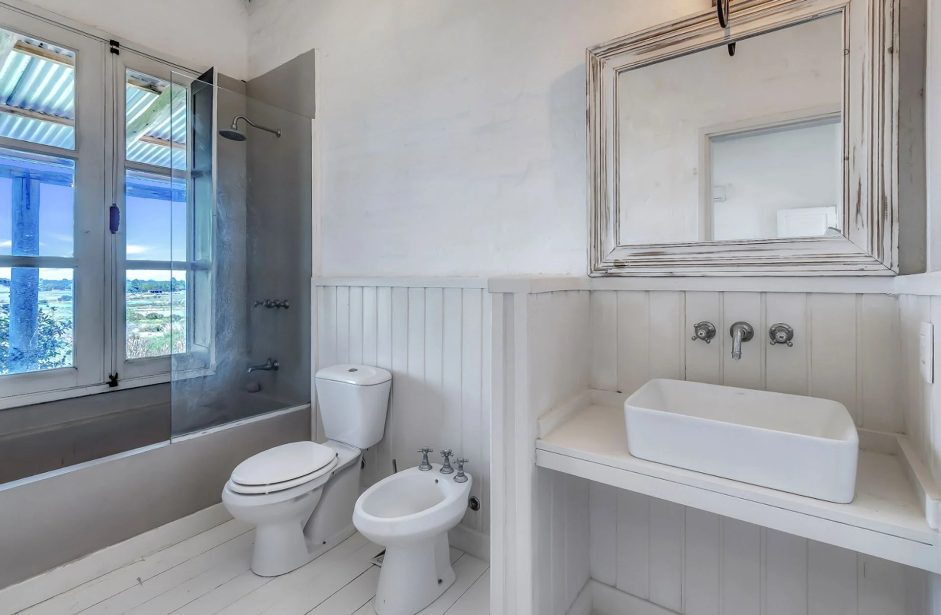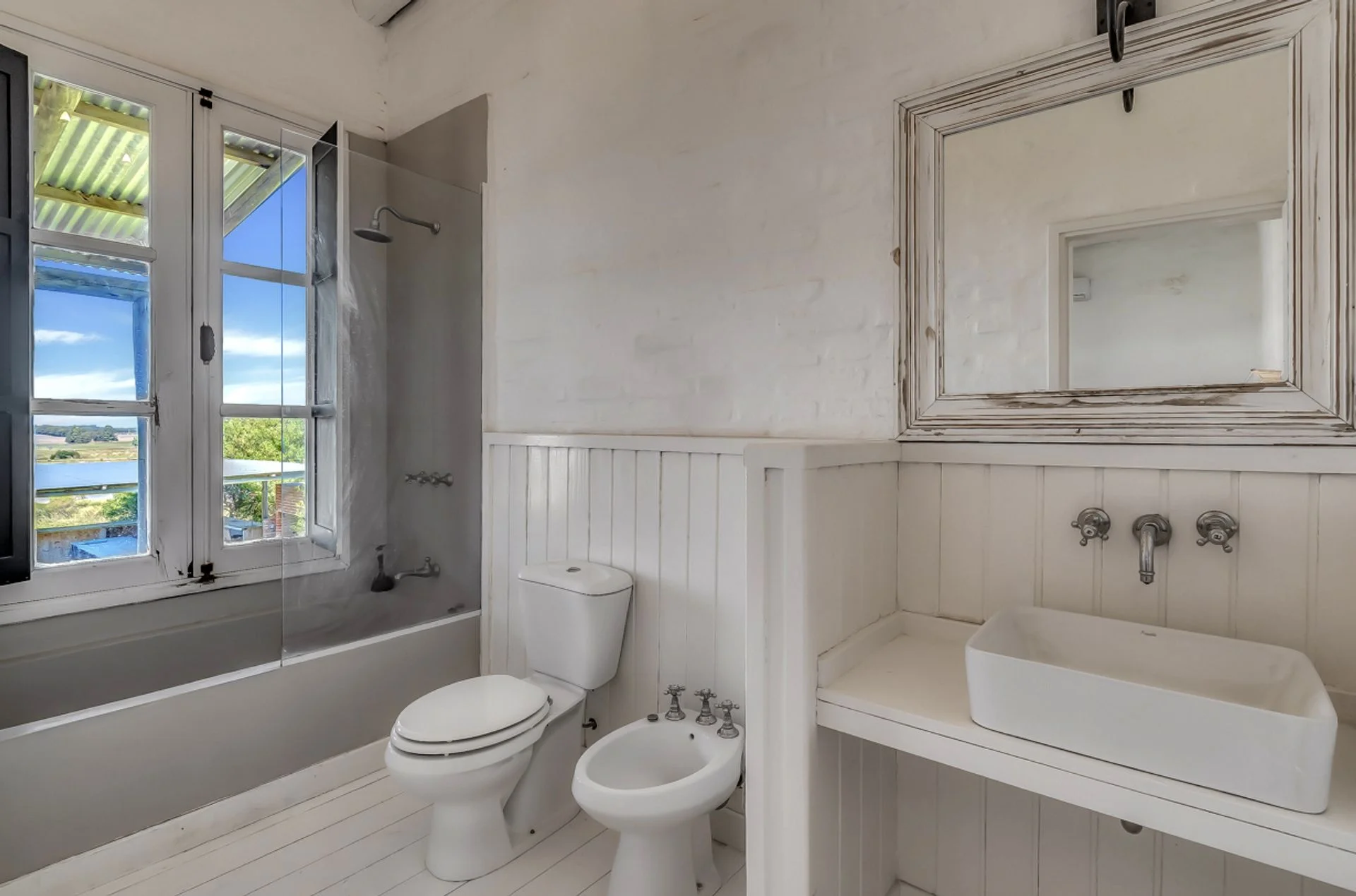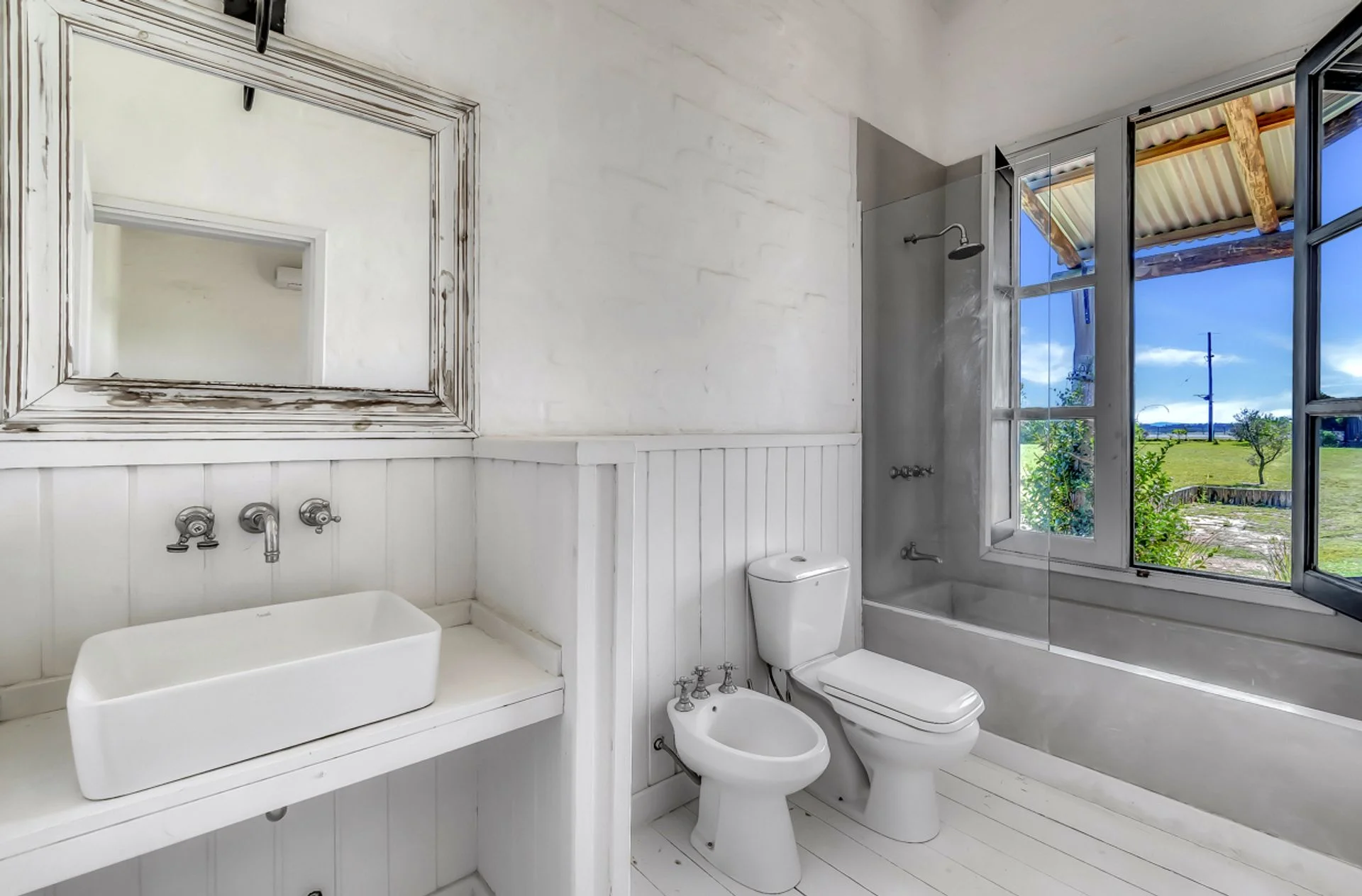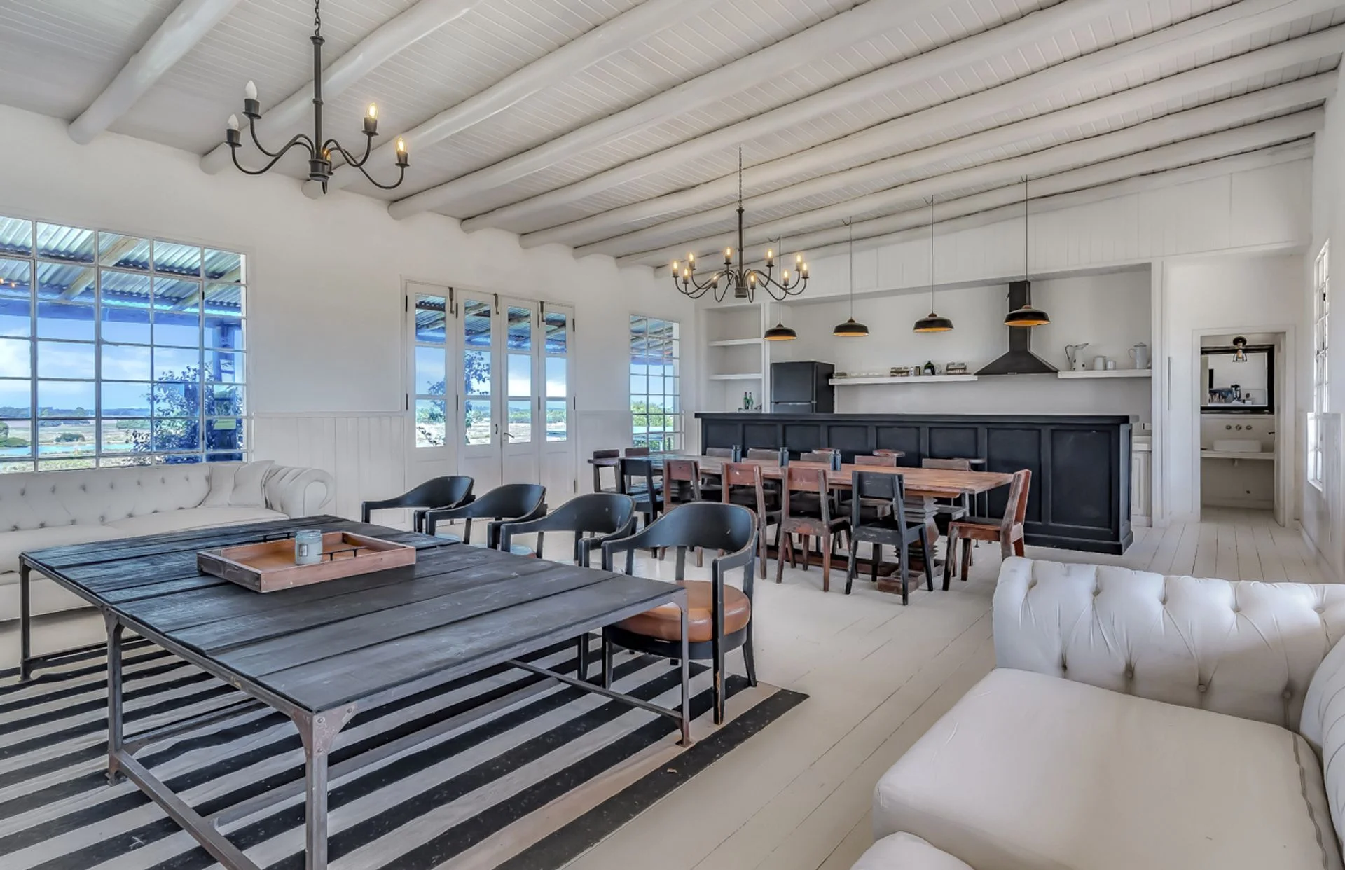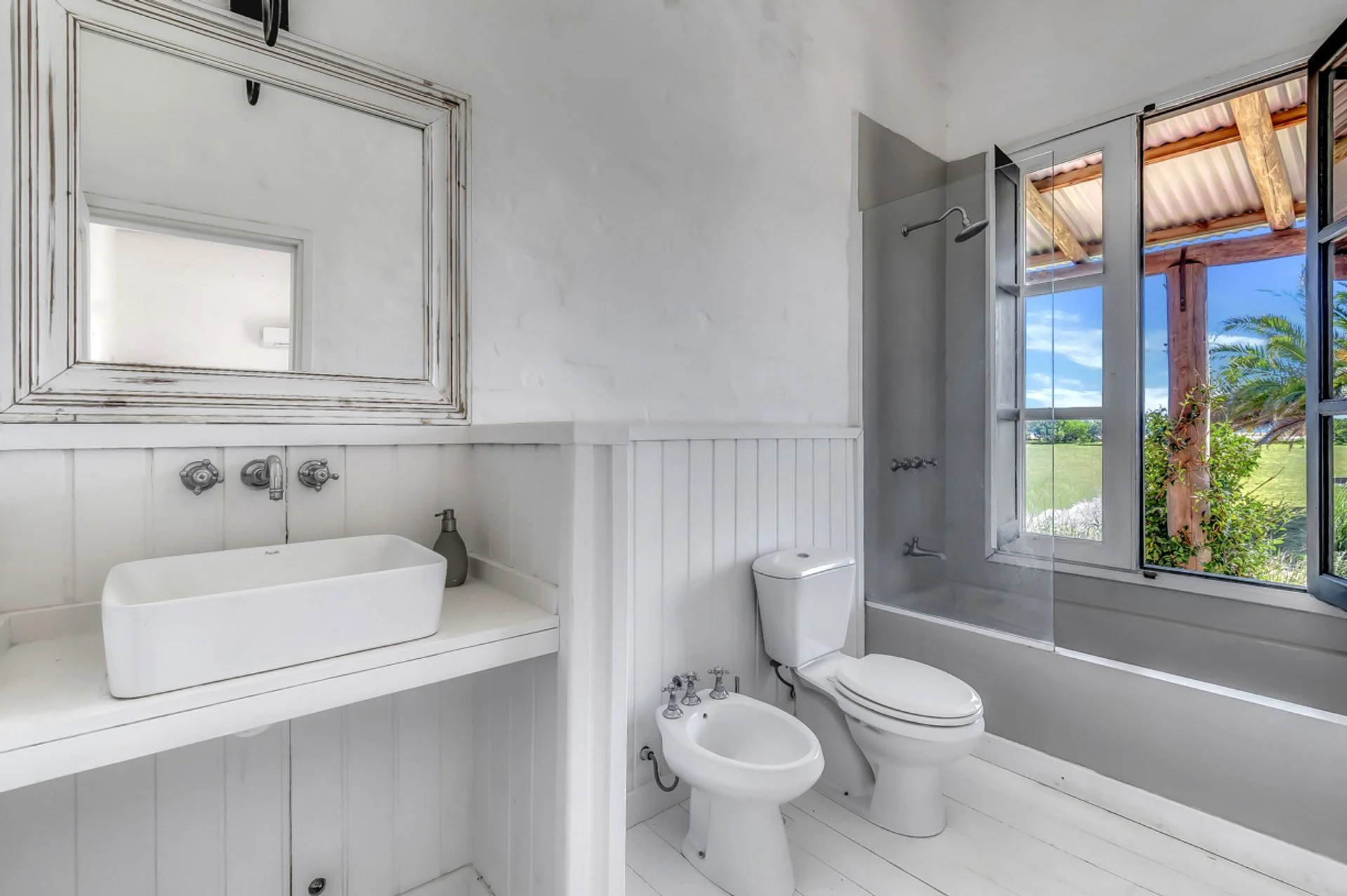 El casco principal ofrece un amplio living comedor con estufa de alto rendimiento, cocina americana integrada y ventanales panorámicos que proyectan vistas excepcionales hacia los espacios verdes propios, piscina y tajamar.