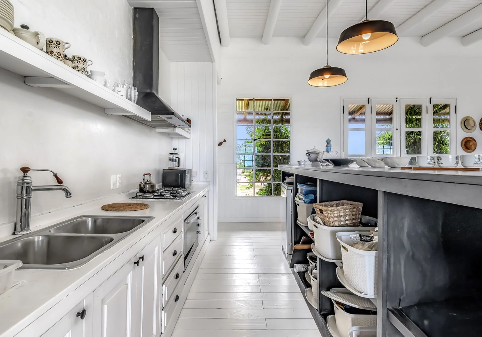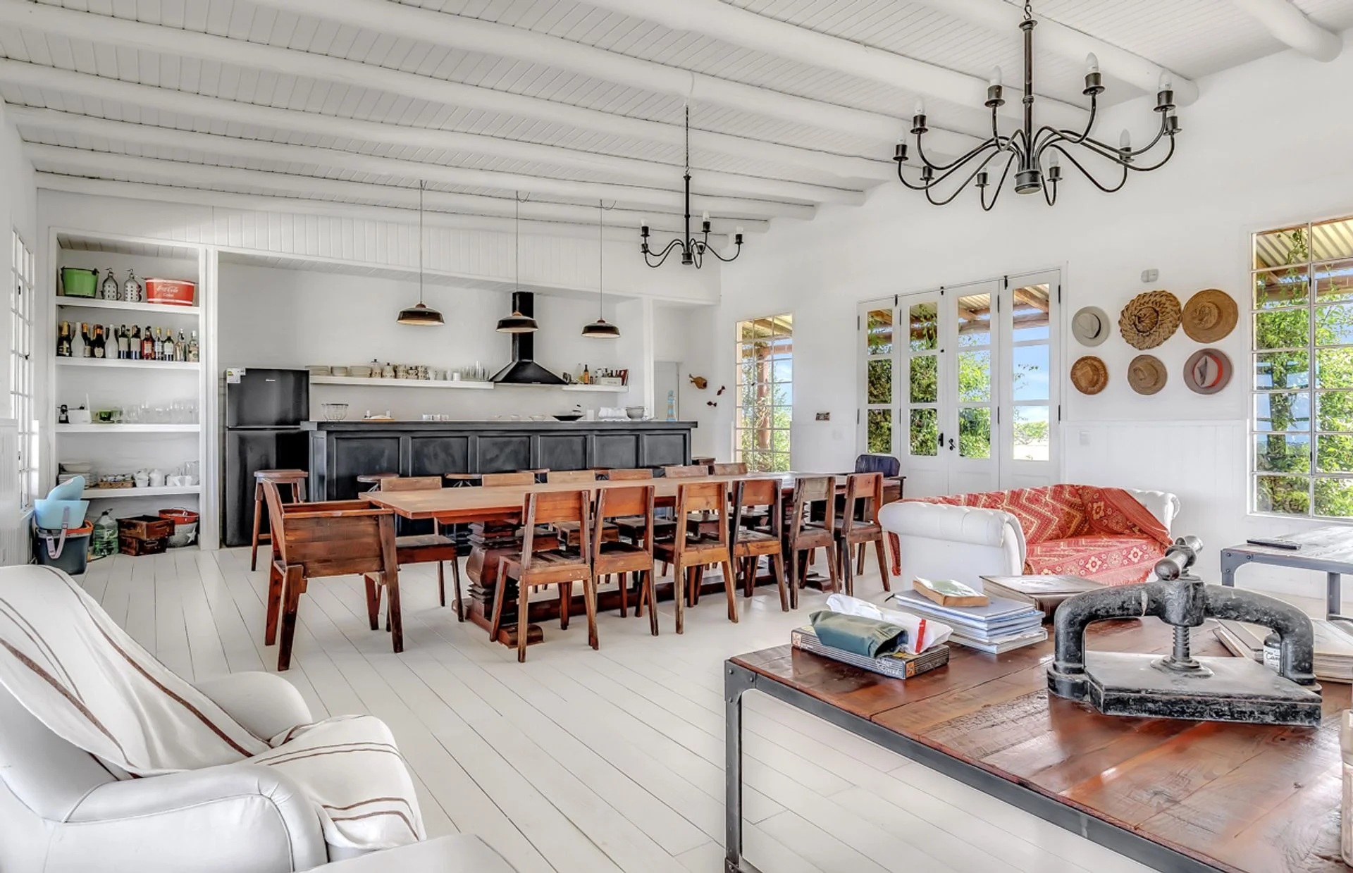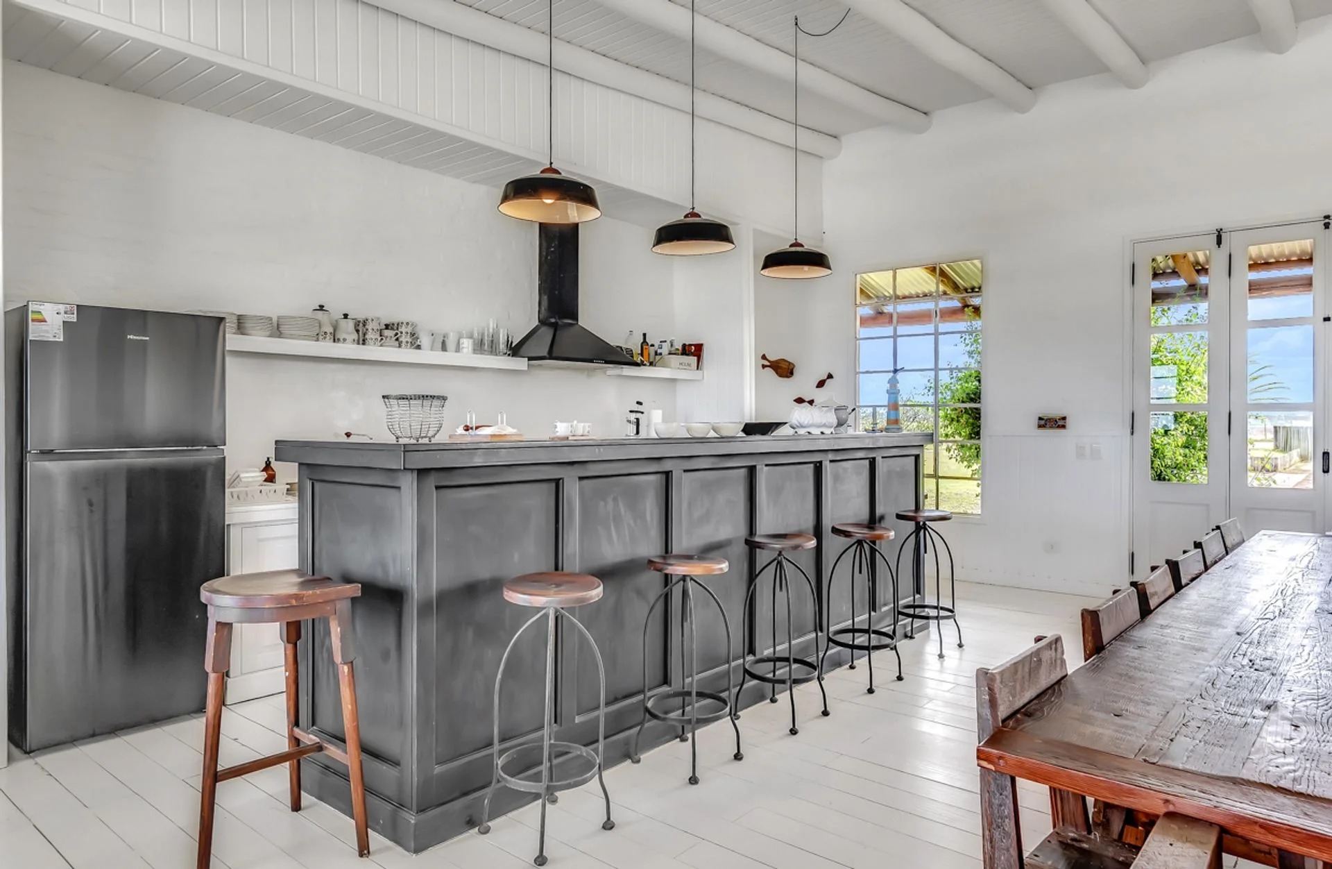 Bloque central: espacio amplio que integra living-comedor con cocina estilo americana, equipado con hogar a leña y estufa de alto rendimiento. Incluye baño social y acceso directo al jardín trasero y piscina.