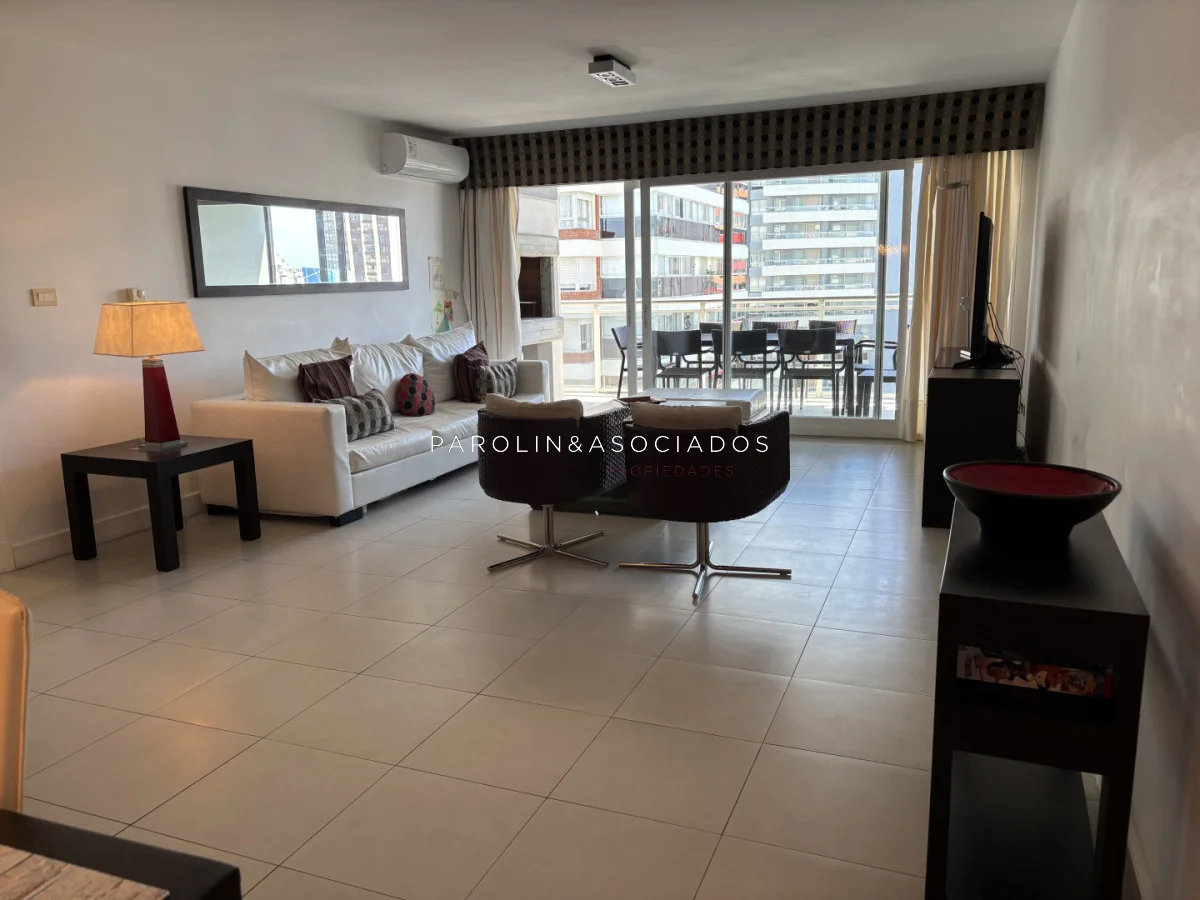 Apartamento en Brava - Punta del Este Ubicado a 300 metros del Mar. Orientación NorEste Unidad de 3 Dormitorios 2 Baños 1 Suites , con capacidad para 6 personas , 6 camas Cocina : Exterior, Living , Comedor , Living Comedor Equipamiento : Microondas - Lavarropas - , Servicio de Mucamas , Servicio de Playa , Sauna ,Piscina Superficie Propia : 130 m2 Superficie Total : 130 m2 ParolinandAsociados Propiedades. Consulte con nuestros asesores. Referencia Interna : Tera-11901