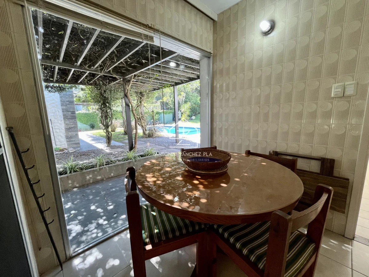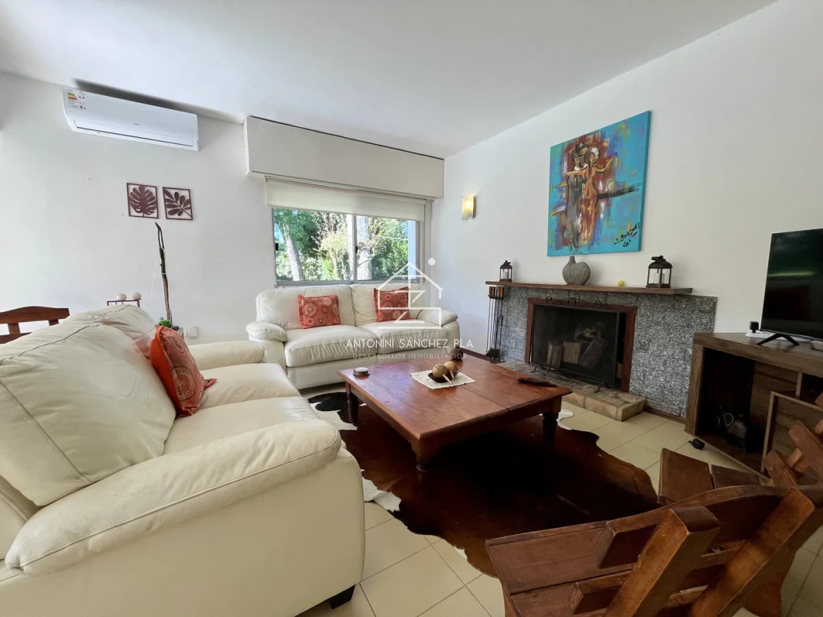 • Luminoso living-comedor con estufa a leña, aire acondicionado y grandes ventanales con vista al parque y la piscina
