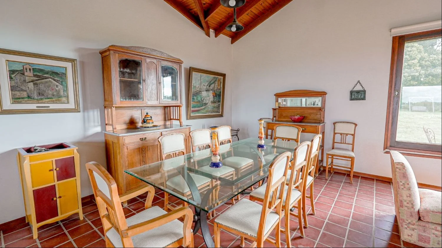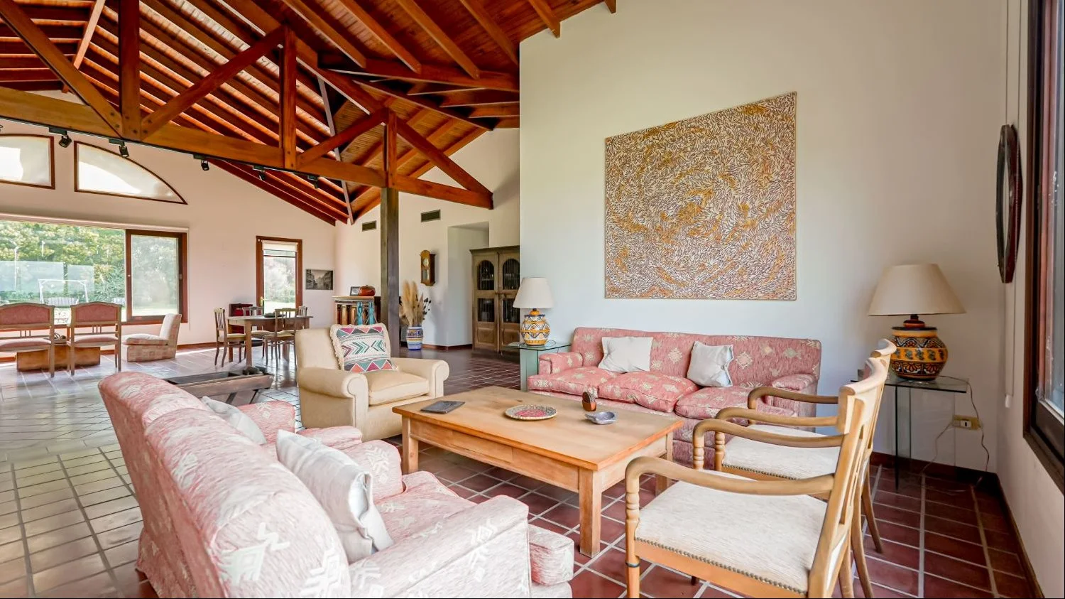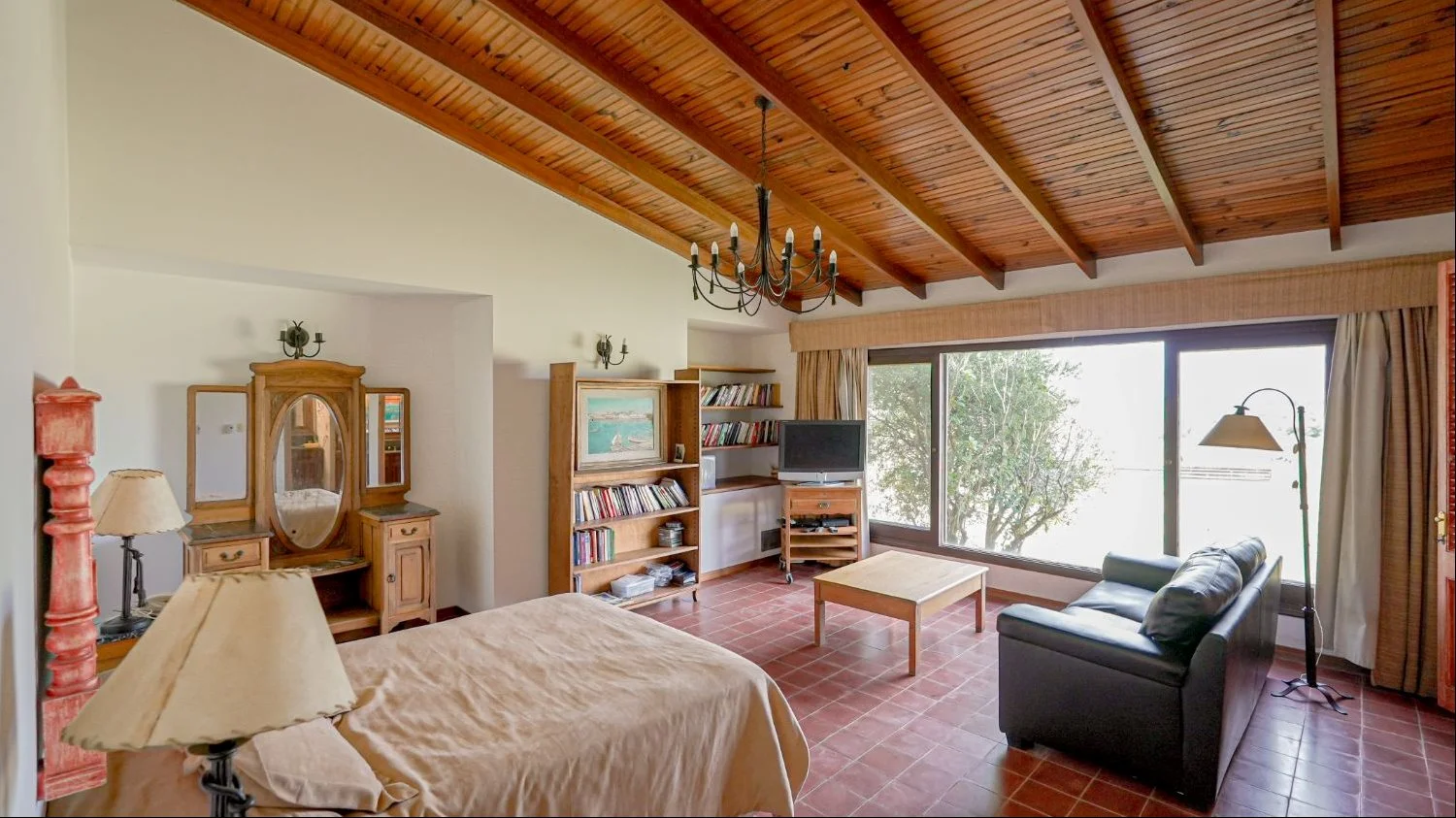 Al centro de la construcción se encuentra un importante living y comedor, con estufa a leña y con ventanales tanto al este como al oeste. Su generoso tamaño permite armar distintos sectores tanto para estar o como comedor. Totalmente rodeado de ventanales y con techo a doble altura, genera gran amplitud visual.
