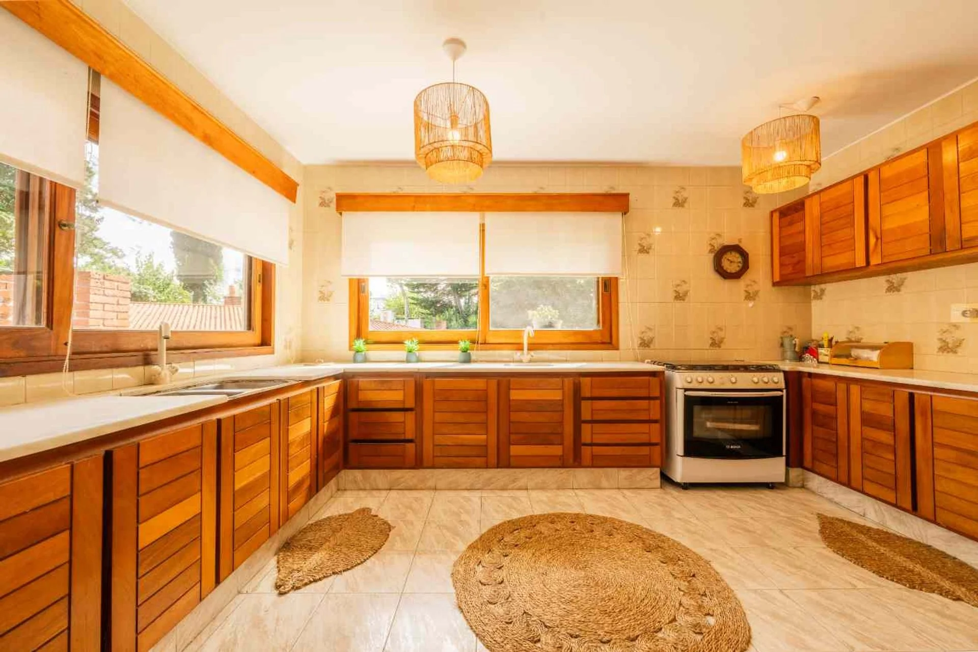 Comedor diario luminoso, con estufa a leña, cocina comedor con desayunador.