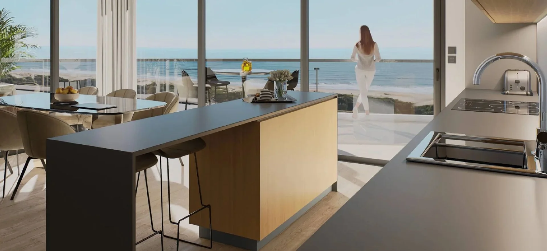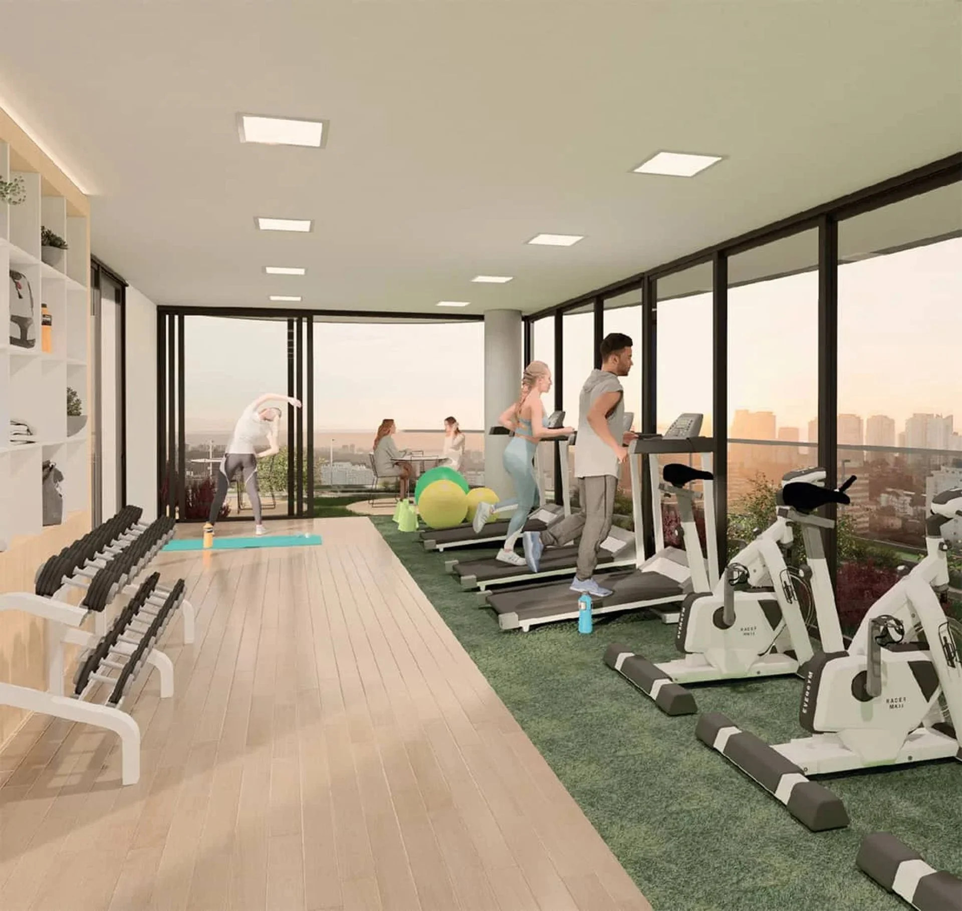 The apartments feature premium finishes: porcelain tile floors, zoned underfloor heating, pre-installed A/C, fully equipped kitchens, and double-glazed windows (DVH) for thermal and acoustic comfort.