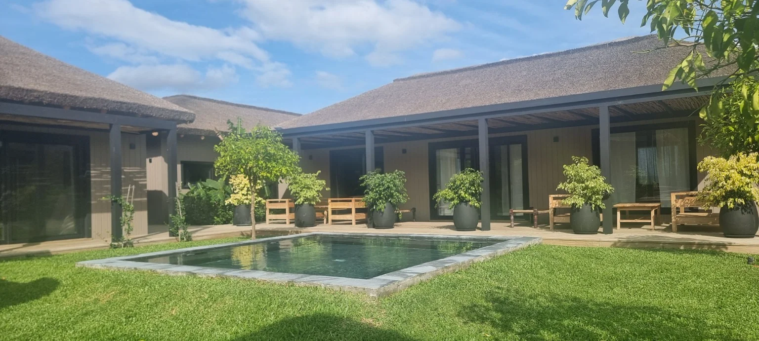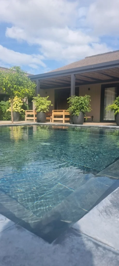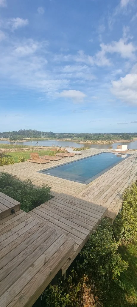 Amenidades privadas: Doble piscina, solárium de madera y áreas de relax.