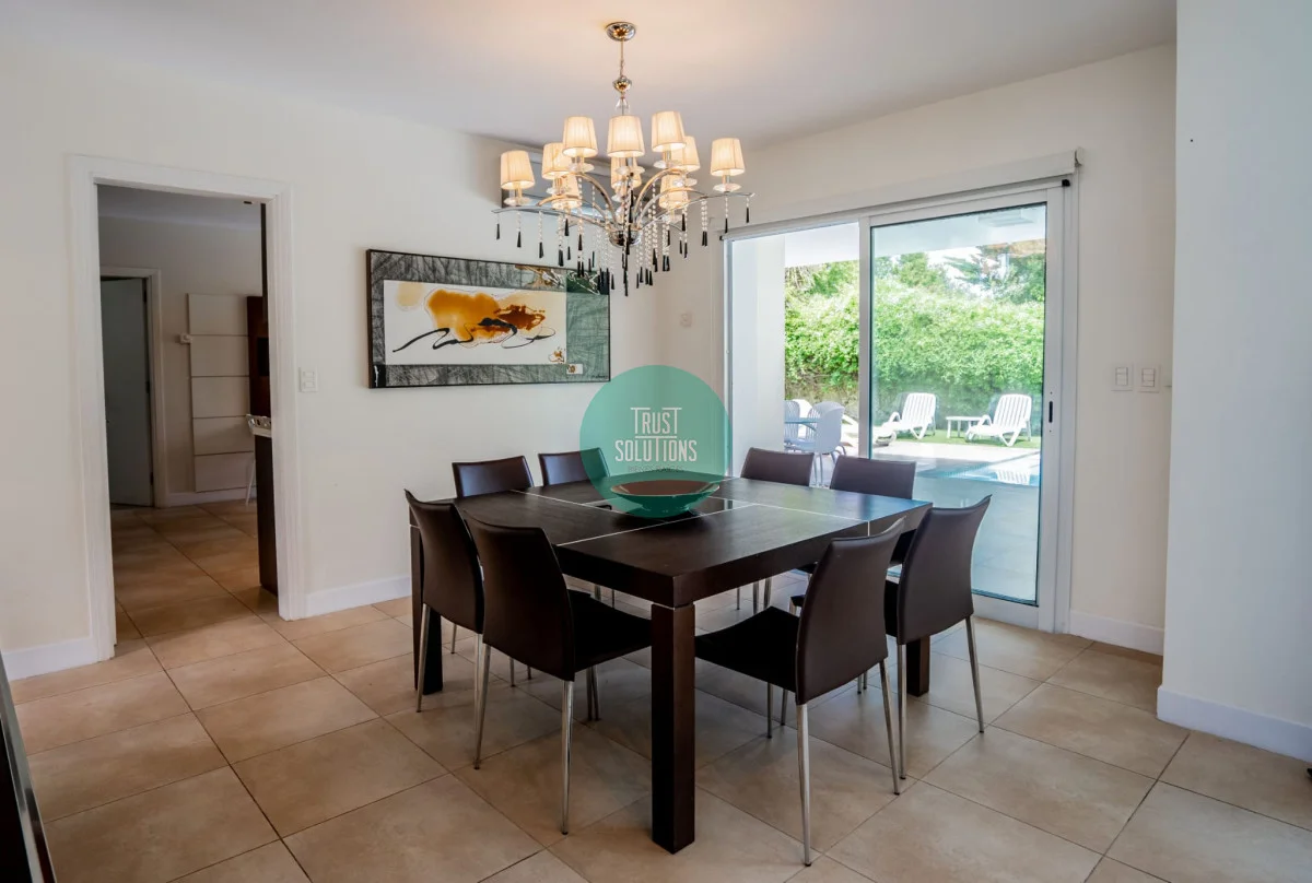 Comedor con vista al parque y piscina,