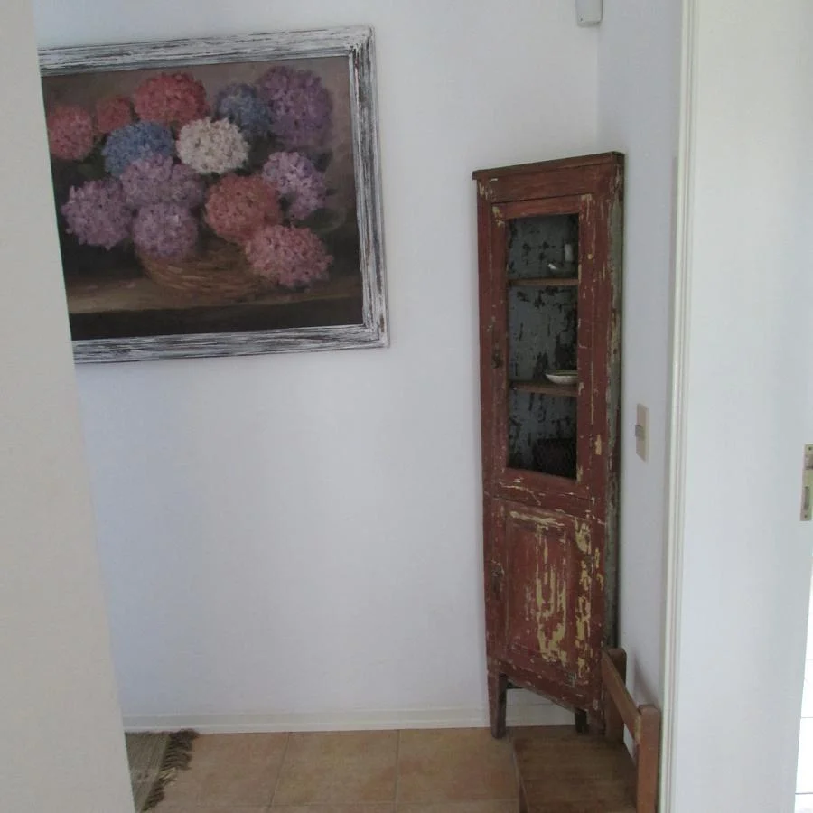 Upstairs, with an open sea view, you'll find the living-dining area with a wood-burning fireplace, kitchen, and a terrace.