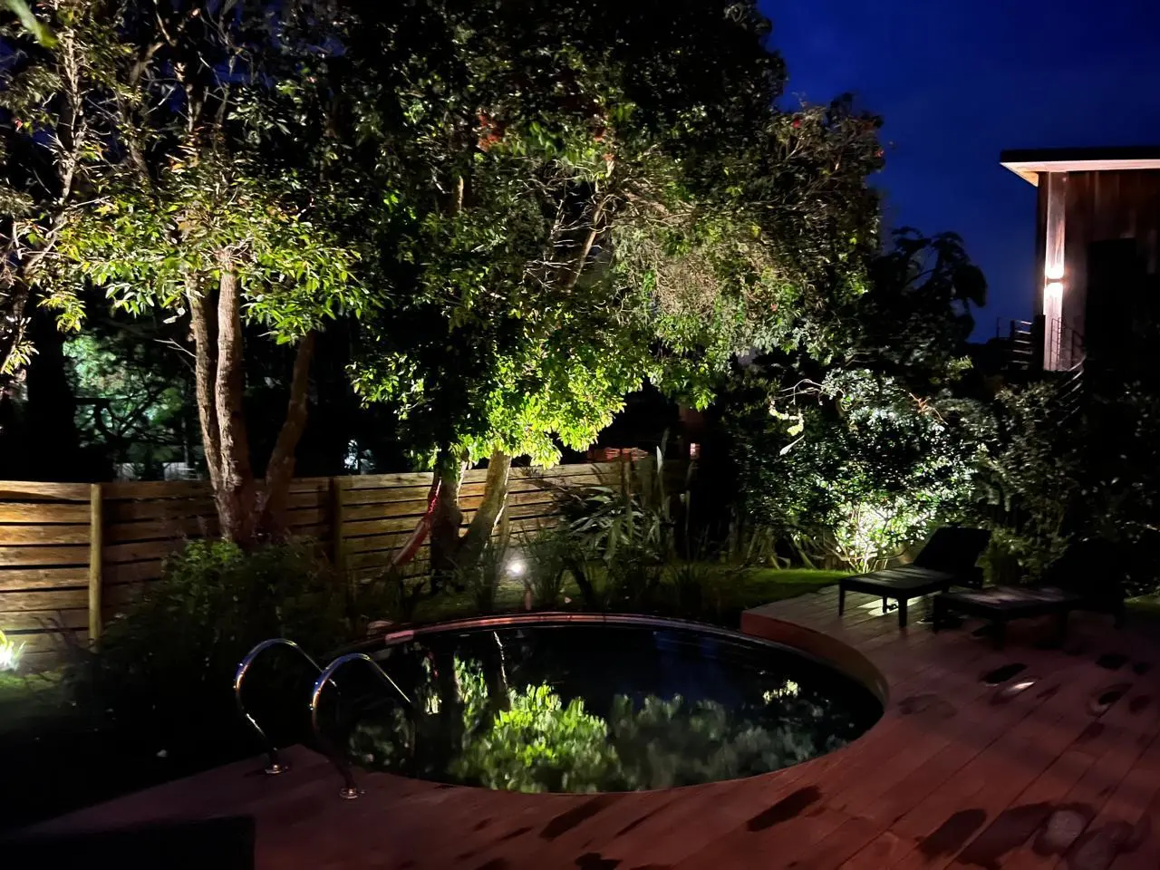 One of the most enjoyable spaces in this home is the large fenced garden, which includes a covered gallery, a beautiful round pool, a soccer field, and a barbecue area.