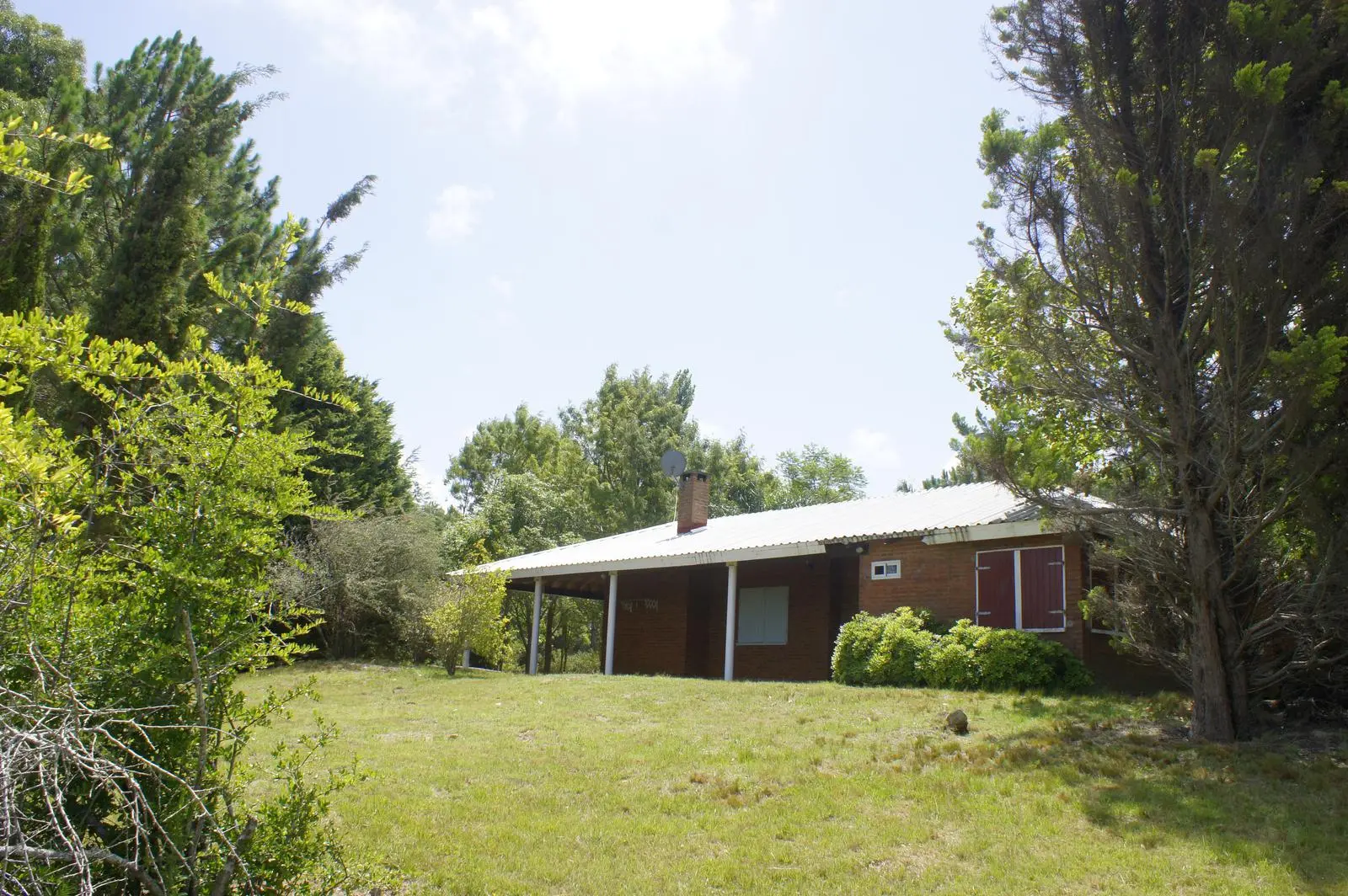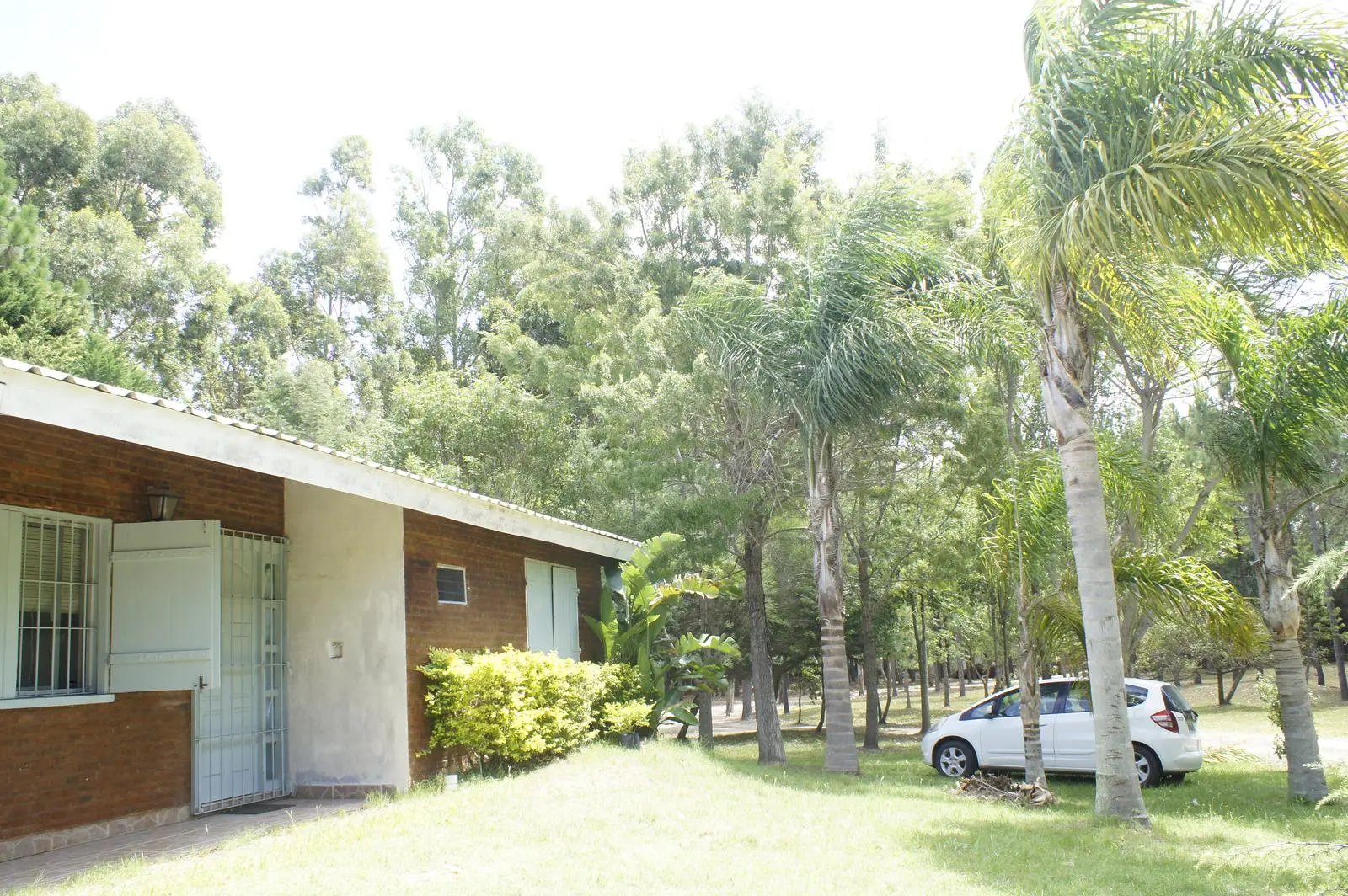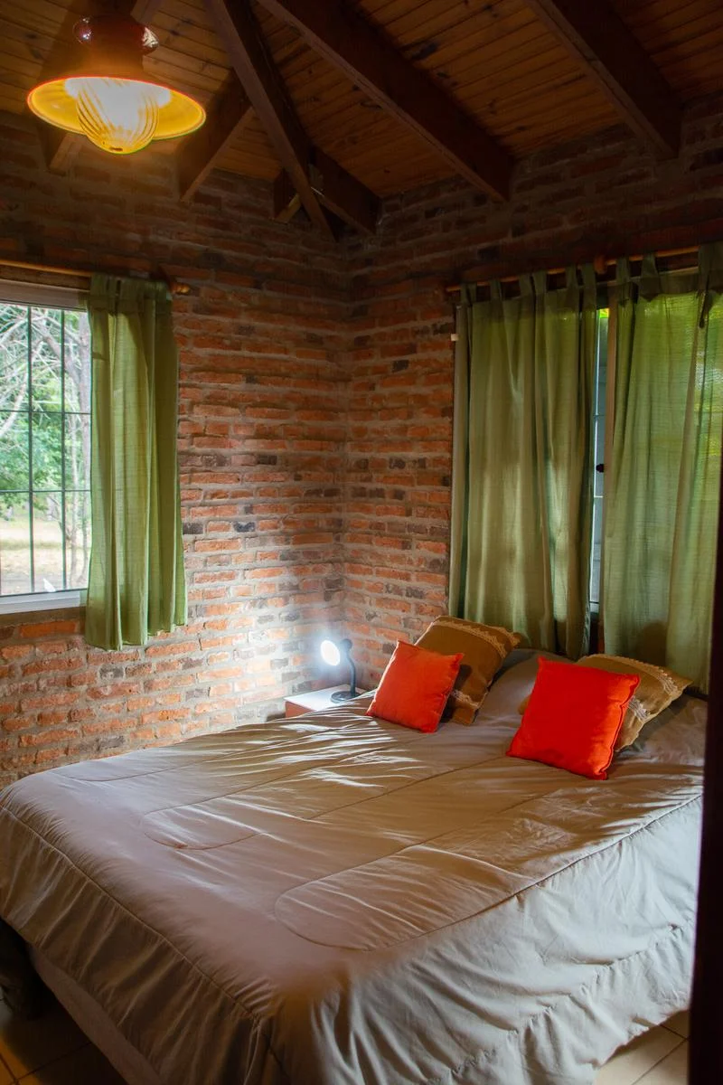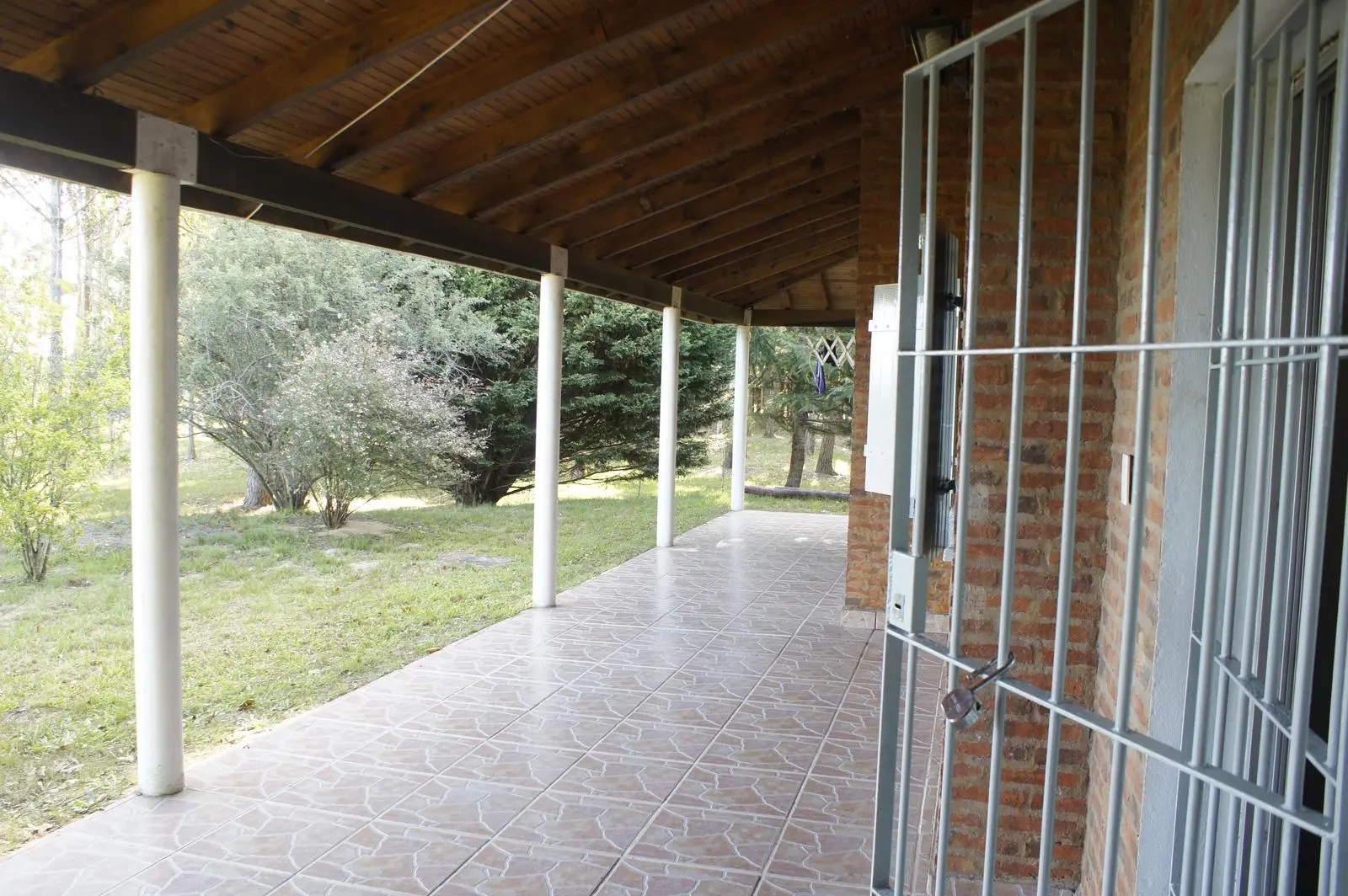 - Casa: Desarrollada en una sola planta con paredes de ladrillo visto y carpintería de aluminio con postigos de madera.