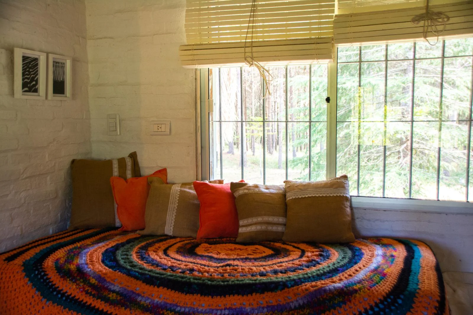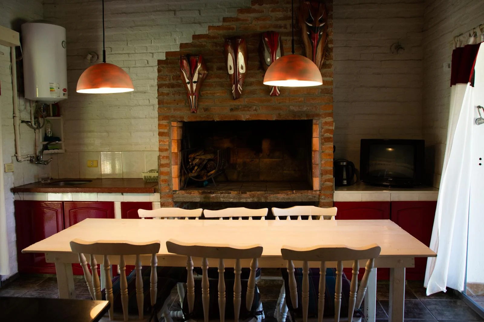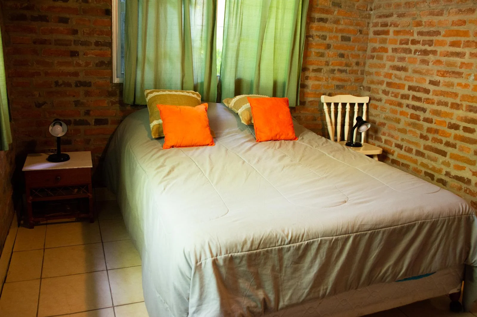 - Casa: Desarrollada en una sola planta con paredes de ladrillo visto y carpintería de aluminio con postigos de madera.