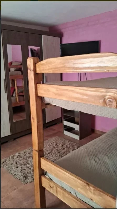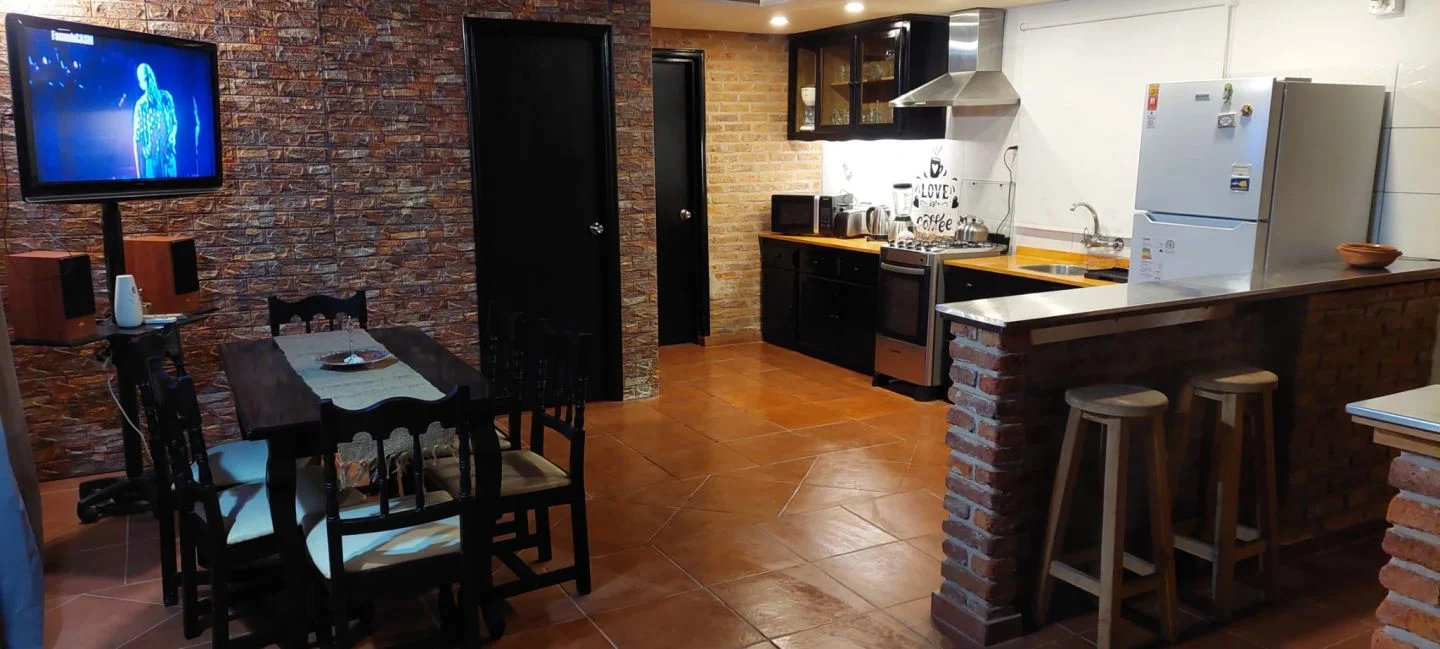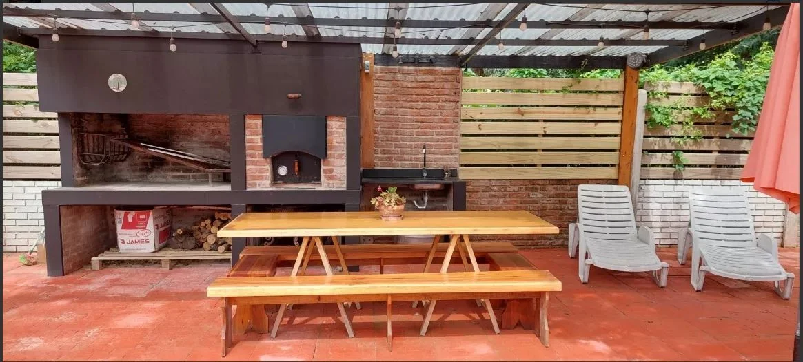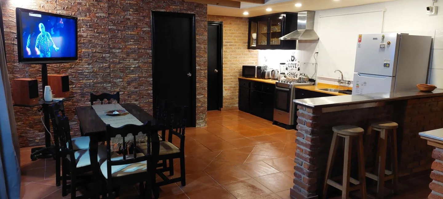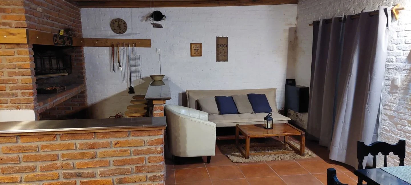 Cuenta con 2 dormitorios, uno de ellos con cama matrimonial y el otro con 1 cucheta y 1 cama marinera, ambos con cómodas y televisores con cable. Living-comedor-cocina integrado con parrillero interno, aire acondicionado, sofás y TV Smart y wifi. La cocina completa con mesa y sillas de madera para 6 personas, vajilla para 8 personas, electrodomésticos pequeños, además de heladera con freezer, microondas, cocina a gas y lavarropas. Amplia barbacoa con parrillero y horno y piscina climatizada con bomba de calor e hidromasajes.