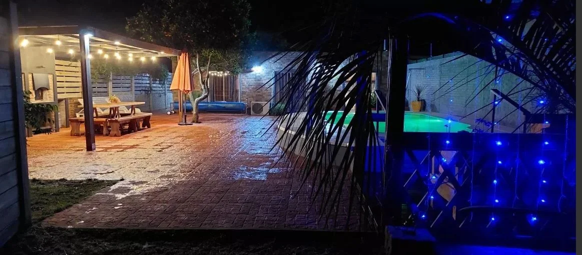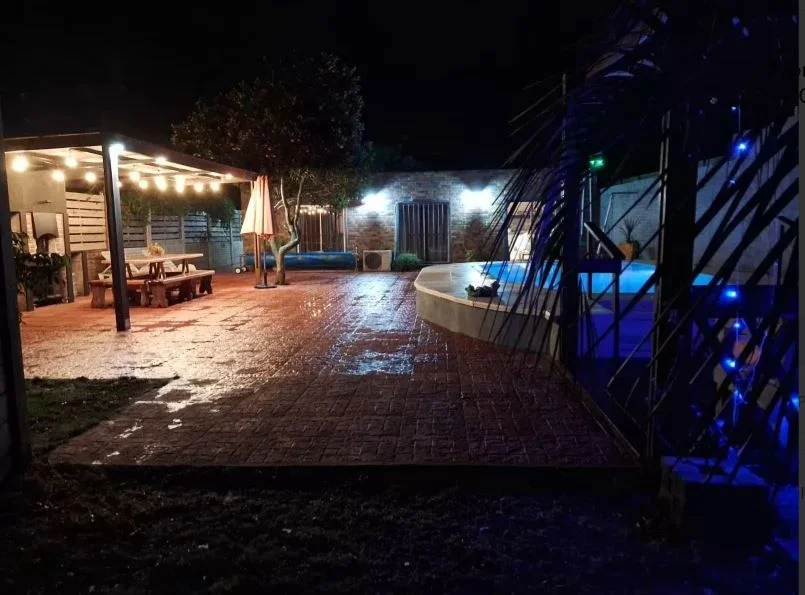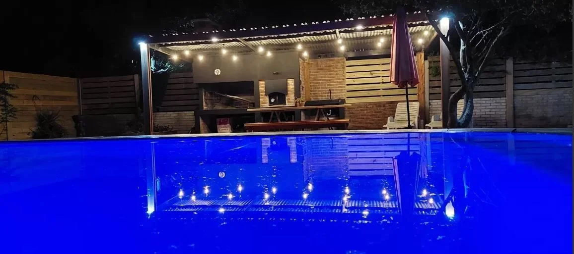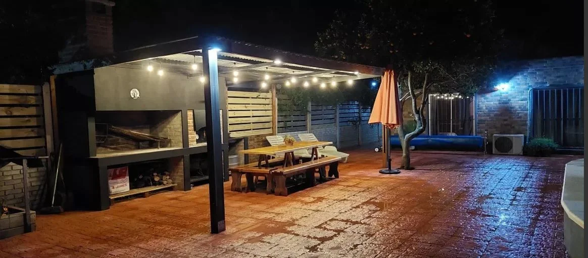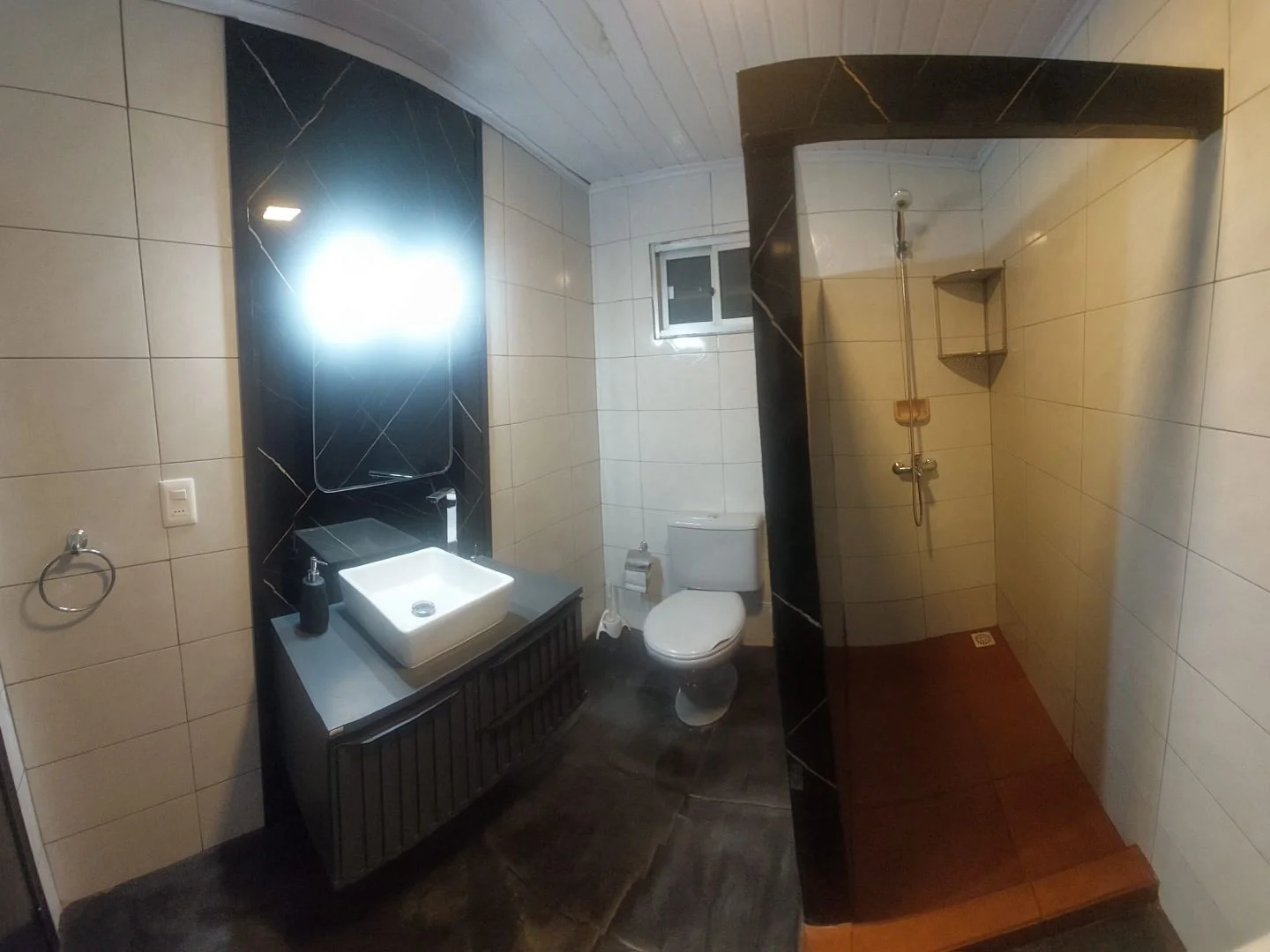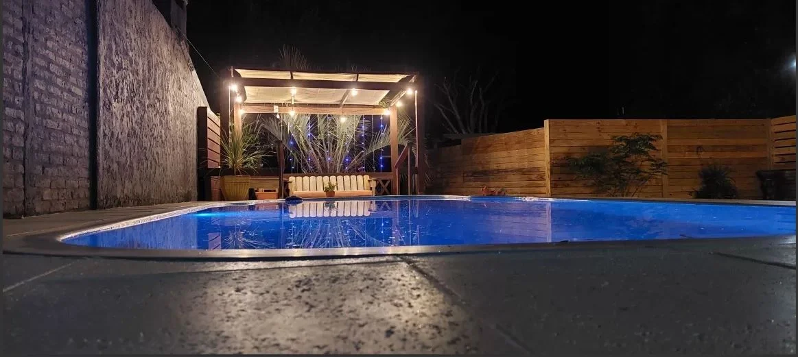 Cuenta con 2 dormitorios, uno de ellos con cama matrimonial y el otro con 1 cucheta y 1 cama marinera, ambos con cómodas y televisores con cable. Living-comedor-cocina integrado con parrillero interno, aire acondicionado, sofás y TV Smart y wifi. La cocina completa con mesa y sillas de madera para 6 personas, vajilla para 8 personas, electrodomésticos pequeños, además de heladera con freezer, microondas, cocina a gas y lavarropas. Amplia barbacoa con parrillero y horno y piscina climatizada con bomba de calor e hidromasajes.