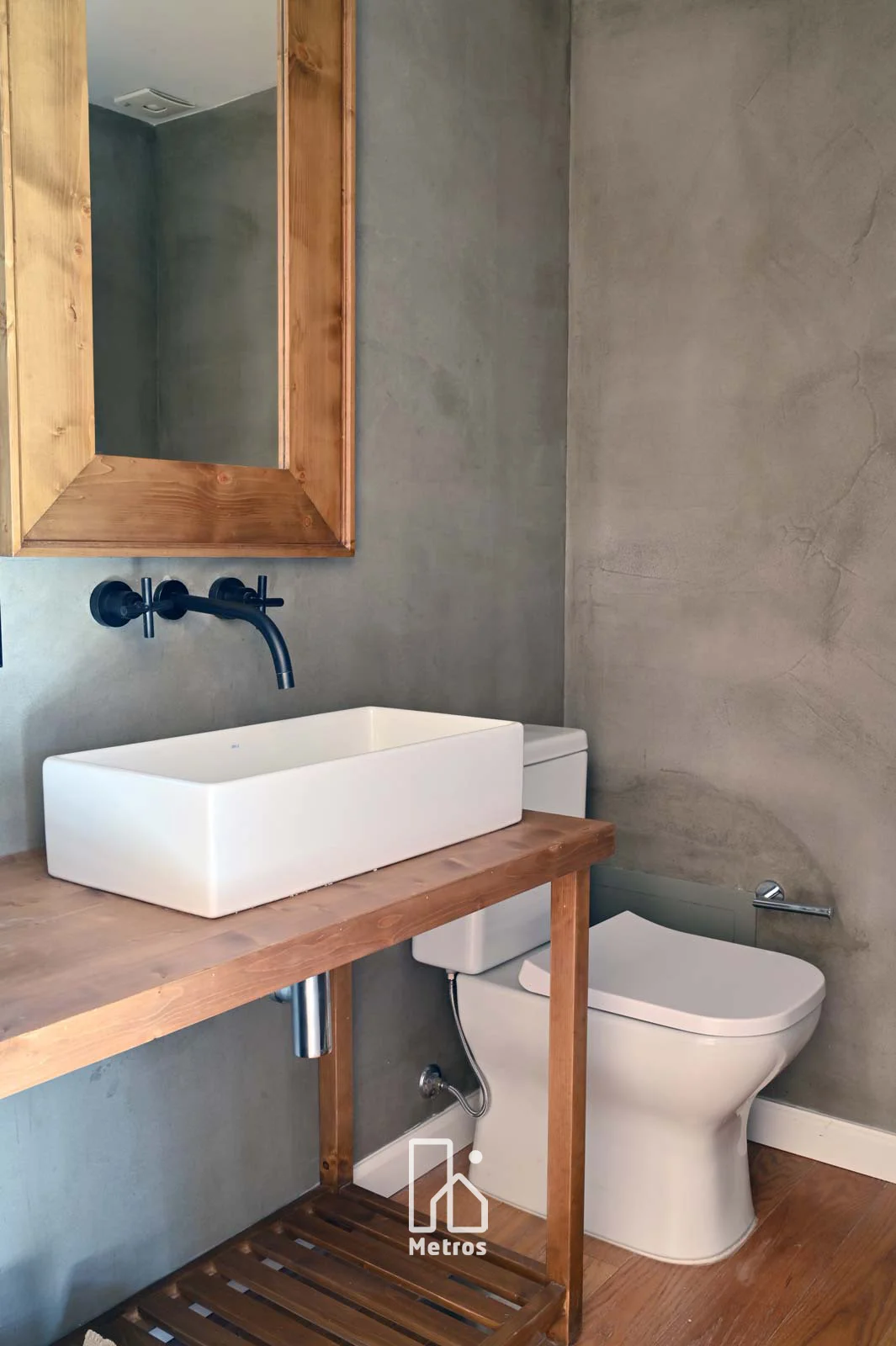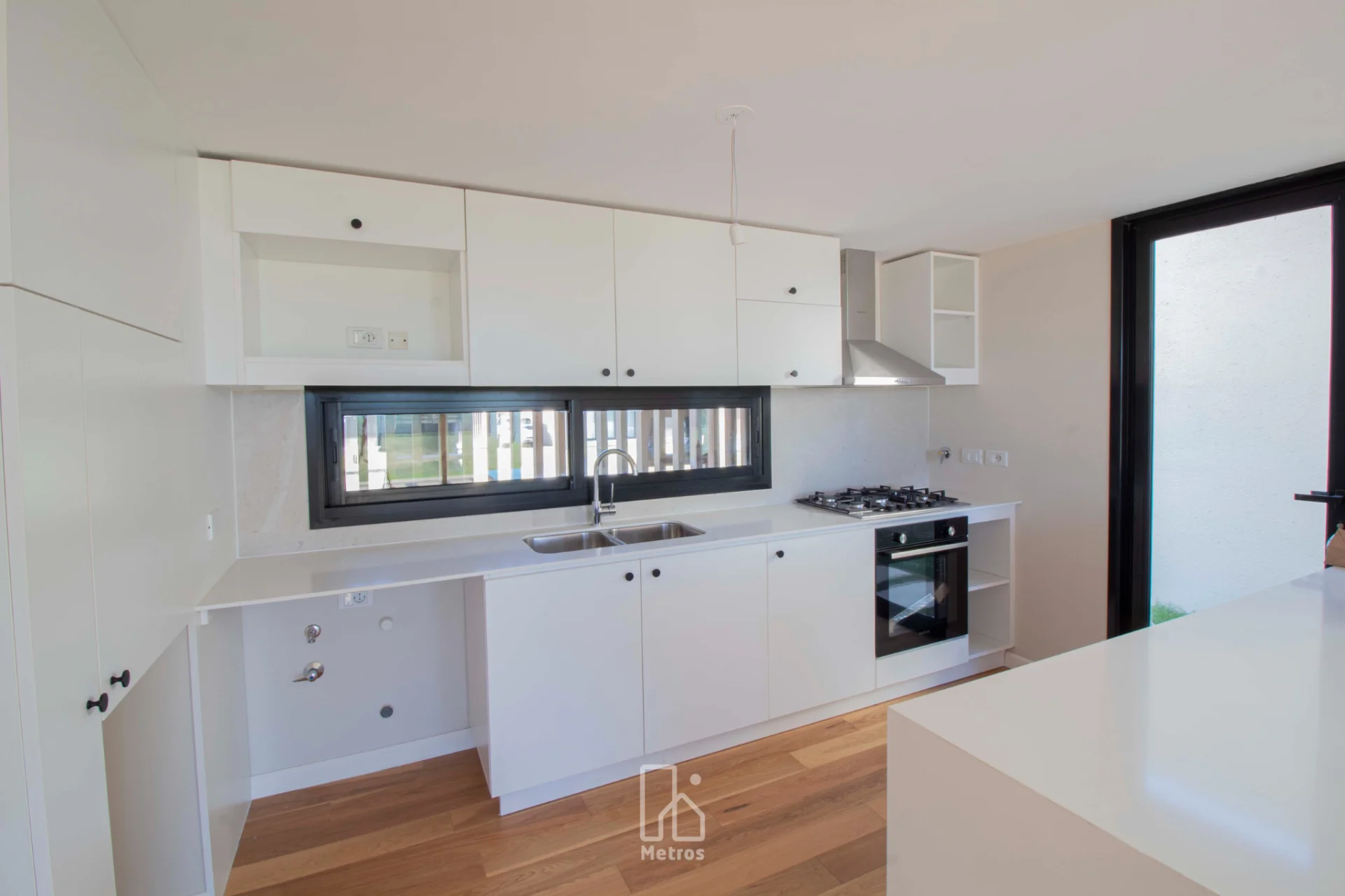 Cocina con muebles bajo mesada, aéreos en melamínicos y mesada en cuarzo. Además incluye anafe a gas, horno eléctrico y campana de extracción. La misma se integra al living/comedor, donde se encuentra una estufa tradicional a leña y baño social en la misma planta. Cuenta con un comedor diario para desayunar en familia.