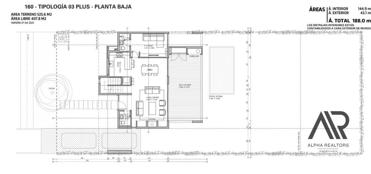 - Área exterior de deck y pérgola en madera natural (no incluye entablillado y chapa)