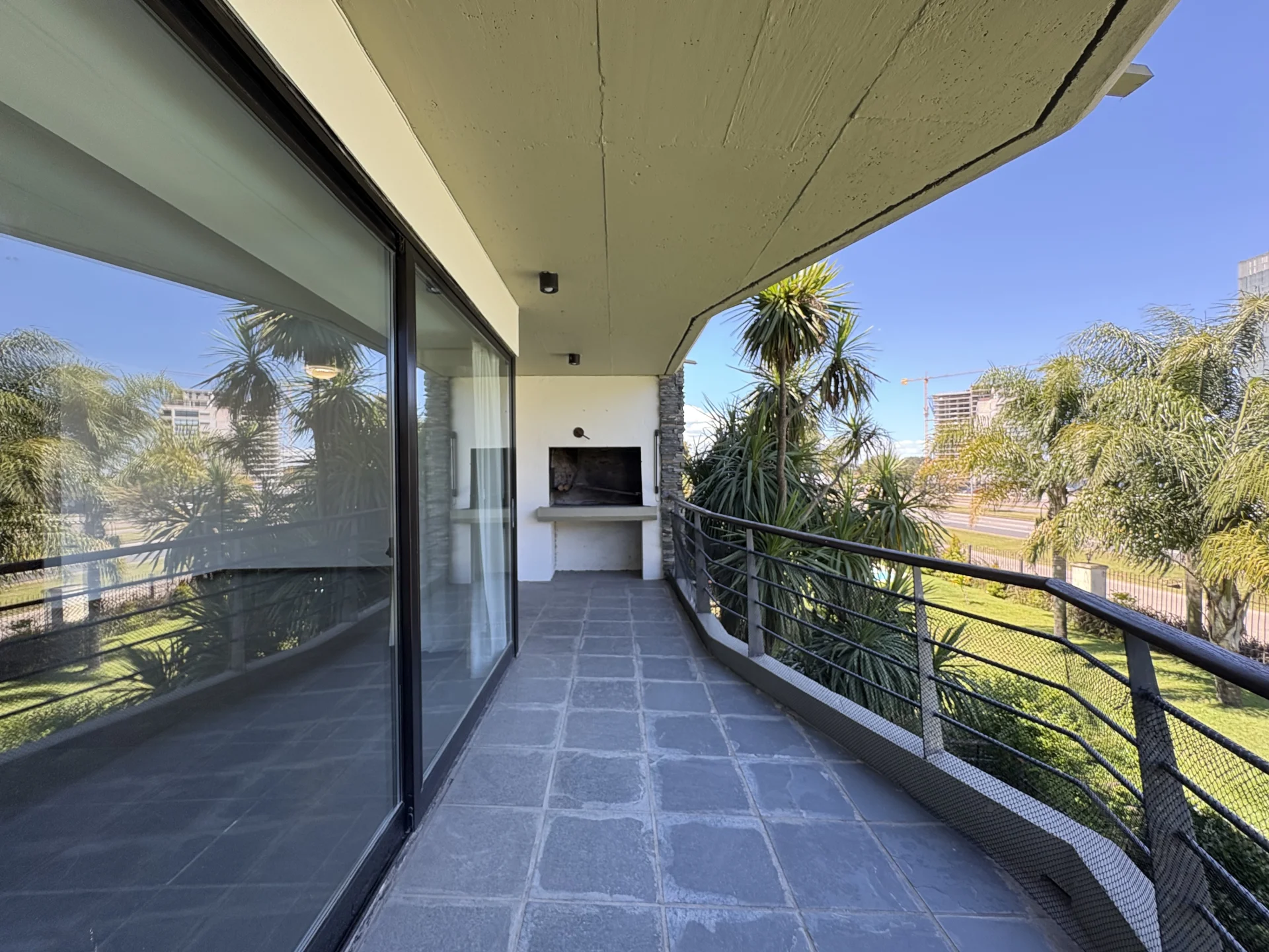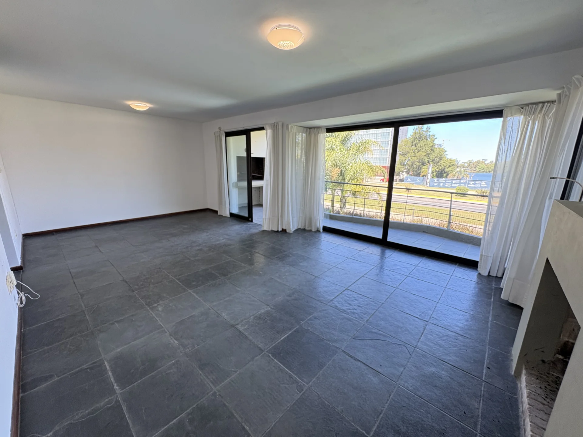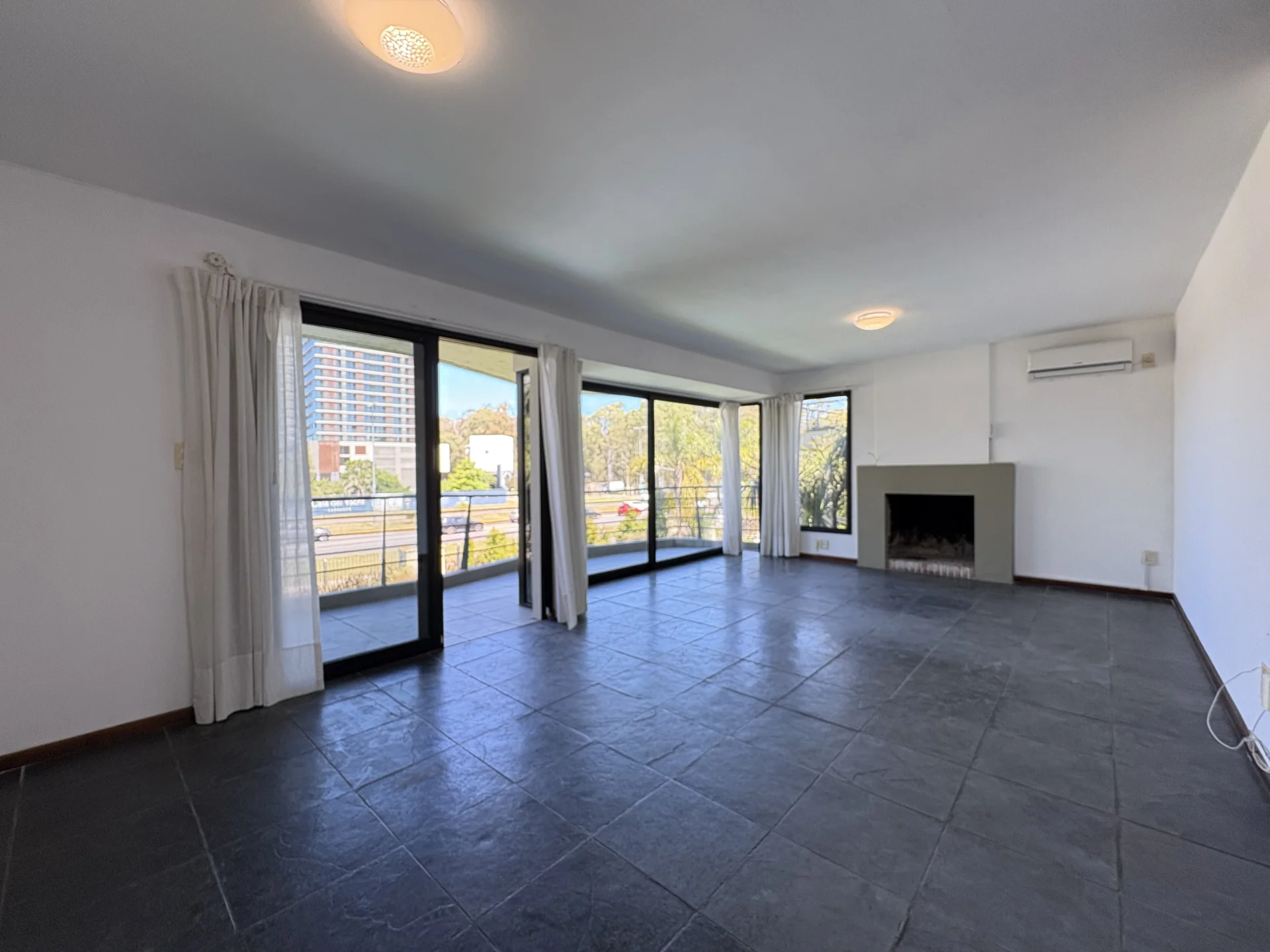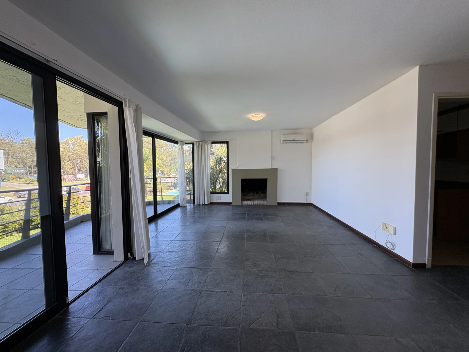 Living comedor de muy buen tamaño con estufa a leña y ventanales que dan acceso a amplia terraza con parrillero y vista al lago.