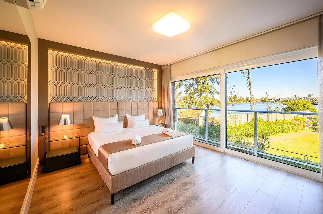 La zona íntima ofrece cuatro dormitorios en suite, todos con excelente luz natural. La master suite destaca por sus vistas al lago, su gran vestidor tipo walk-in closet y un baño de diseño sofisticado. Además, el apartamento incluye un baño social para visitas.