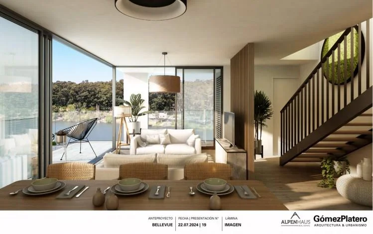 Frente al Lago Calcagno, se integra de forma armoniosa con el paisaje. El proyecto fue concebido priorizando las vistas, la orientación y el vínculo con el lago, haciendo del entorno natural el eje central de cada decisión de diseño.