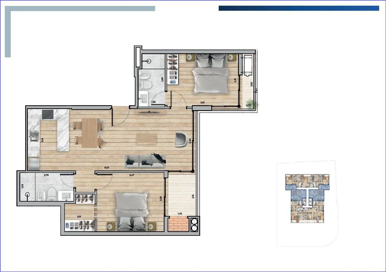 Living comedor con terraza con parrillero, cocina integrada con placares, campana, horno y anafe colocados, 2 dormitorios con placares, el principal en suite con vestidor, 2 baños completos con extractor.