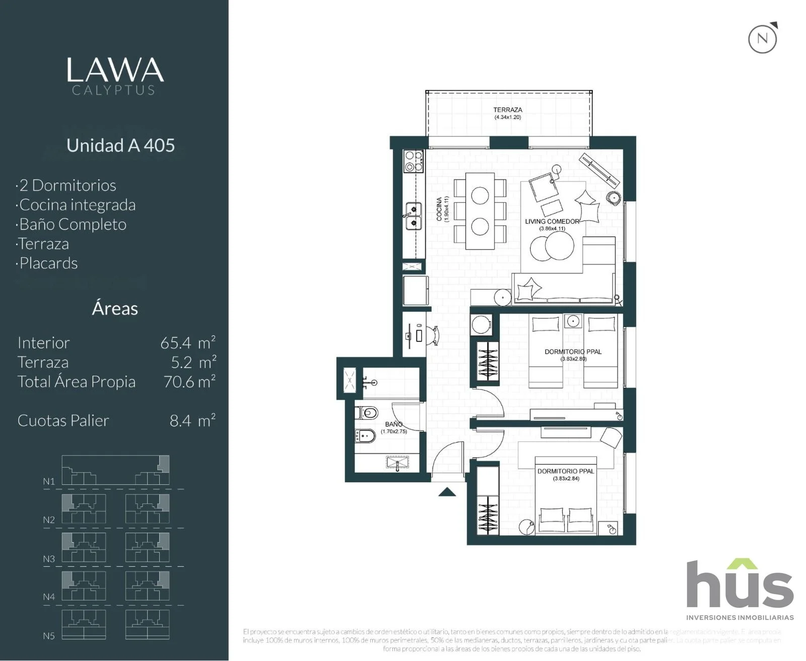 Planta 2 dormitorios, 1 baño, living-comedor ocn cocina integrada y terraza. Cuenta con vista depejada y orientado al noroeste.