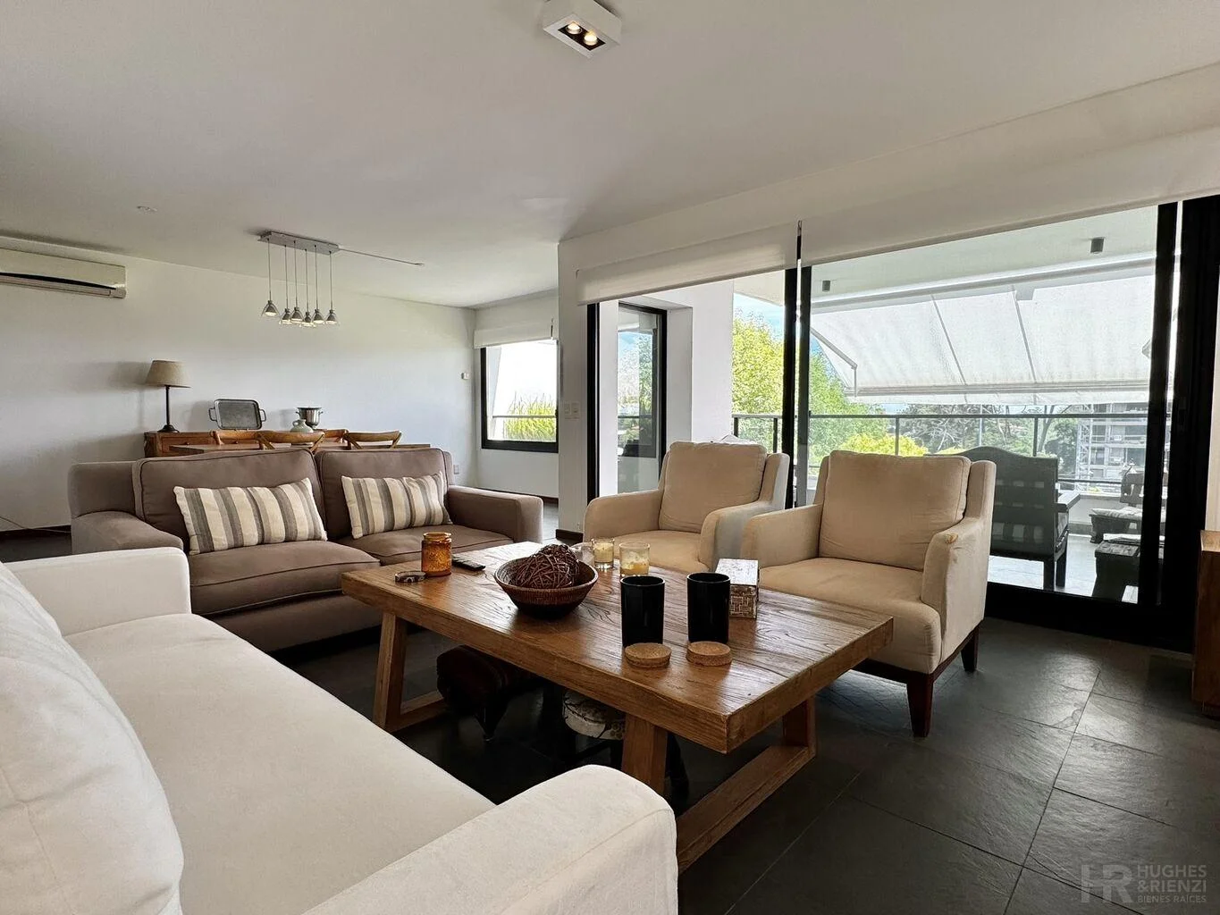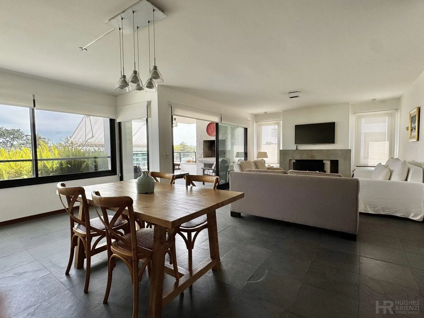Amplio living comedor con estufa a leña y salida a amplia terraza con parrillero.
