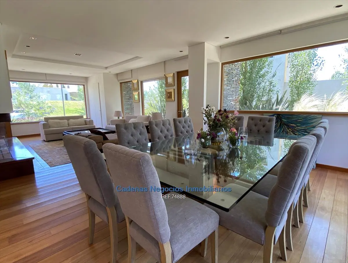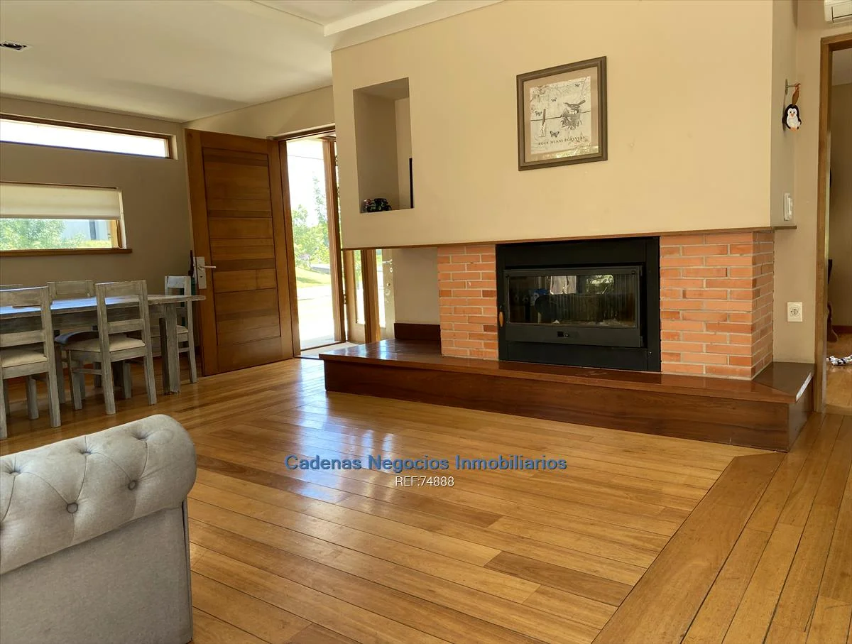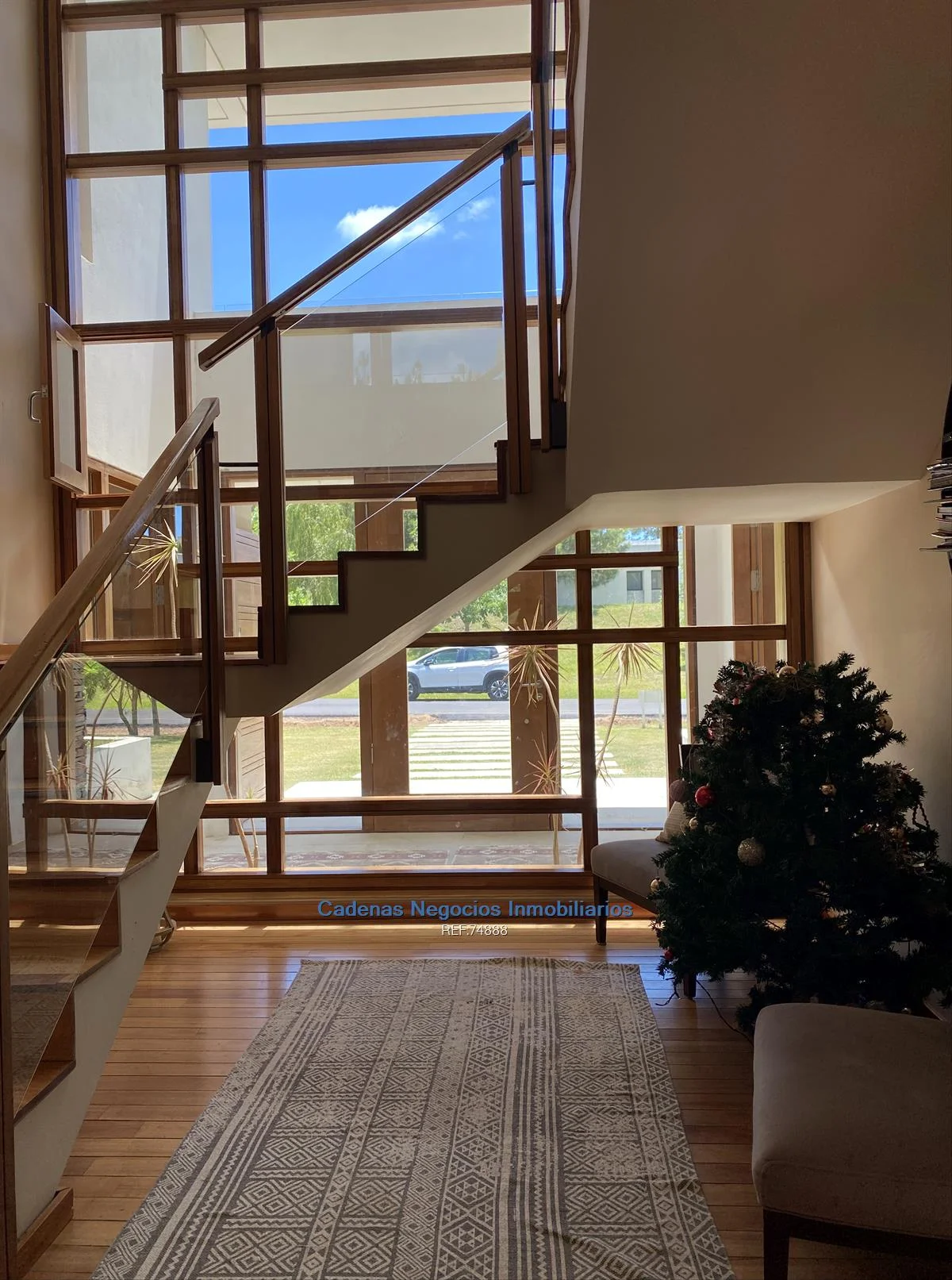 Cuenta con hall de entrada con diseño de doble altura permitiendo así mayor ingreso de luz, living comedor con estufa a leña y estar con estufa de alto rendimiento, ambos cuentan con equipos de aire acondicionado y grandes ventanales de piso a techo que se comunican al jardín. Toilette, despojador. Cocina.