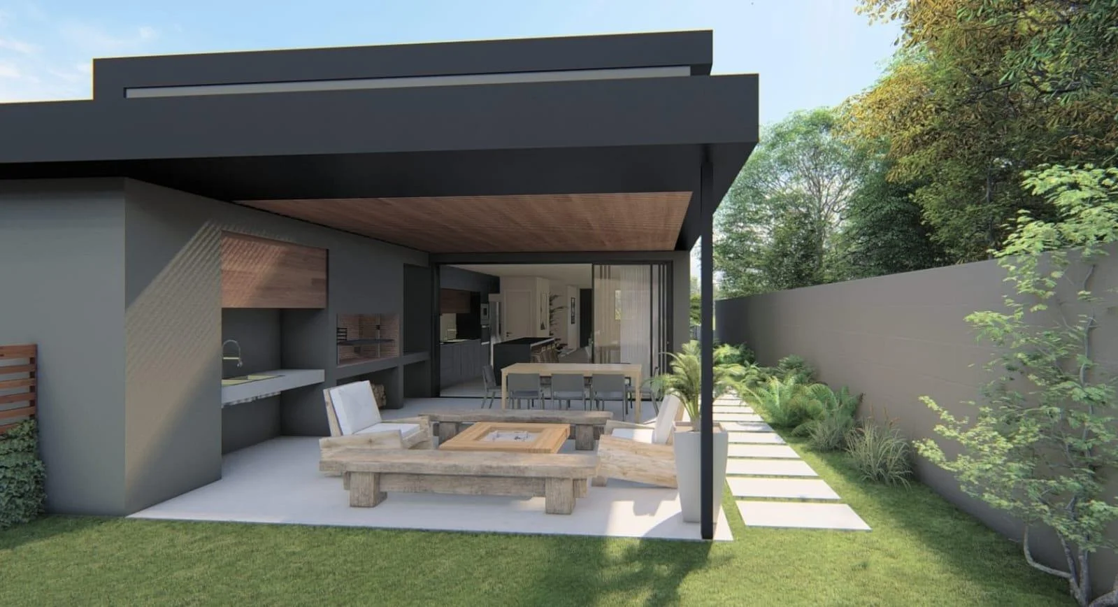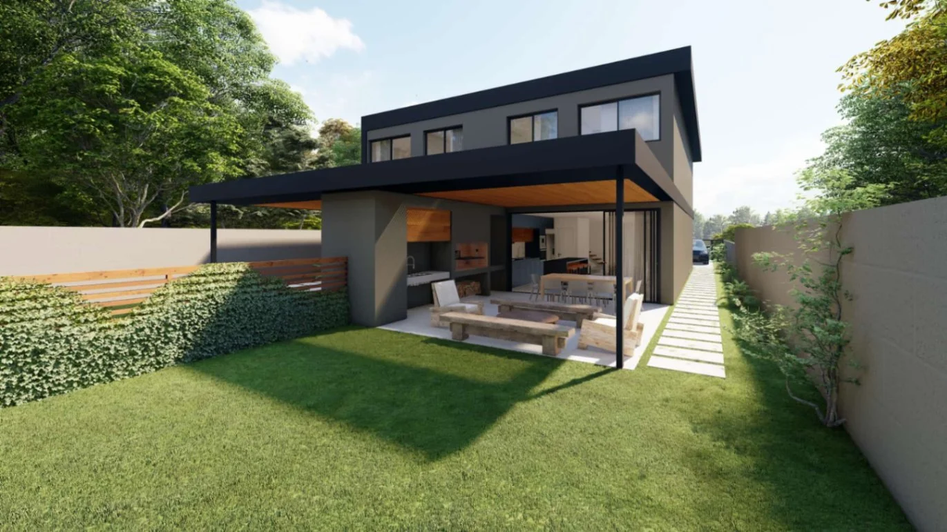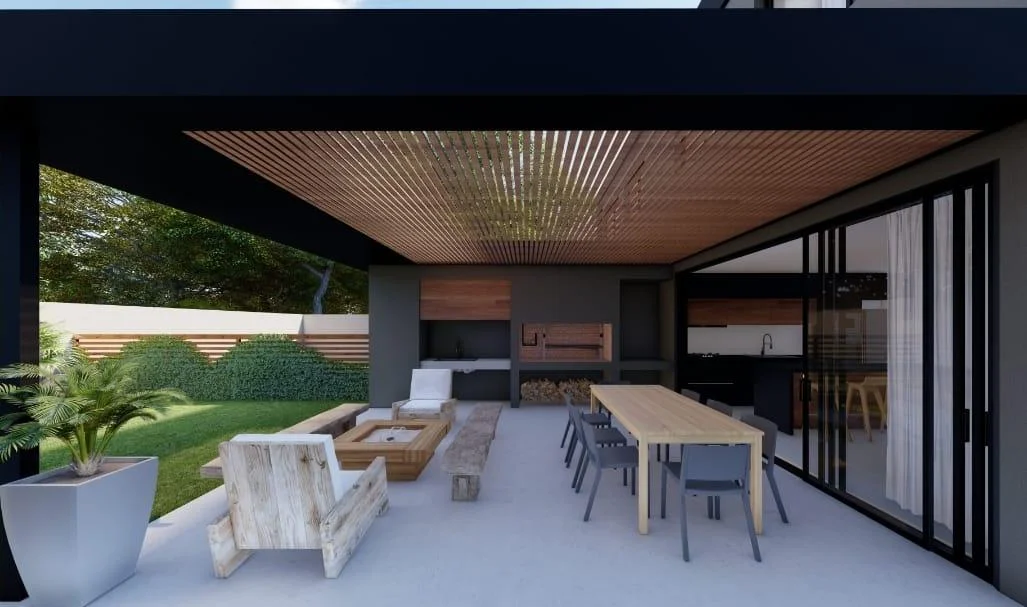 Ventanal al fondo a un porch con pérgola y parrillero con vista al fondo verde, ideal para disfrutar al aire libre e integrable al living- comedor para cómodas reuniones.