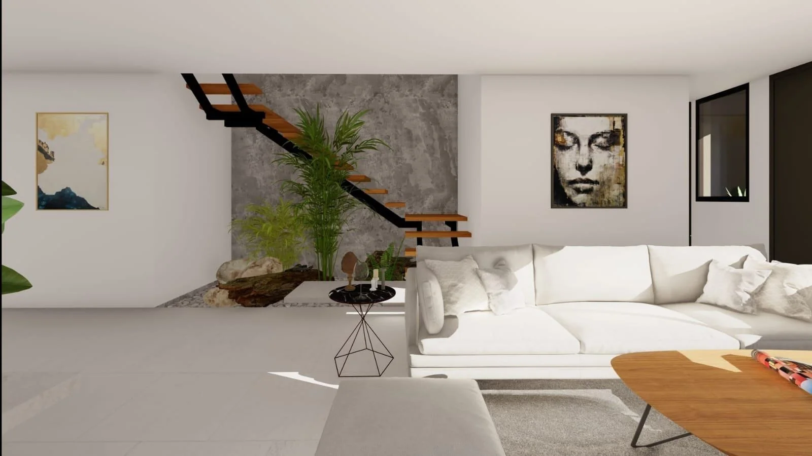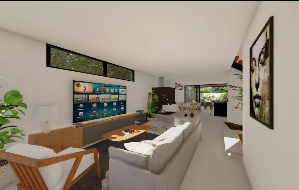 En planta baja baño social, moderna cocina con anafe, campana e isla integrándola a la sala de estar en un concepto abierto.
