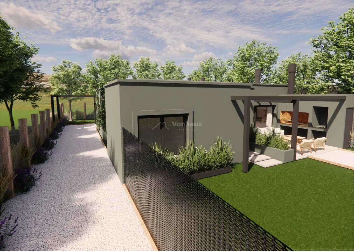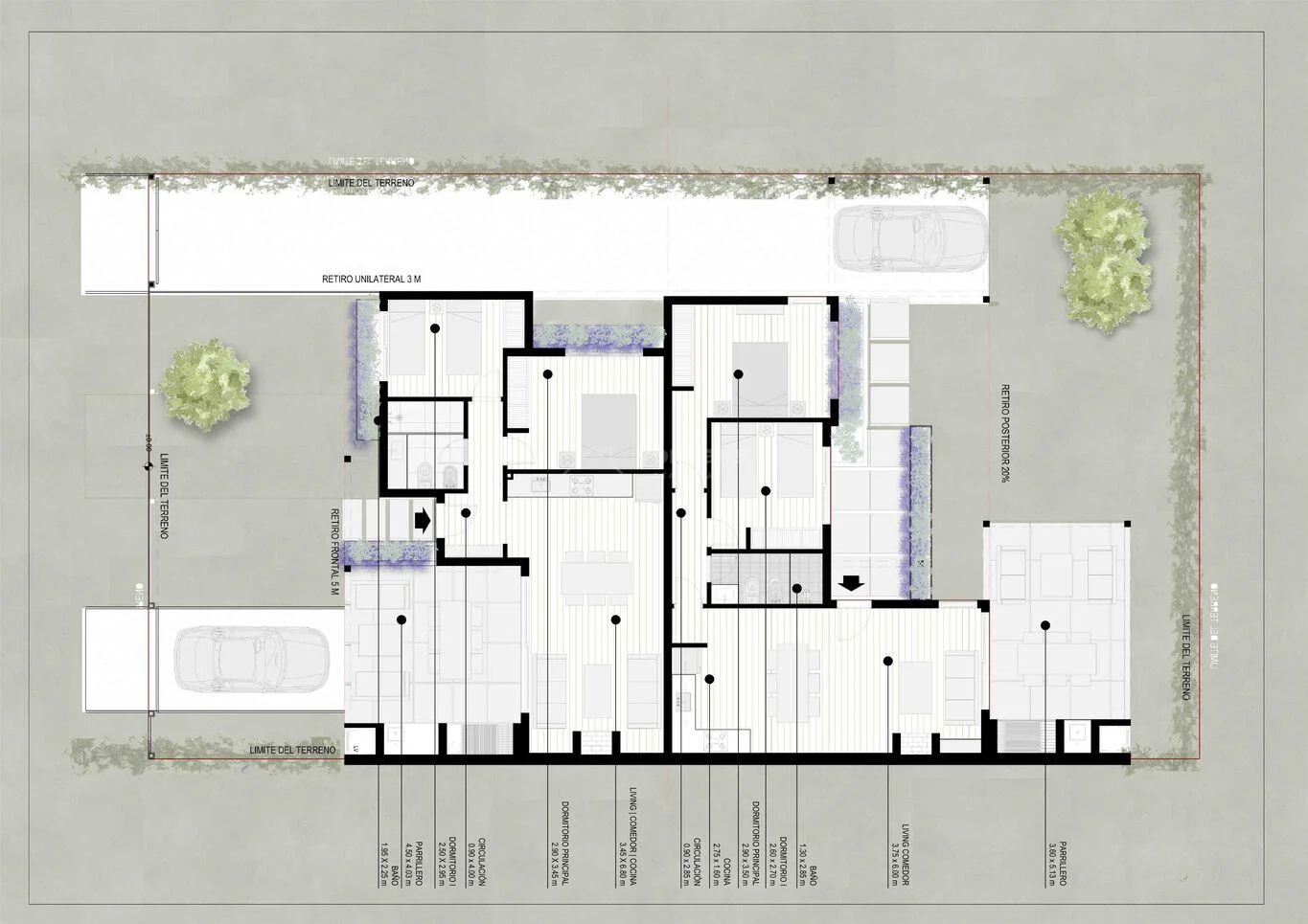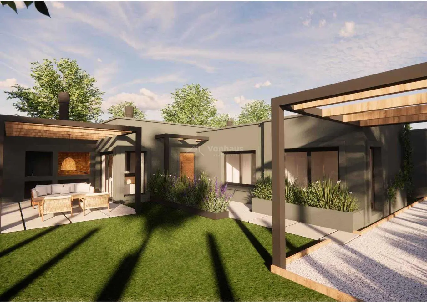 Desarrollo de 2 casas en regimen de propiedad horizontal, cada casa abarca un terreno de aproximadamente 200 m² y está desarrollada en una sola planta, con 65 m² de área cubierta