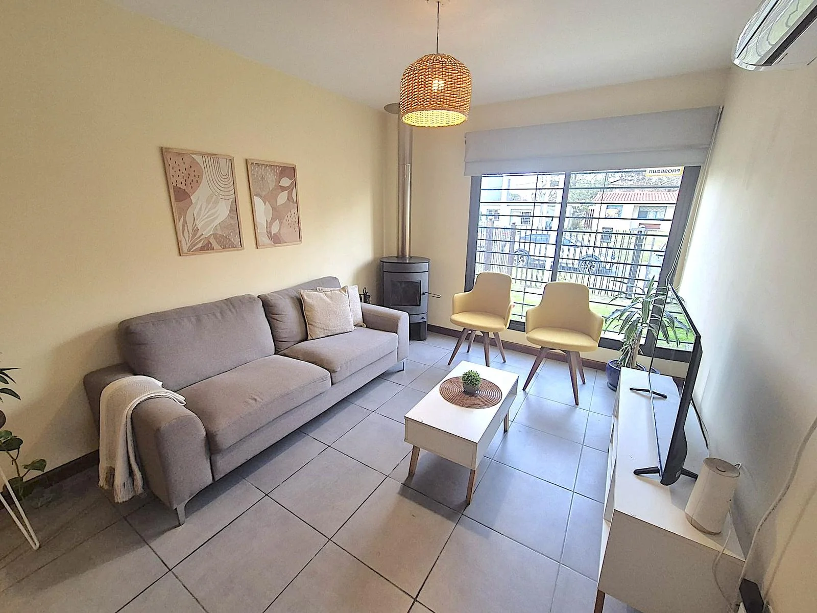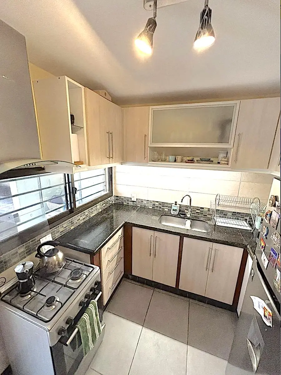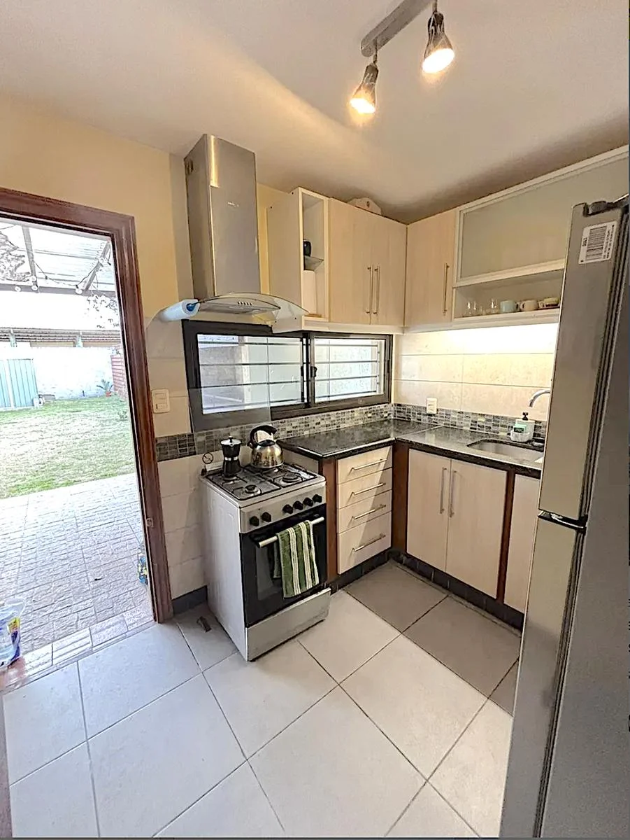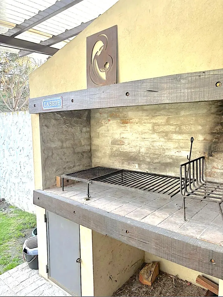 La casa cuenta con un jardín al frente con cerramiento perimetral, donde pueden estacionar dos autos. Luminoso living comedor con estufa a leña.