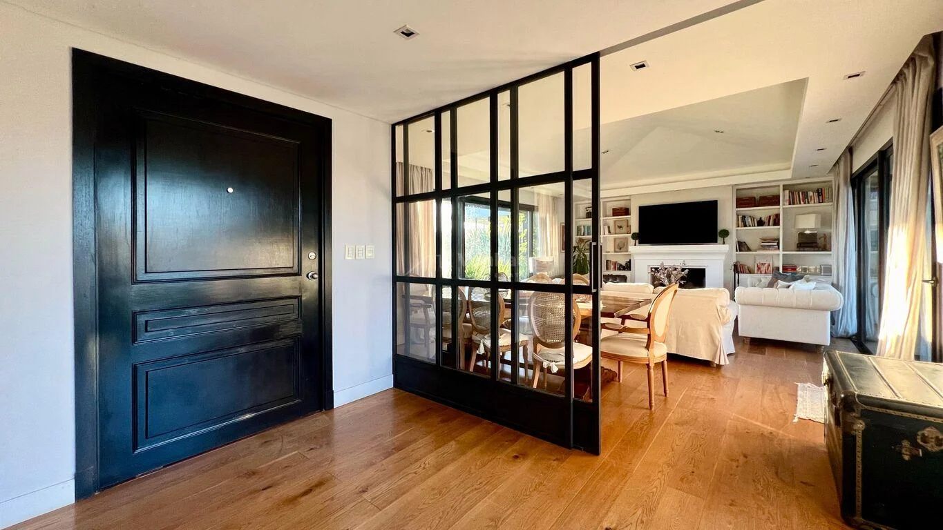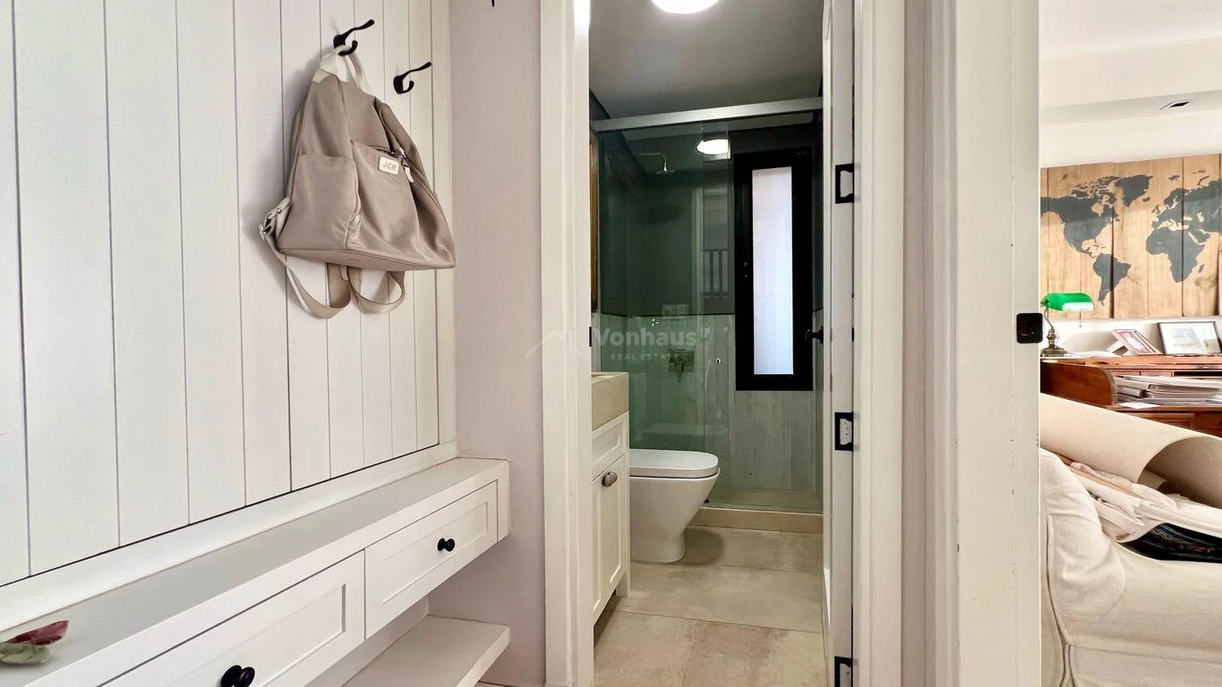 Hall de entrada con despojador y baño completo. Escritorio junto a la entrada.