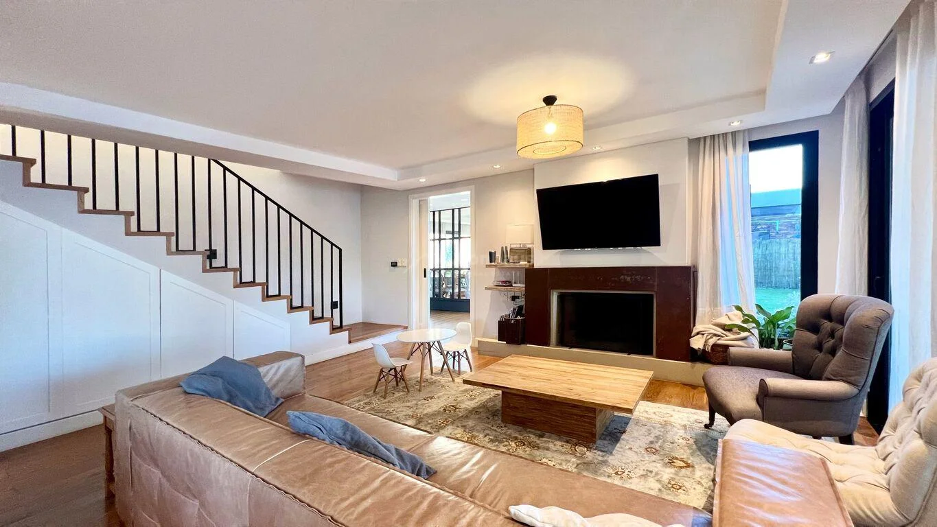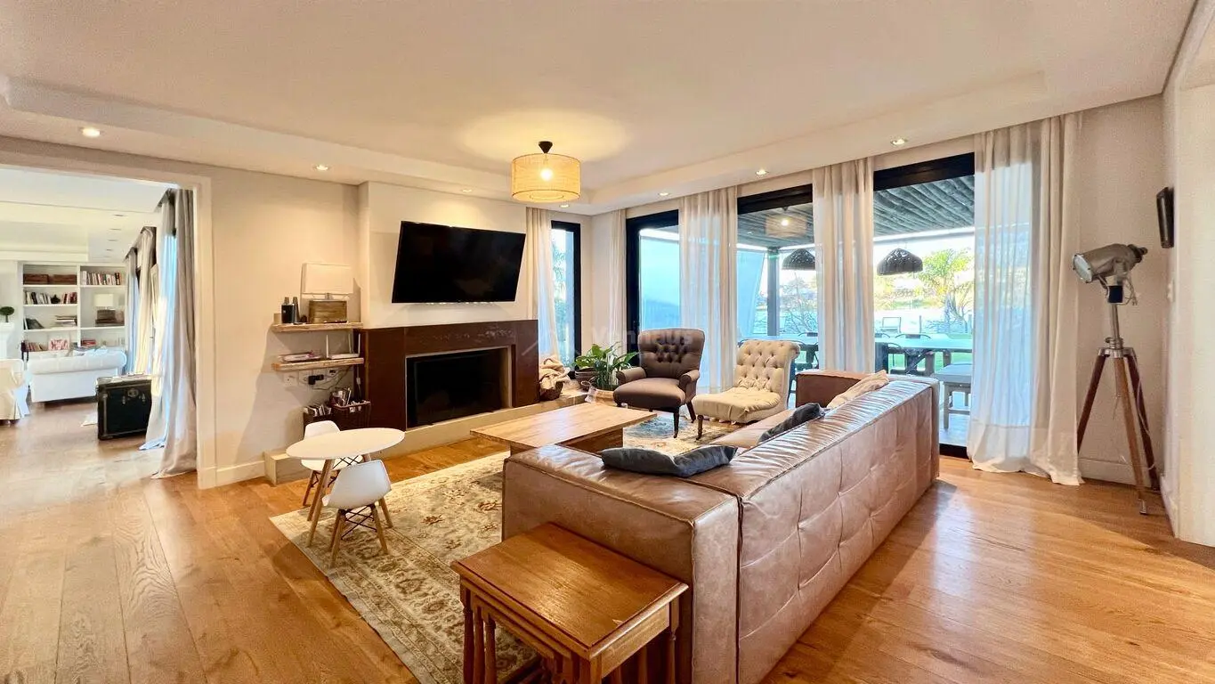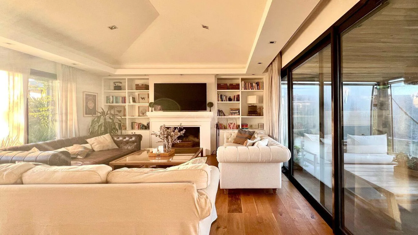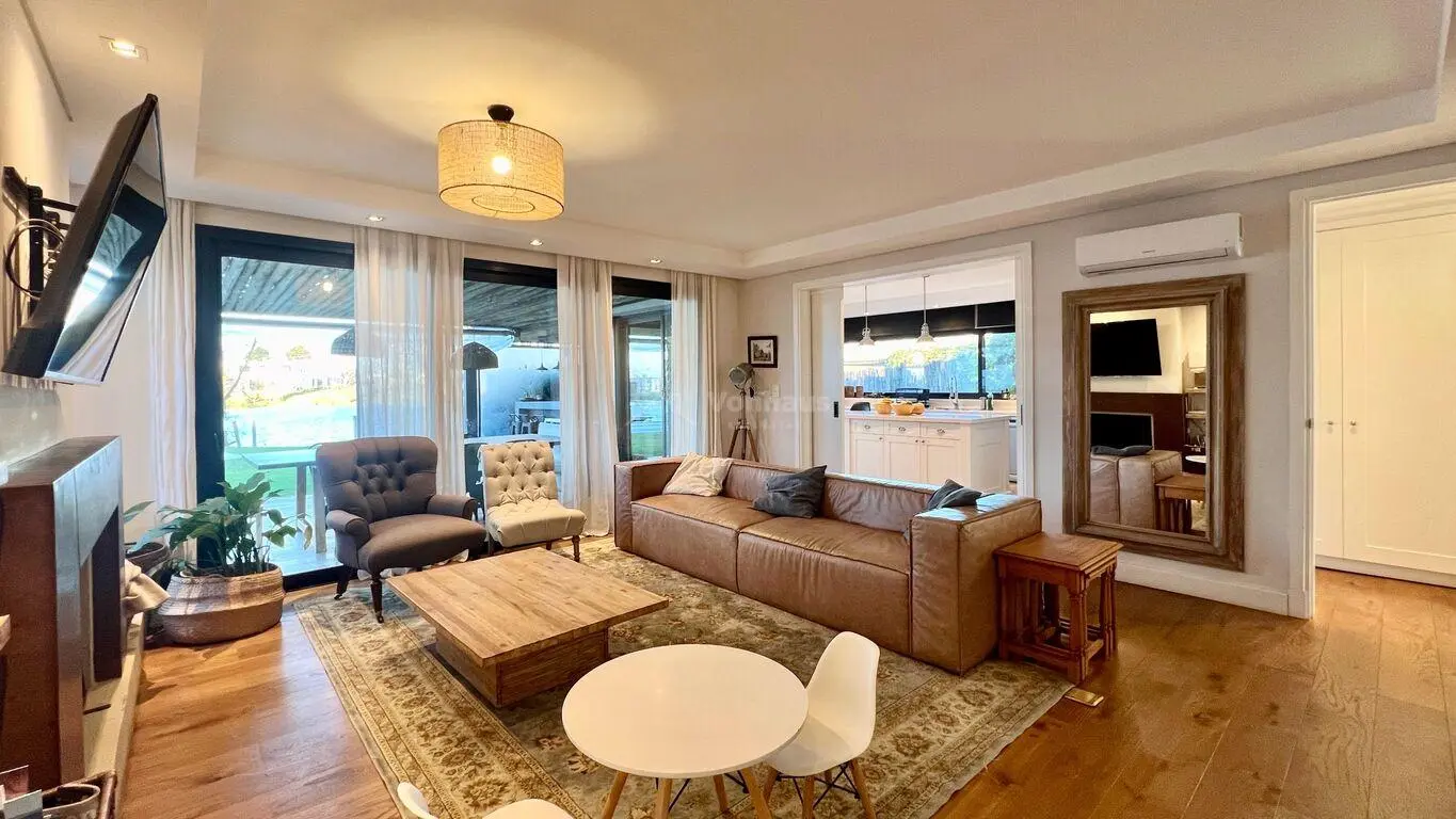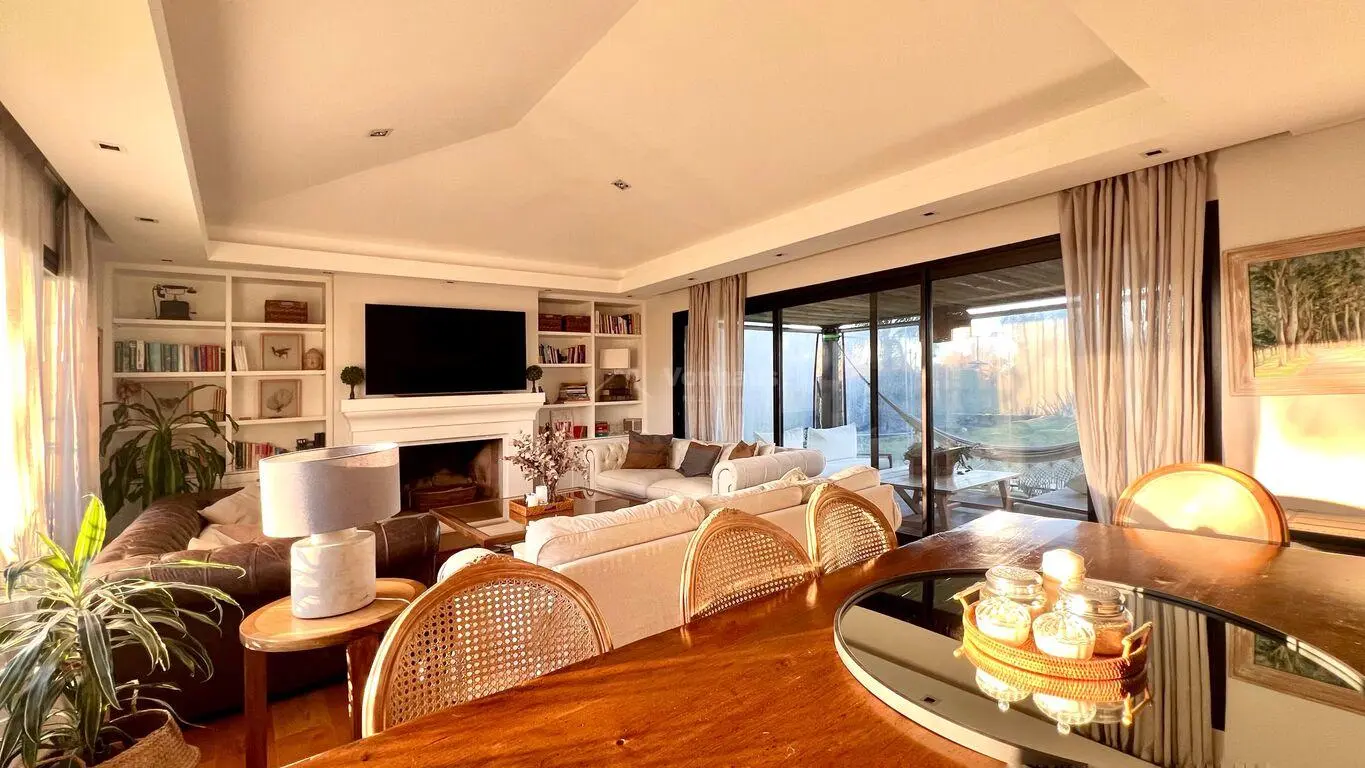 Living comedor con estufa a leña y salida a galeria techada con living exterior.