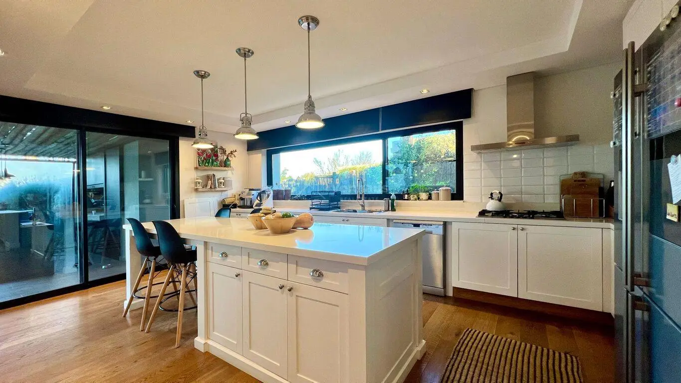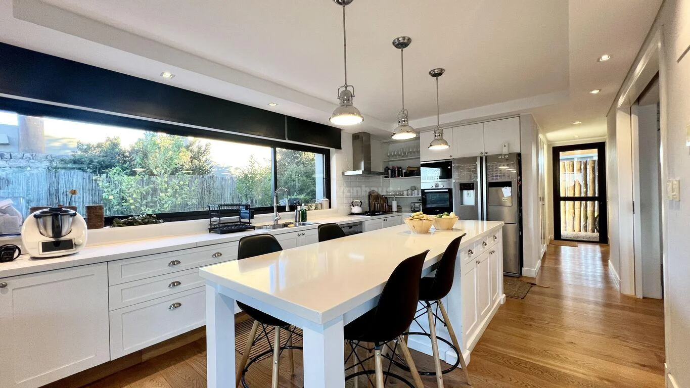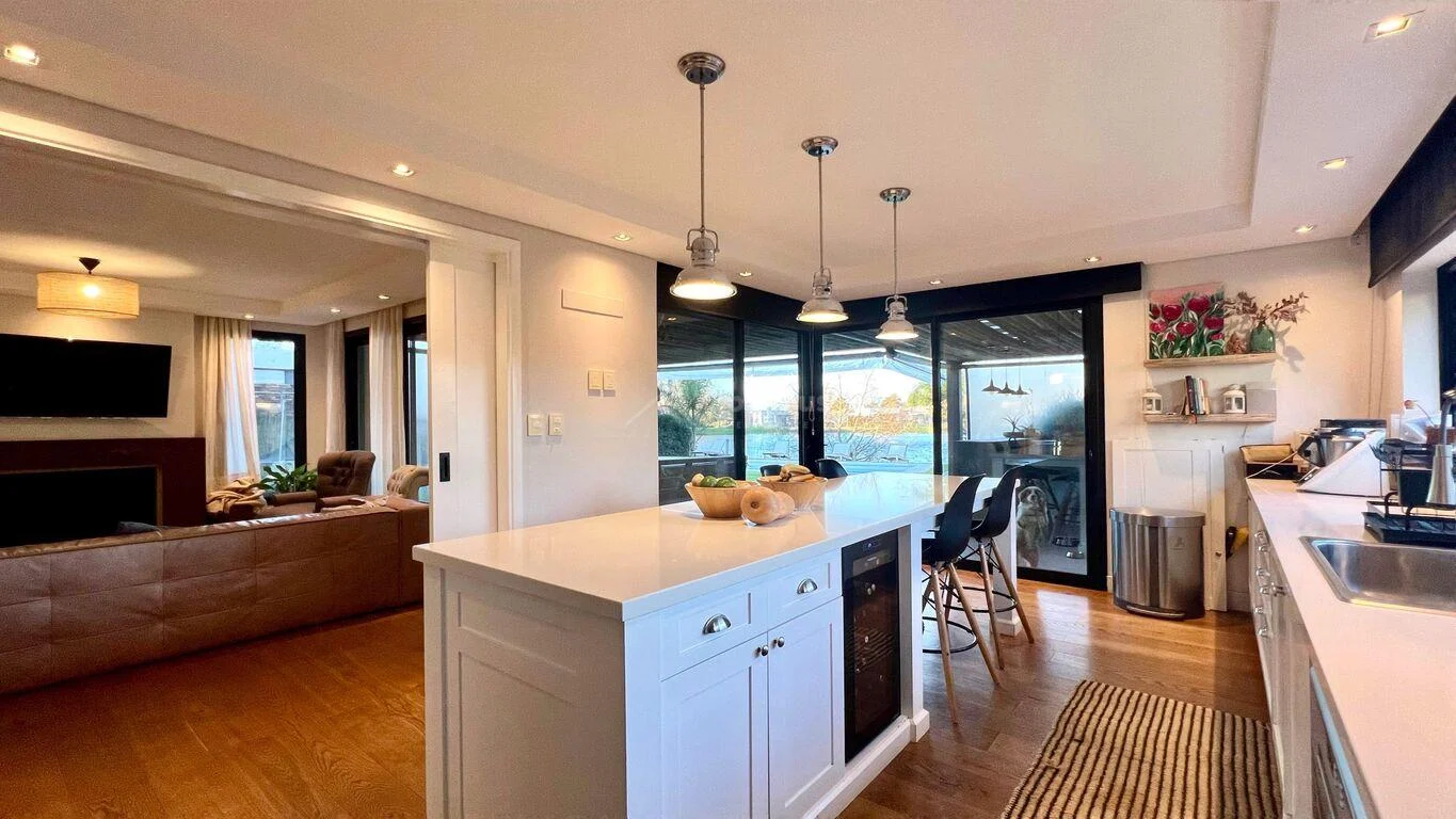 Estar diario con estufa a leña de buen tamaño integrado por puertas corrredizas a gran cocina con isla.