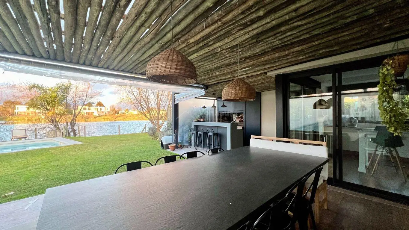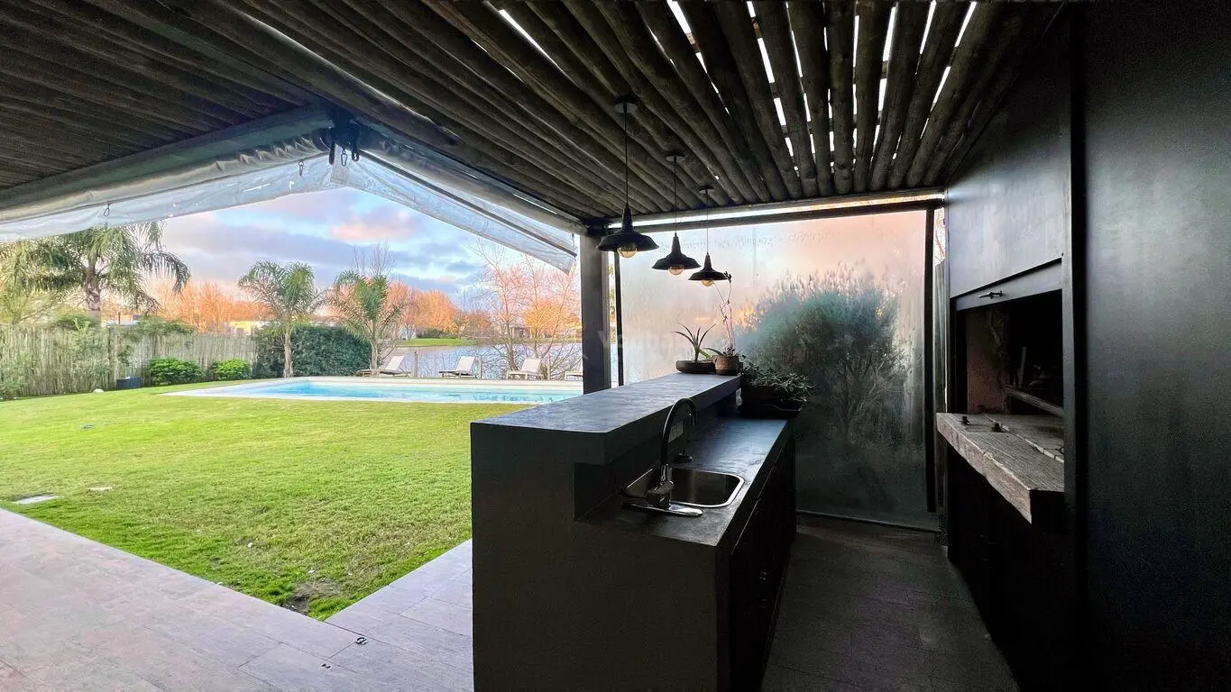 Pergola techada con parrillero, barra y baño exterior. Cerramiento en laterales de PVC.