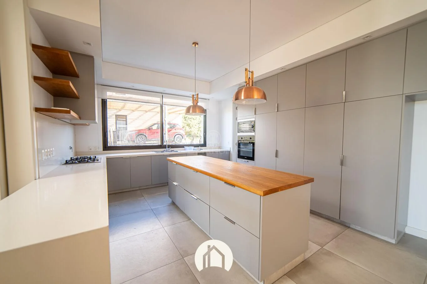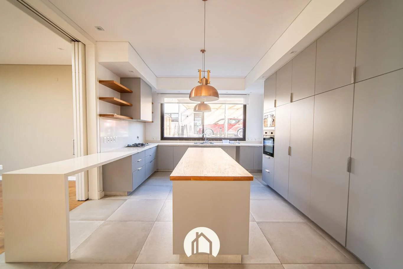 • Cocina de gran tamaño con isla, anafe, horno y microondas empotrados.